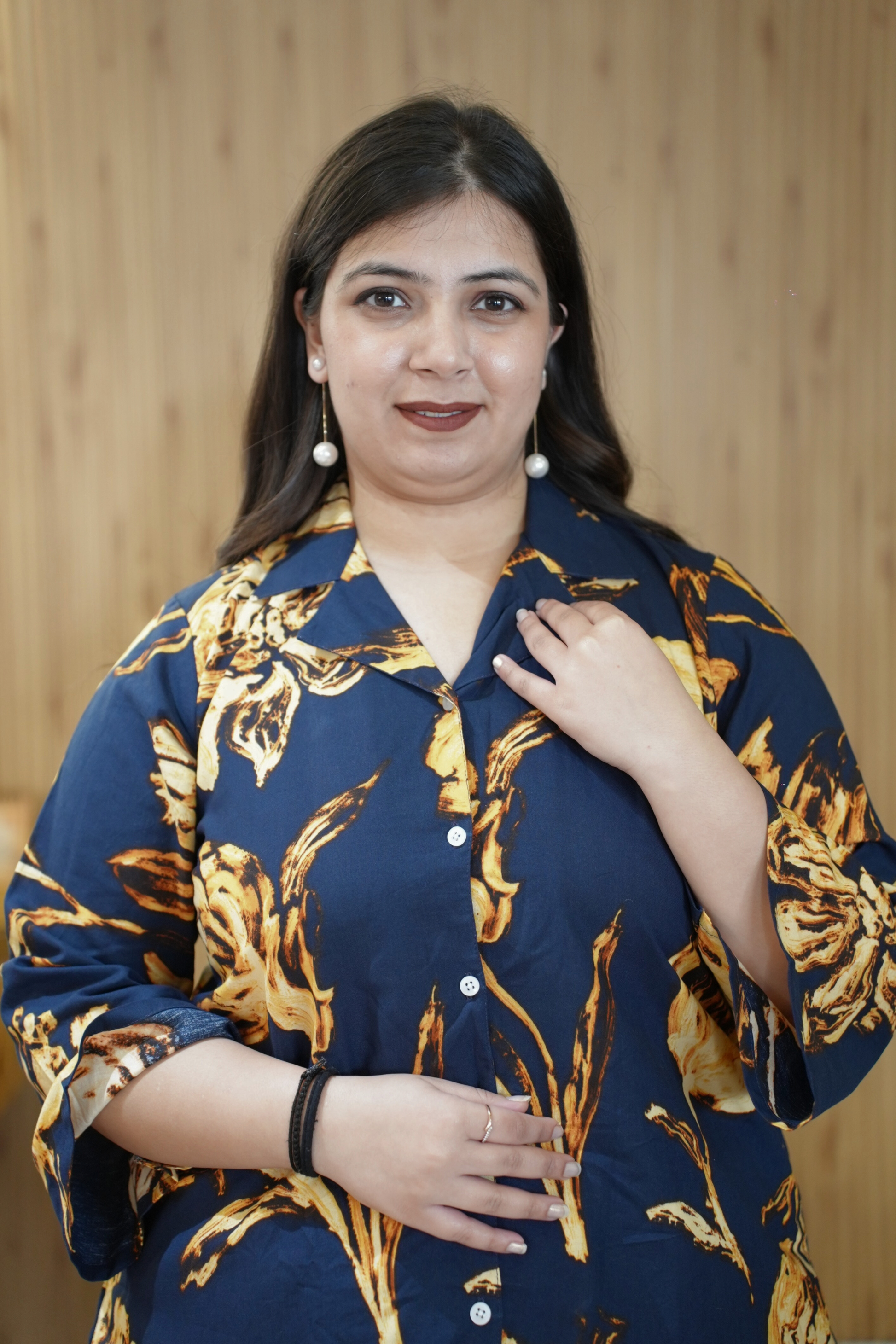 - Notched collared neckline with front button placket
