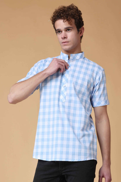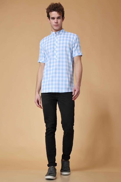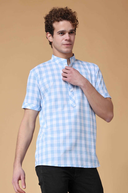 For the days that call for relaxing and chilling out with the ones that matter, this short kurta will come in handy. The soothing Sky Blue color and the breathable fabric makes this Kurta a must have for every wardrobe. This perfectly tailored Kurta has a regular fit, half sleeves & mandarin neck.