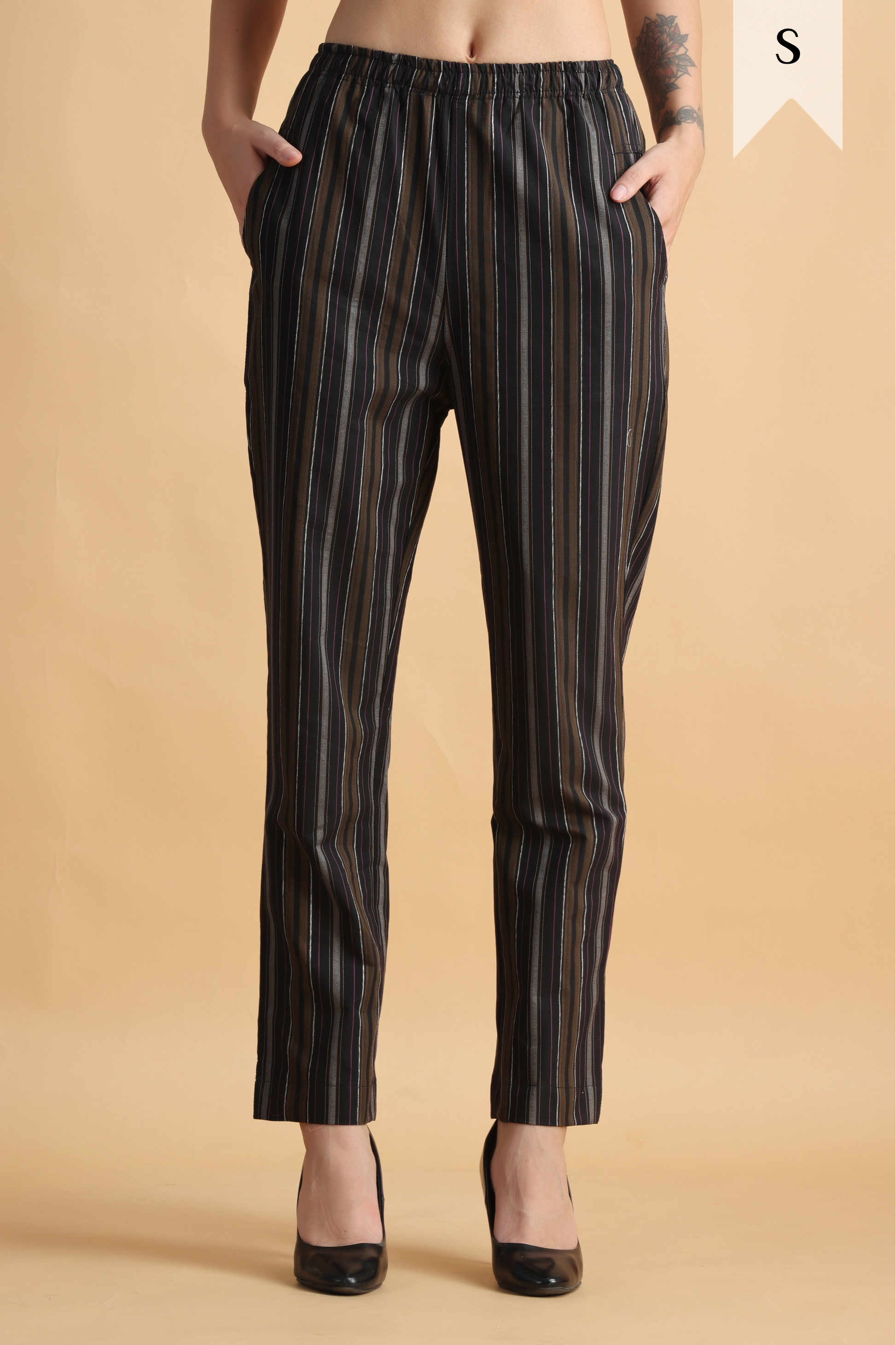 Showcasing fine attention to detail, these graceful pants are accented in Multi stripes all over. The elasticized waist and deep pockets on both sides add to the comfort quotient. Made with Cotton fabric, these pants feature a regular fit & elasticized waistband for unmatched comfort. Team them with a printed kurta, dangling earrings, and a pair of flats.