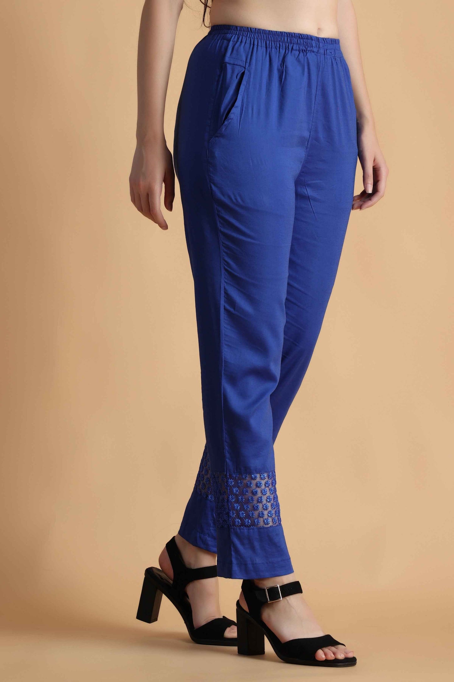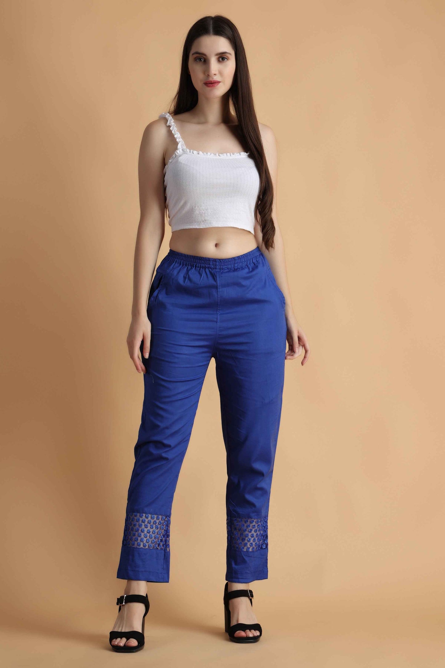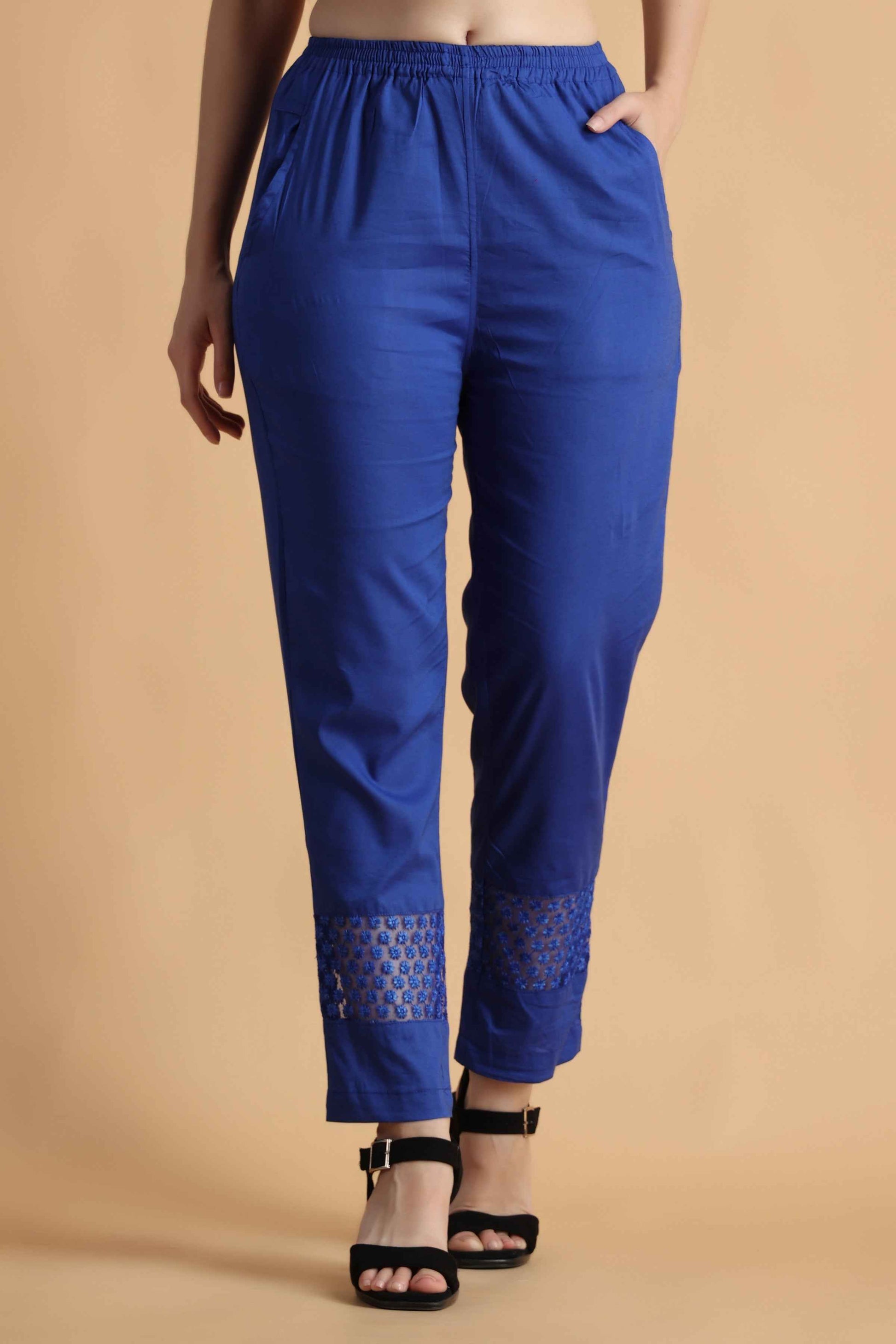 Showcasing fine attention to detail, these graceful pants are accented in a vibrant Blue color. The elasticized waist and deep pockets on both sides add to the comfort quotient. Lace detailing on the hem accentuates the charm. Made with Cotton, these pants feature a regular fit & elasticized waistband for unmatched comfort. Team them with a printed kurta, dangling earrings, and a pair of flats.