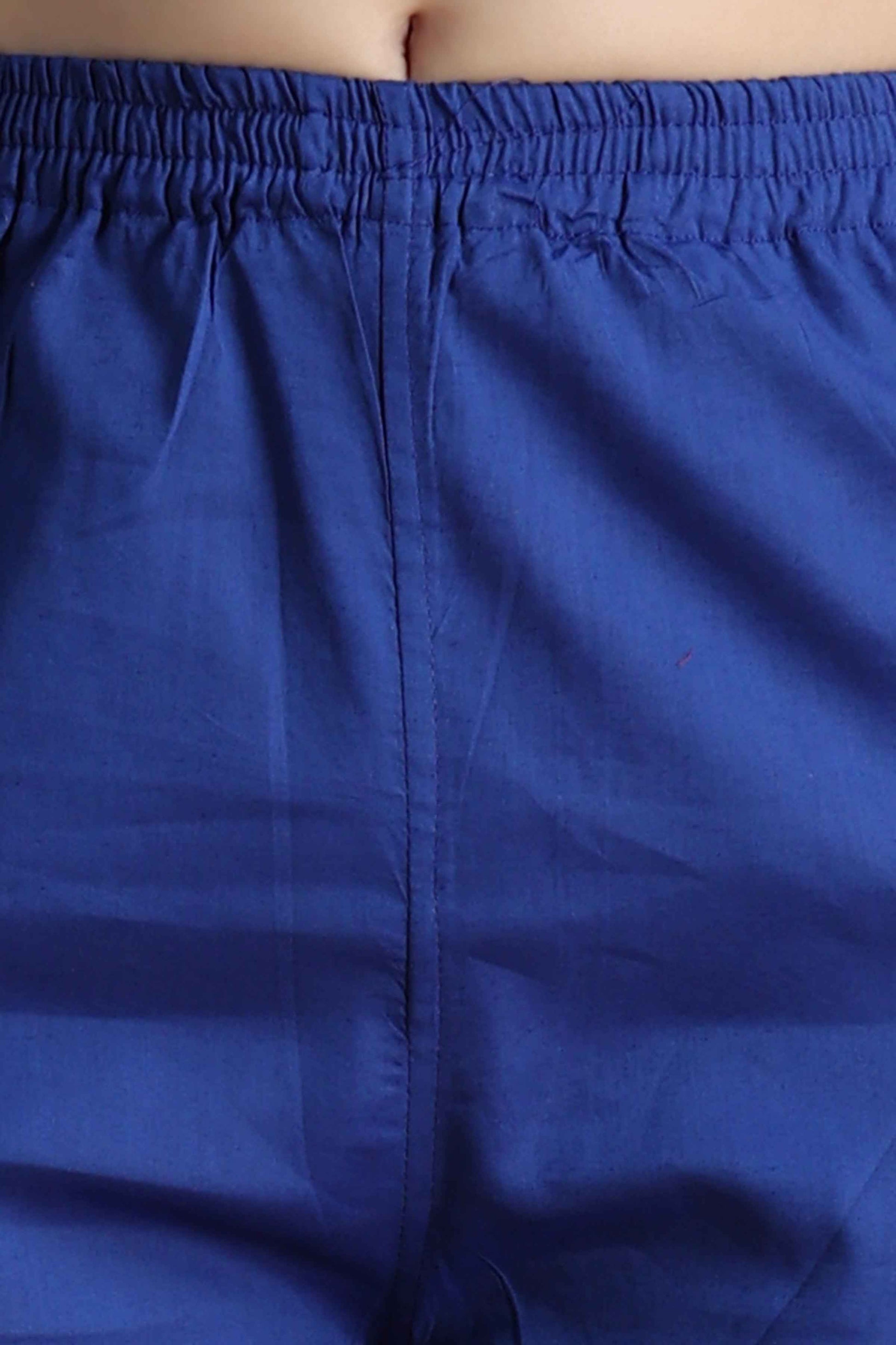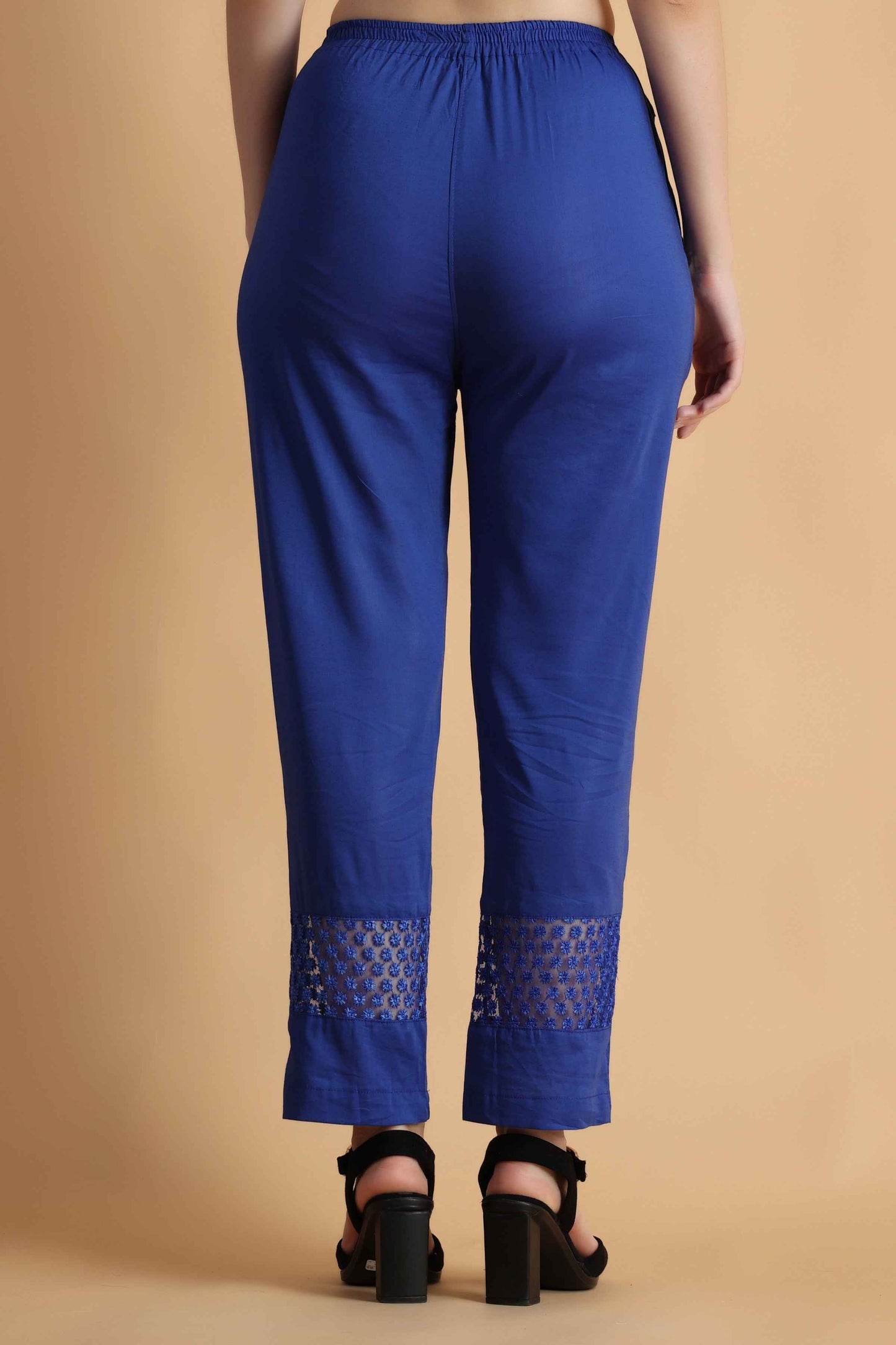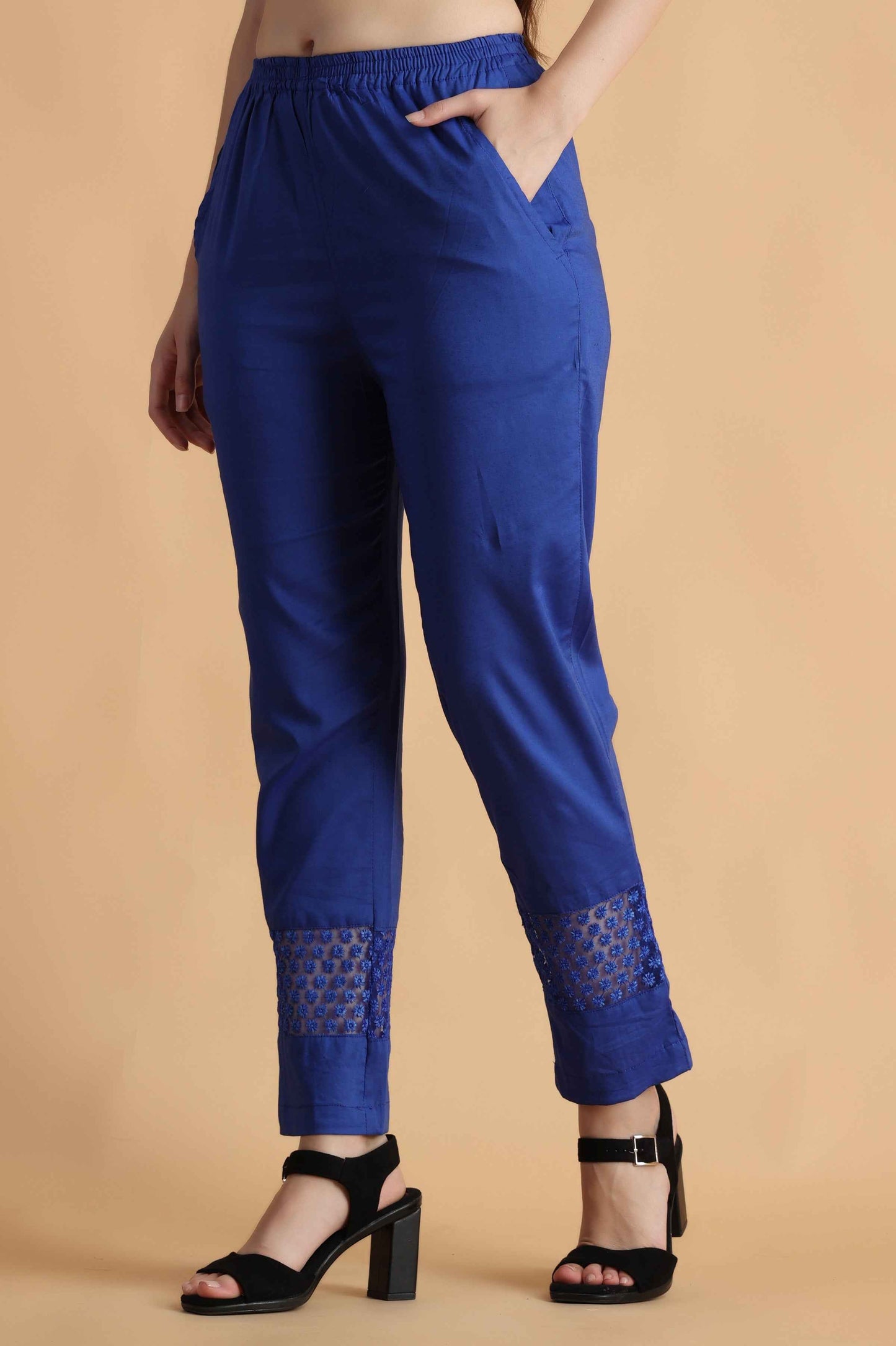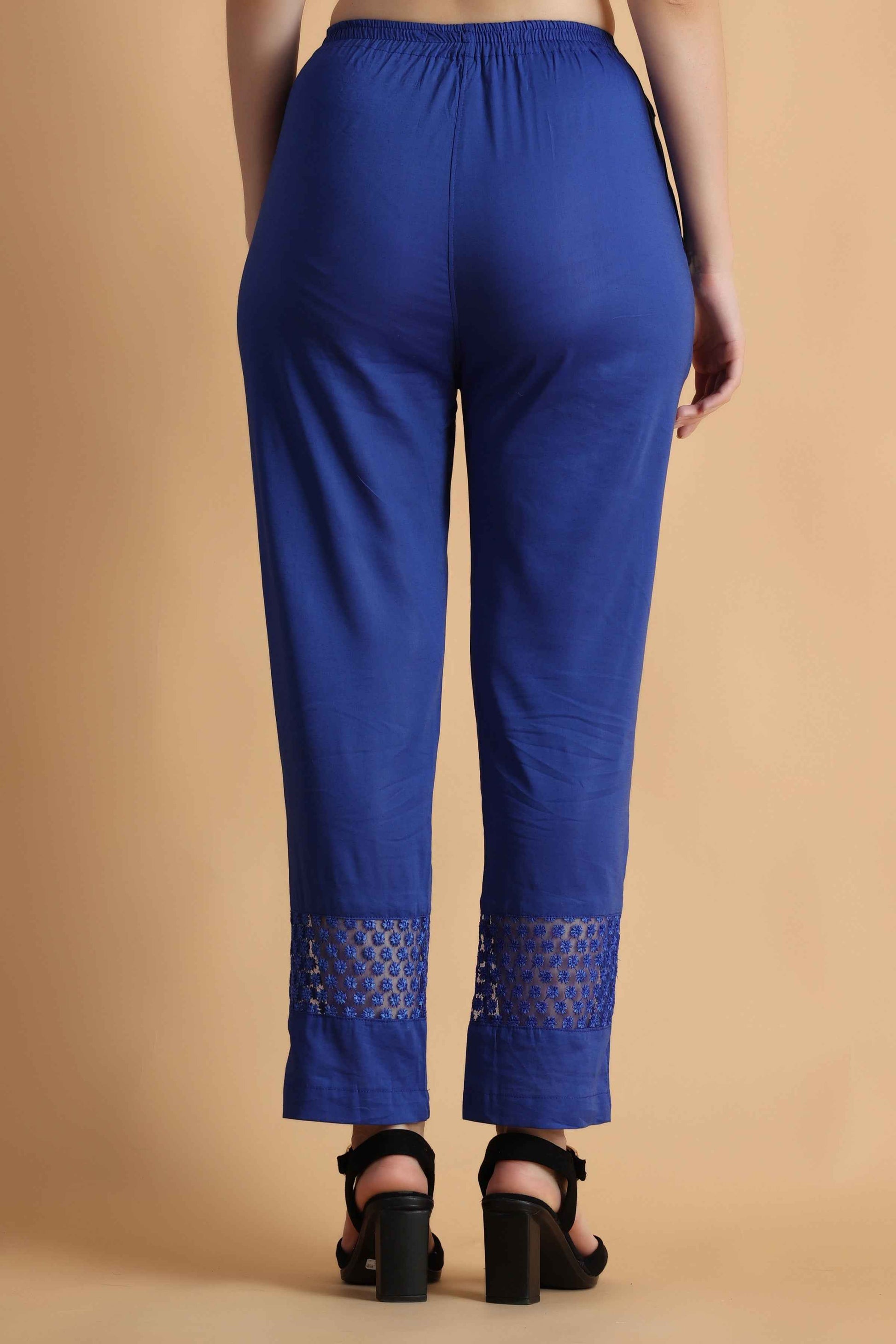 Showcasing fine attention to detail, these graceful pants are accented in a vibrant Blue color. The elasticized waist and deep pockets on both sides add to the comfort quotient. Lace detailing on the hem accentuates the charm. Made with Cotton, these pants feature a regular fit & elasticized waistband for unmatched comfort. Team them with a printed kurta, dangling earrings, and a pair of flats.