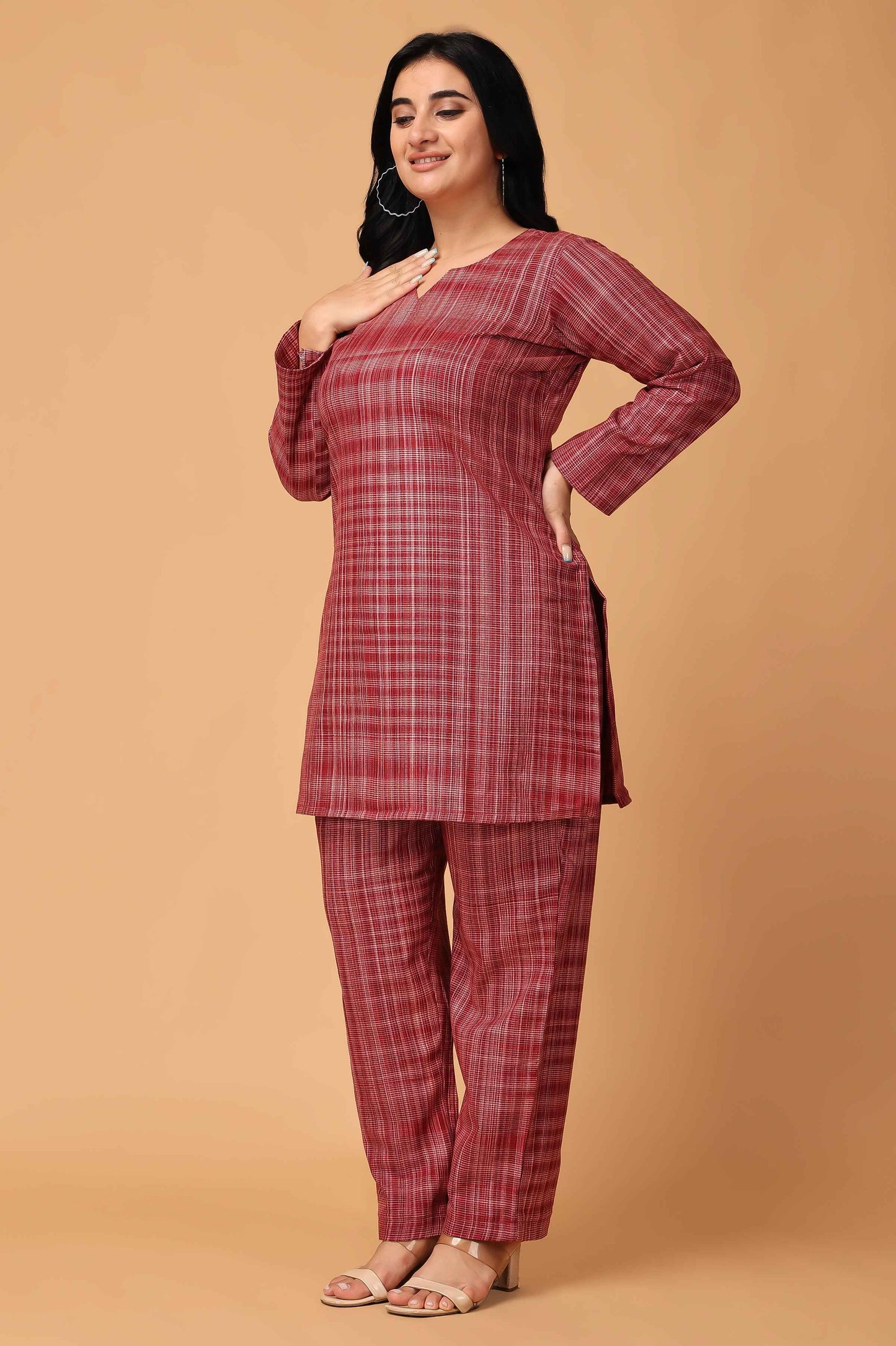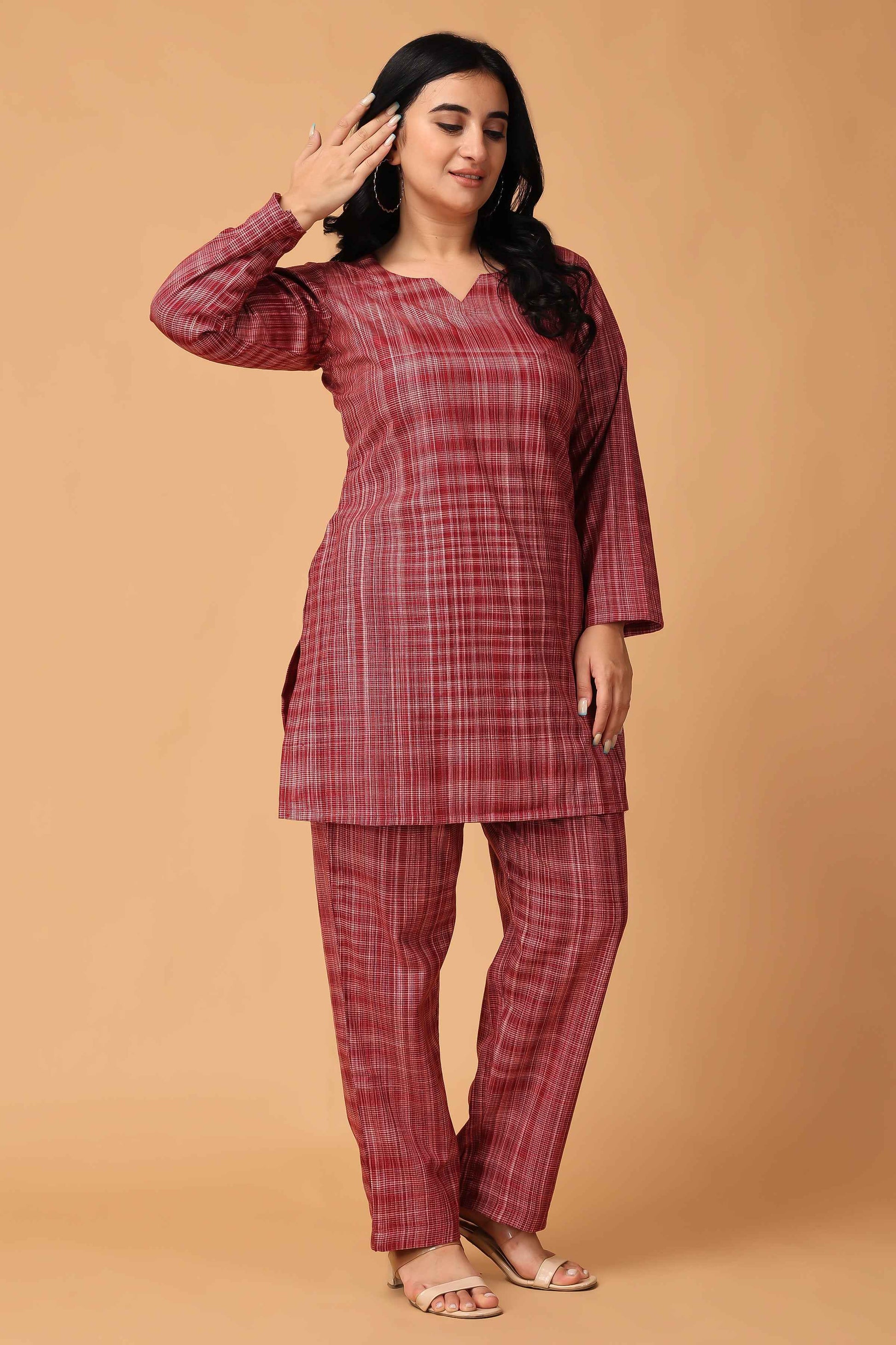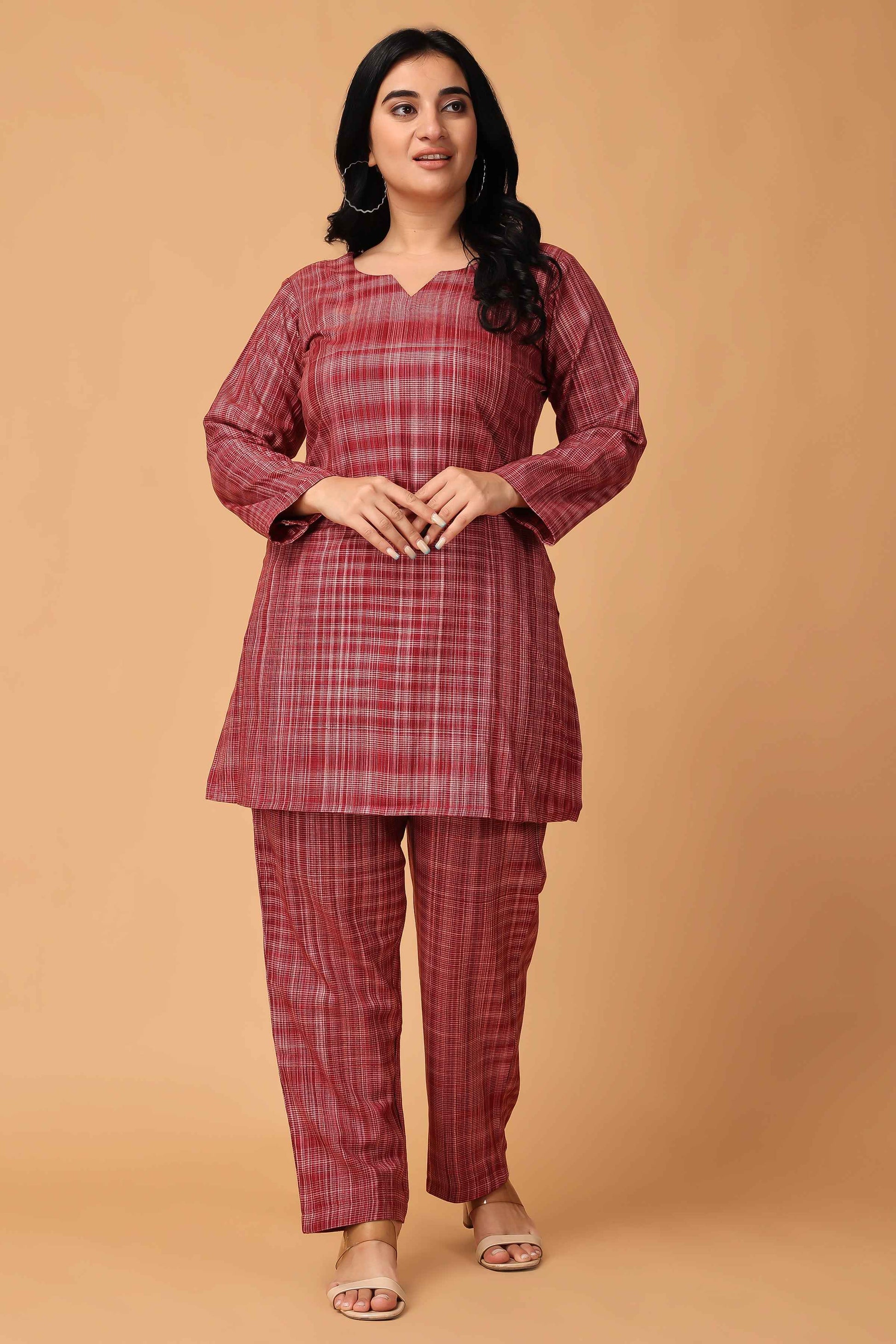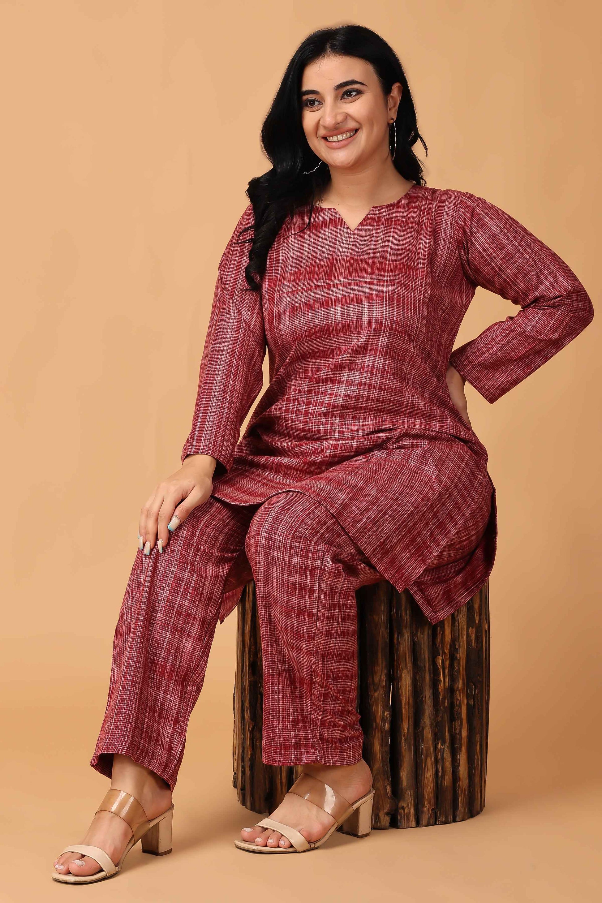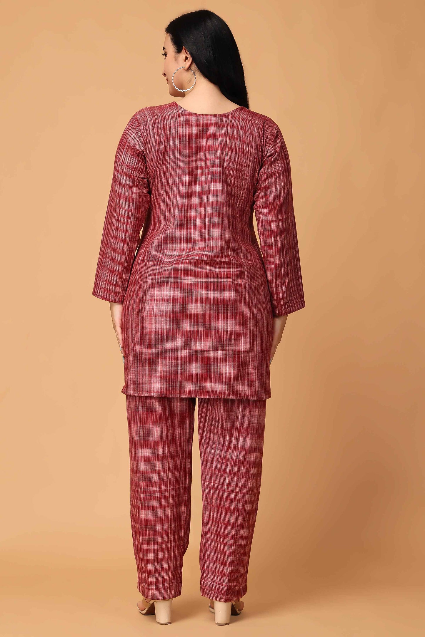 Introducing our light Burgundy Woollen Co-ord Set, a perfect blend of style and warmth for the winter season. Crafted from the plush comfort of Cashmilon fabric, this set features a captivating all-over texture, adding a touch of elegance to the fresh color. The sweetheart neckline exudes sophistication, and with full sleeves, it ensures both warmth and style. Pair it with matching bottoms for a coordinated and chic ensemble.