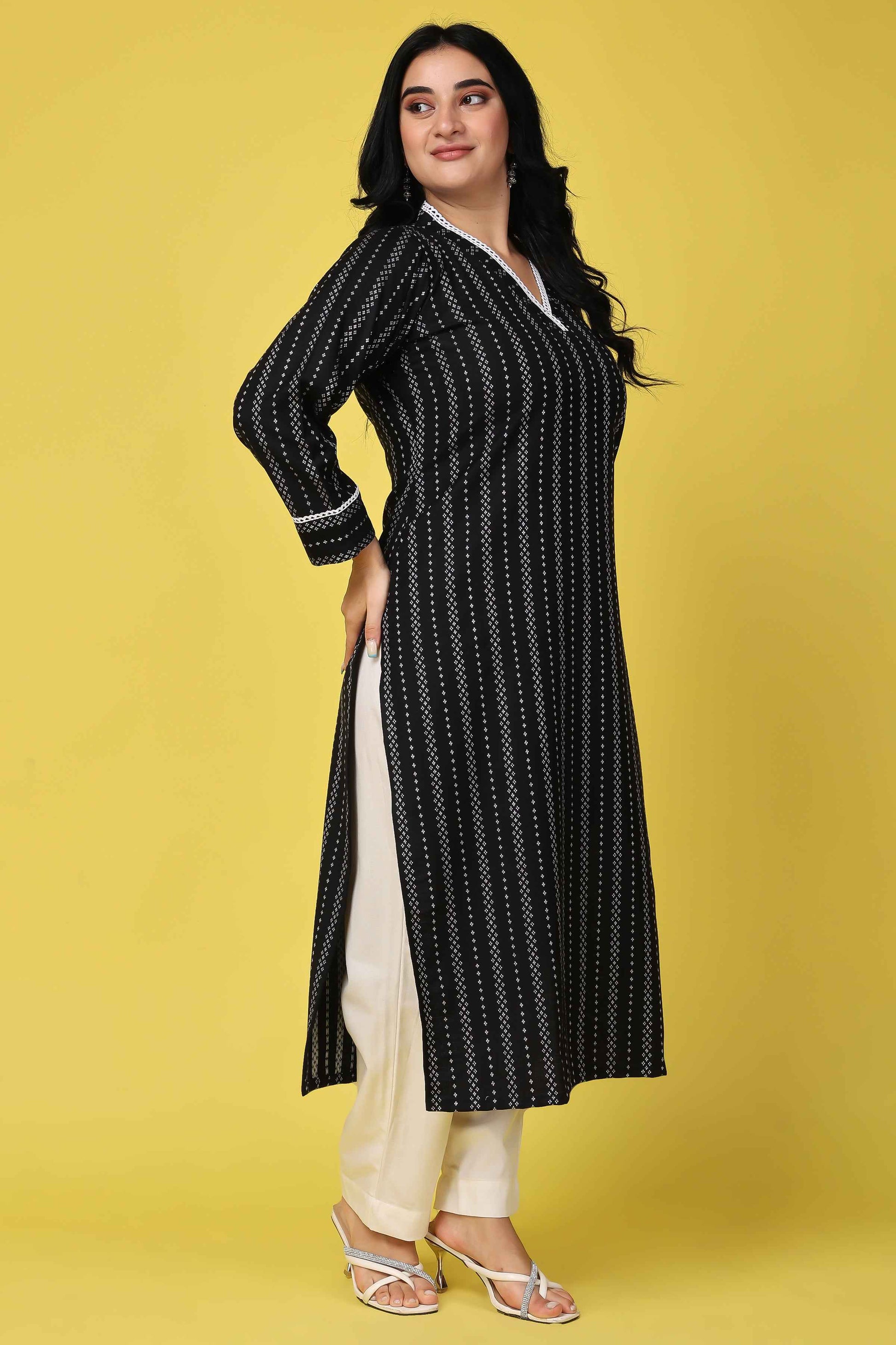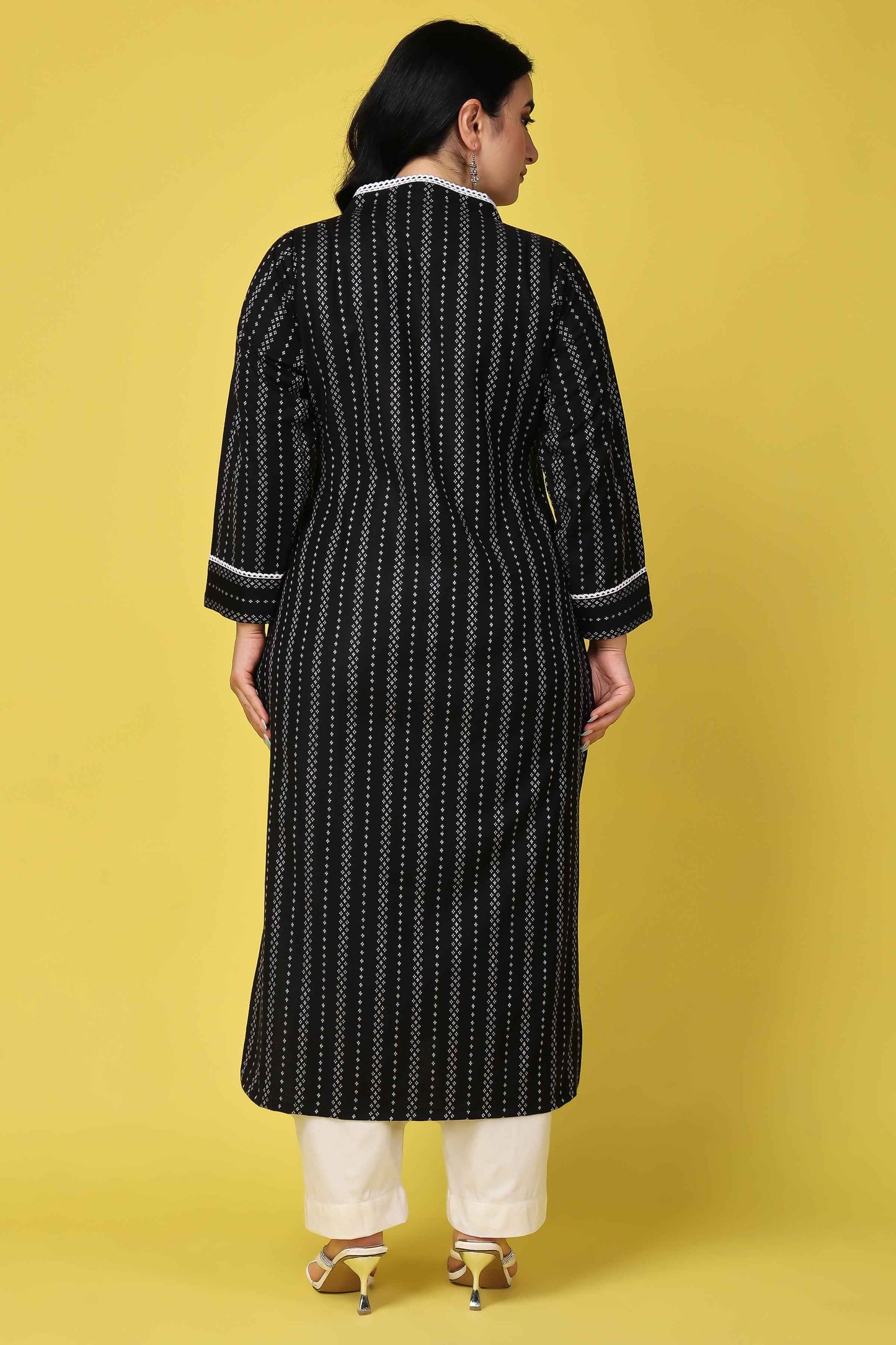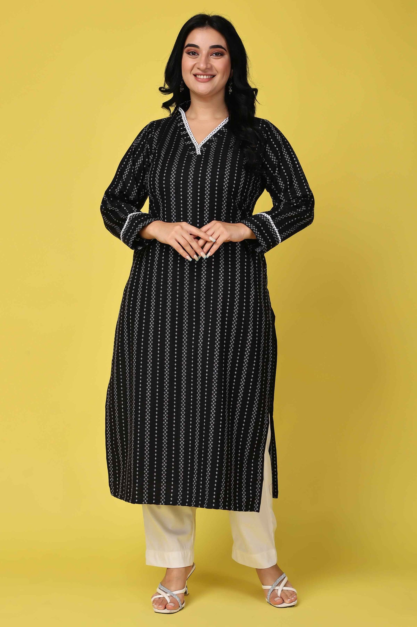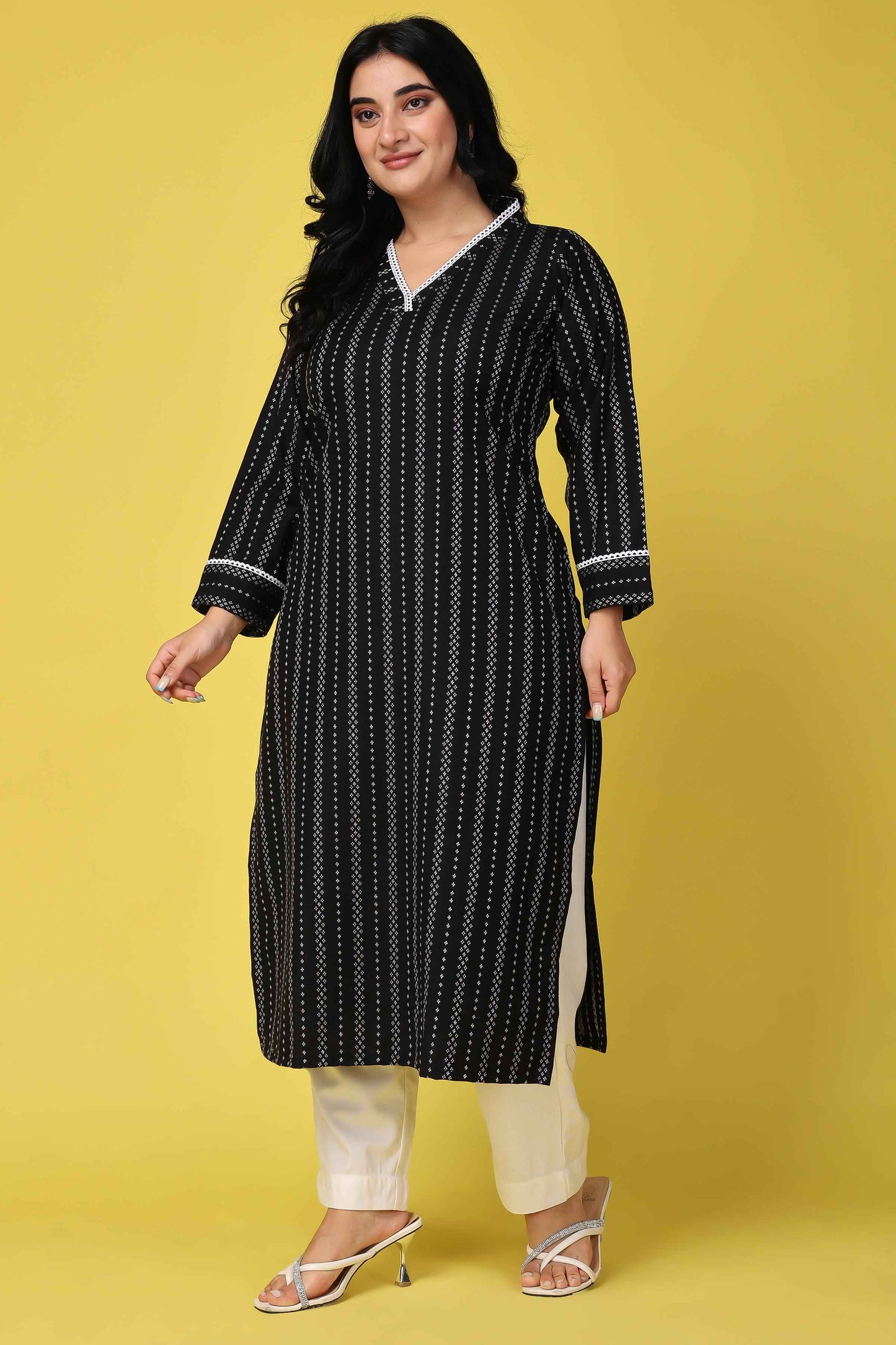 Embrace the winter season in style with our Black Striped Woollen Kurta. Crafted from the comfort of Cashmilon fabric, it features an elegant stripe all over, a flattering V-neckline adorned with lace border, and cozy full sleeves. Pair it with White bottoms for a timeless and sophisticated look. Stay warm and fashion-forward in this chic ensemble.