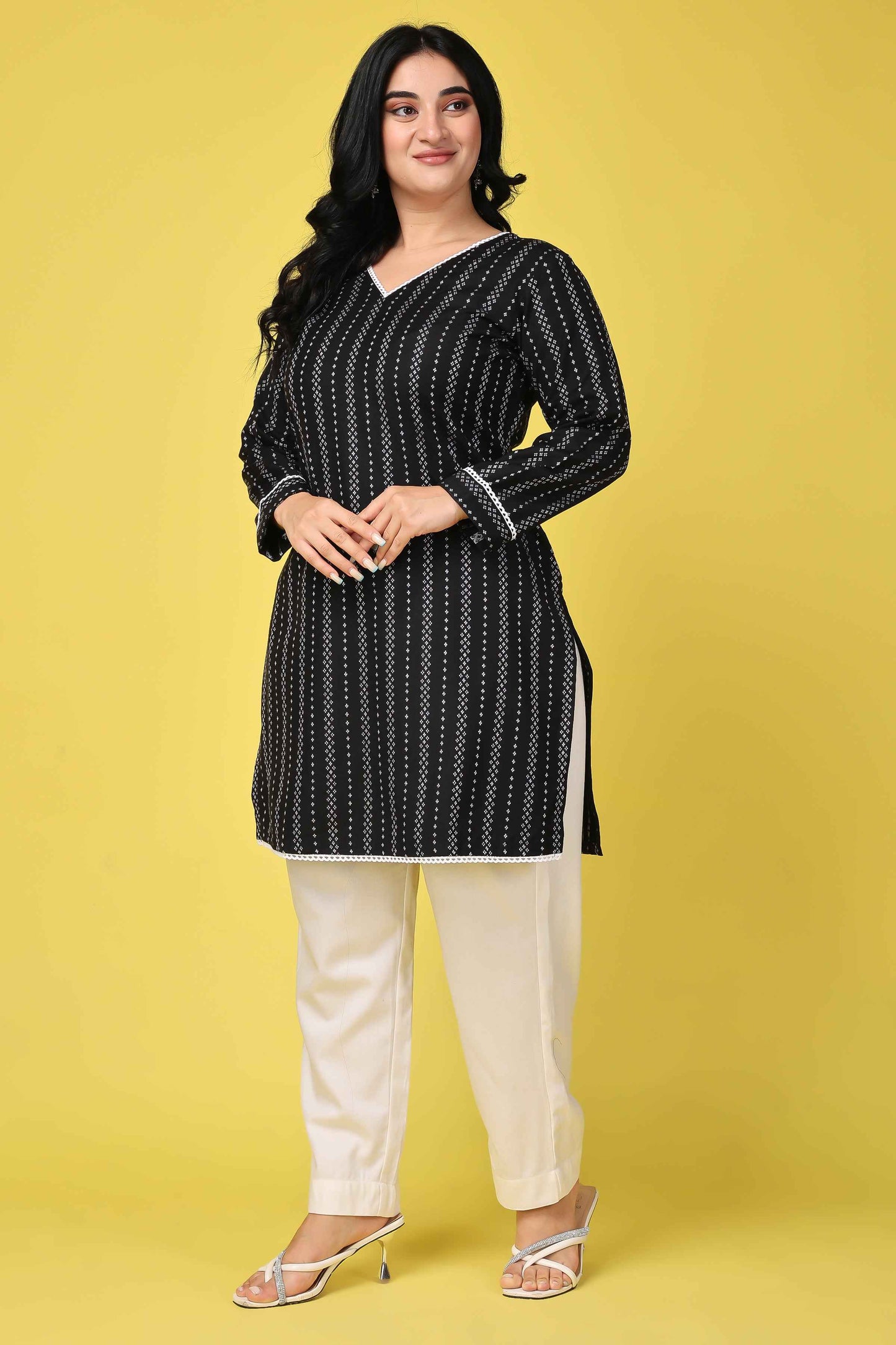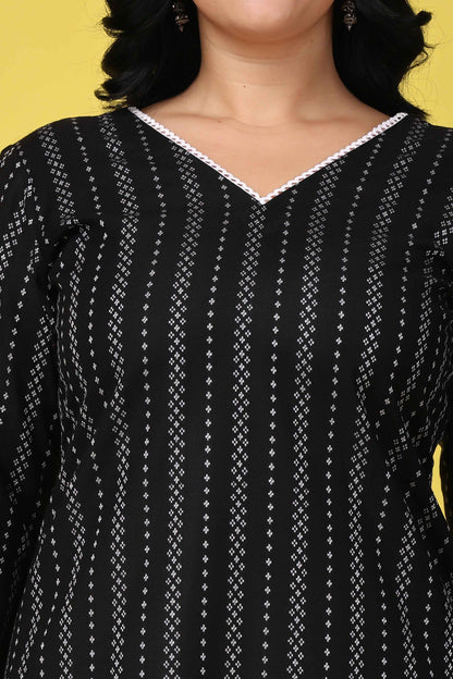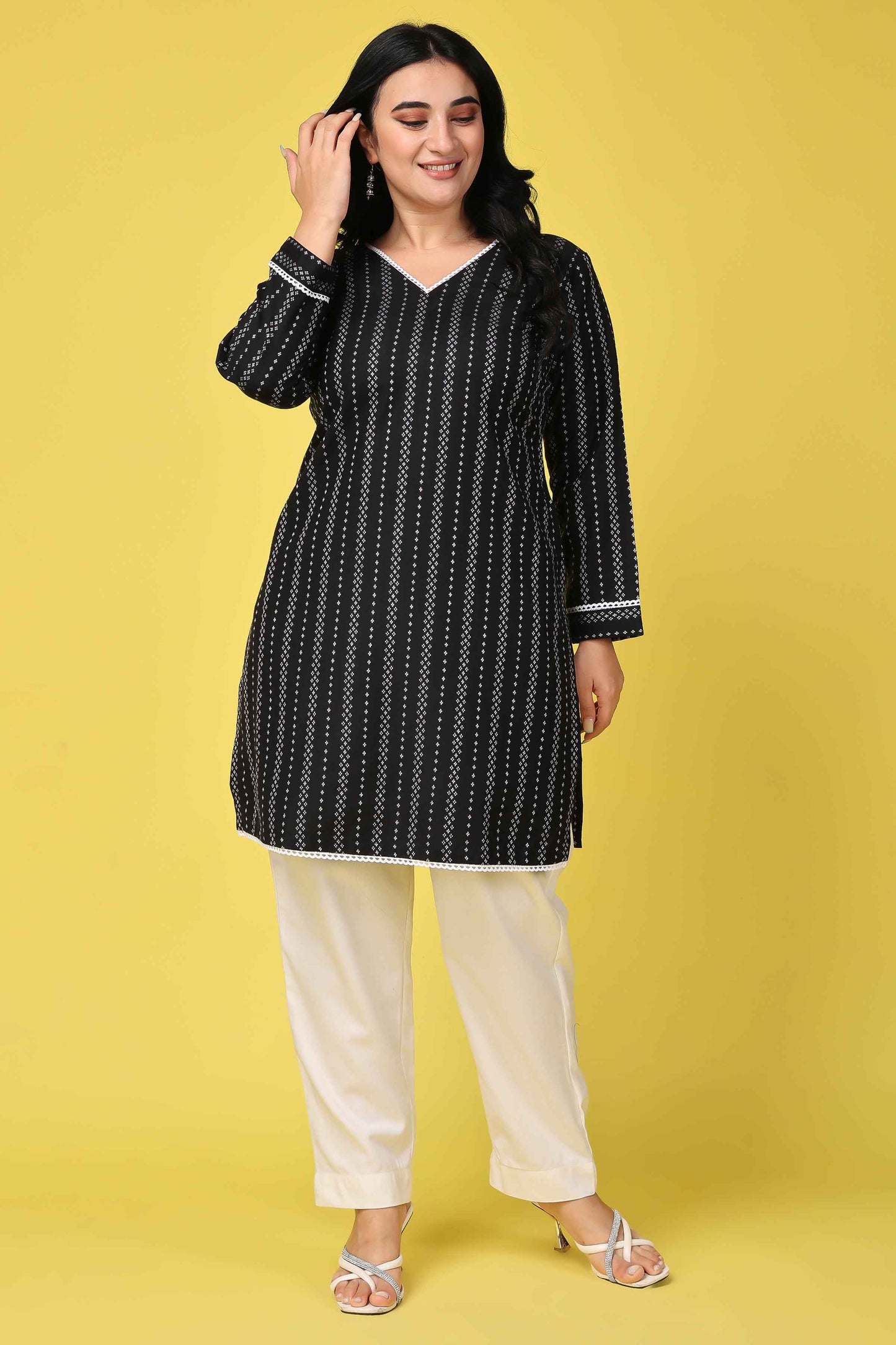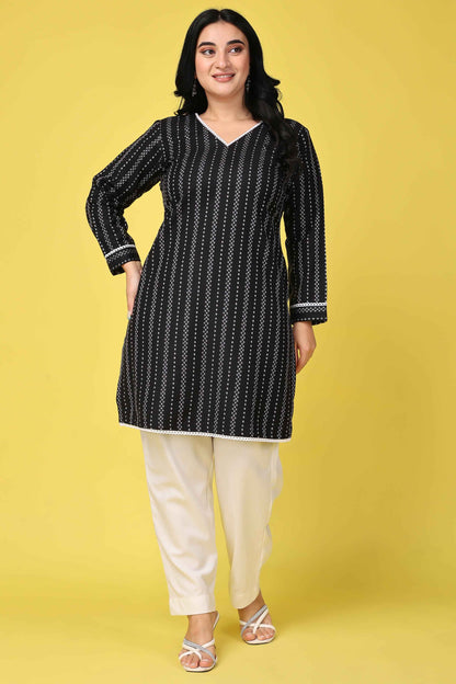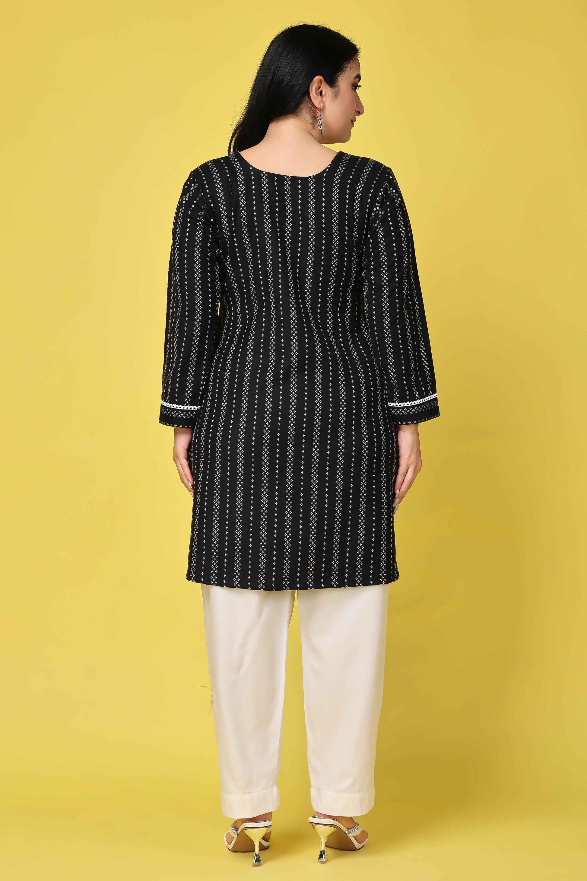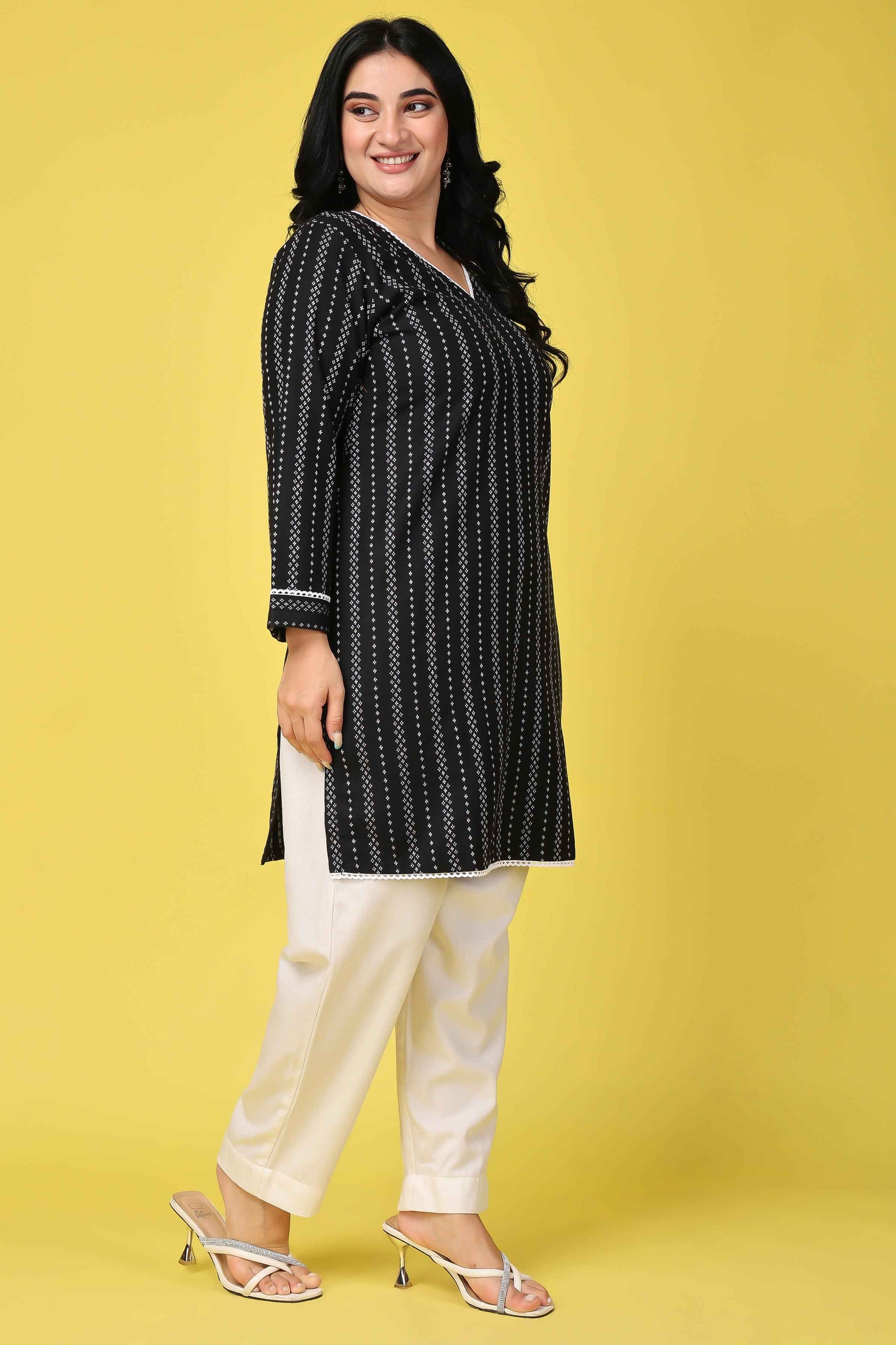 Upgrade your winter fashion with this delightful Black Striped Woollen Kurta. Crafted from cozy Cashmilon fabric, this kurta showcases a captivating all-over stripe, adding a touch of elegance to the classic black base. The V-neckline with intricate lace work exudes sophistication and with full sleeves, it promises both comfort and style. Pair it with palazzo pants for a chic and versatile ensemble that's perfect for the season.