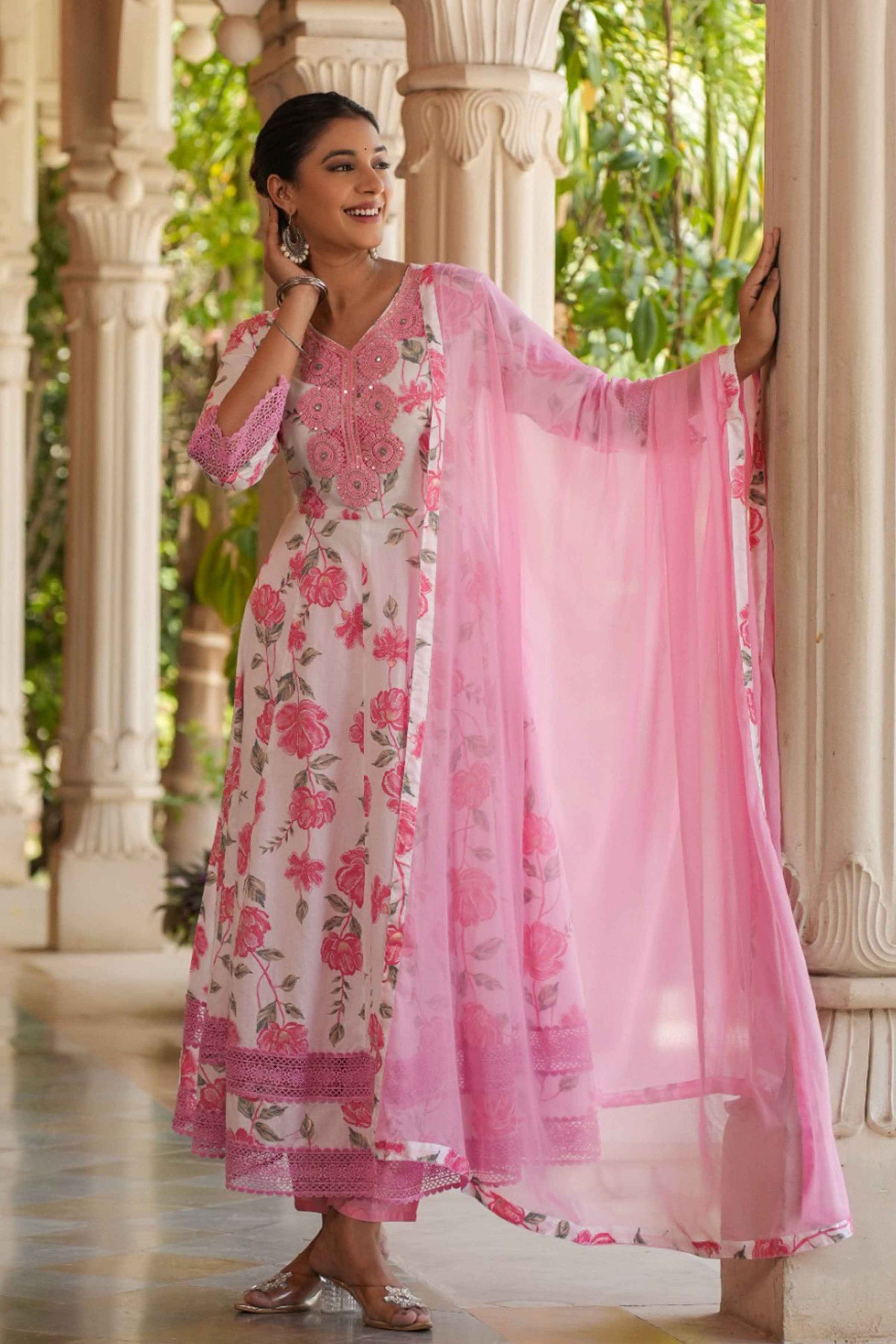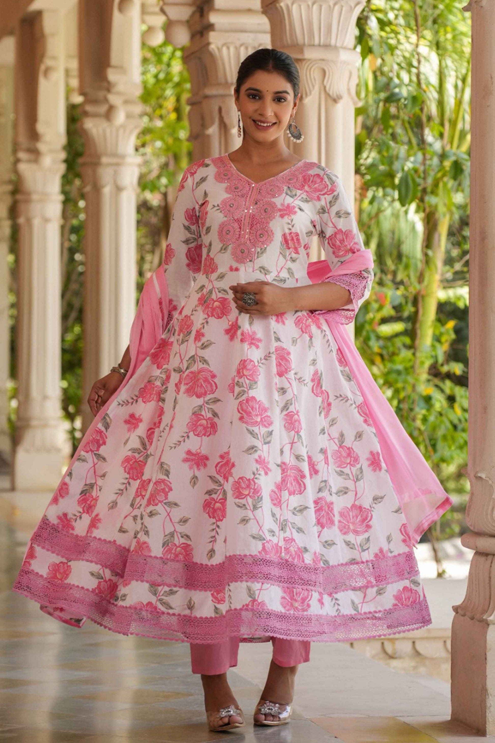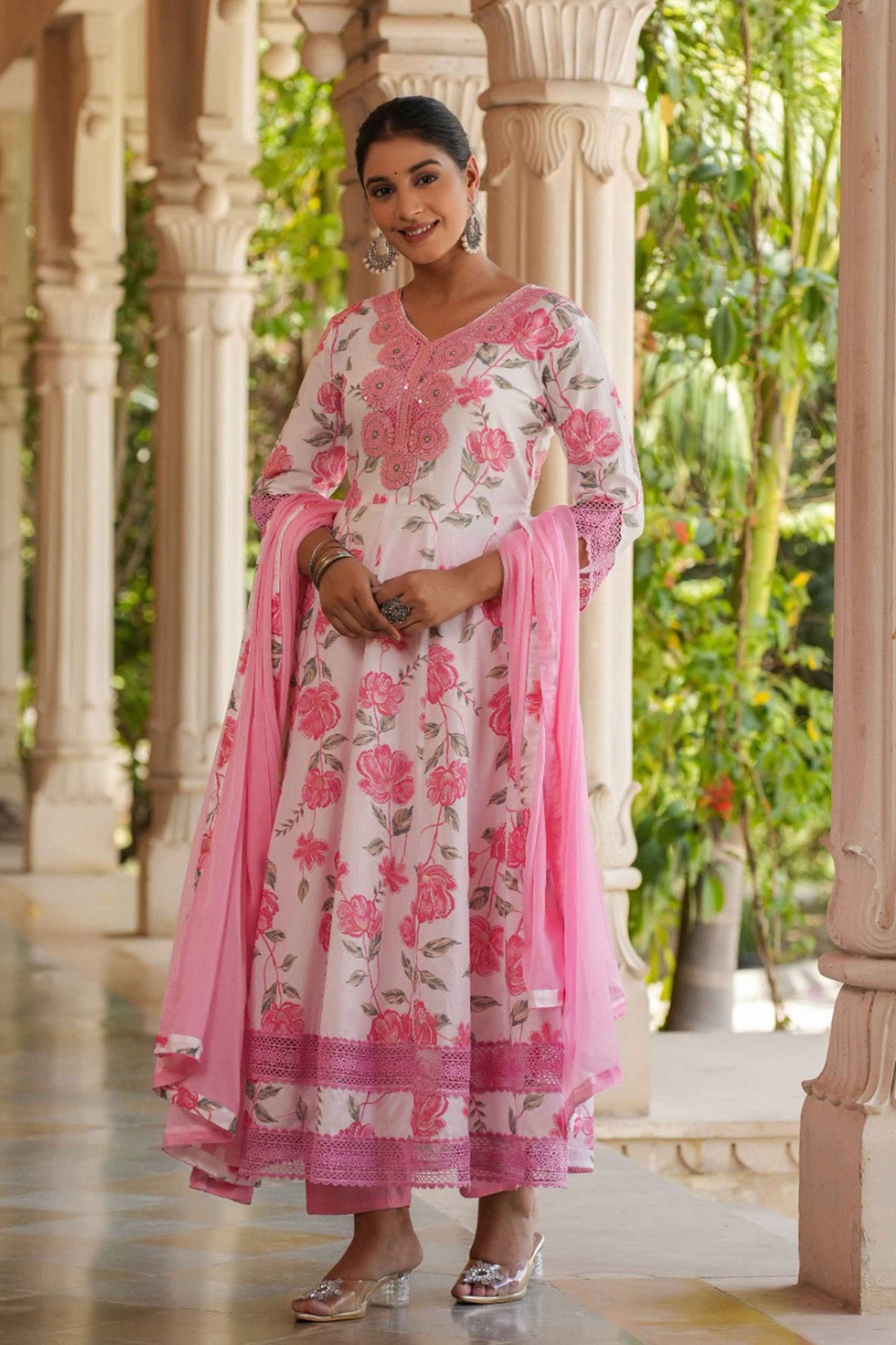 Whether you're attending a festival, party, or wedding, our Dreamy Petals Cotton Anarkali Set is sure to turn heads. Made from cotton fabric, it features charming floral print all over, v-neckline with embroidered detailing along with minimal sequin detailing, crochet lace work at hemline and quarter sleeves. It is paired with matching palazzo pants and chiffon dupatta with border work.