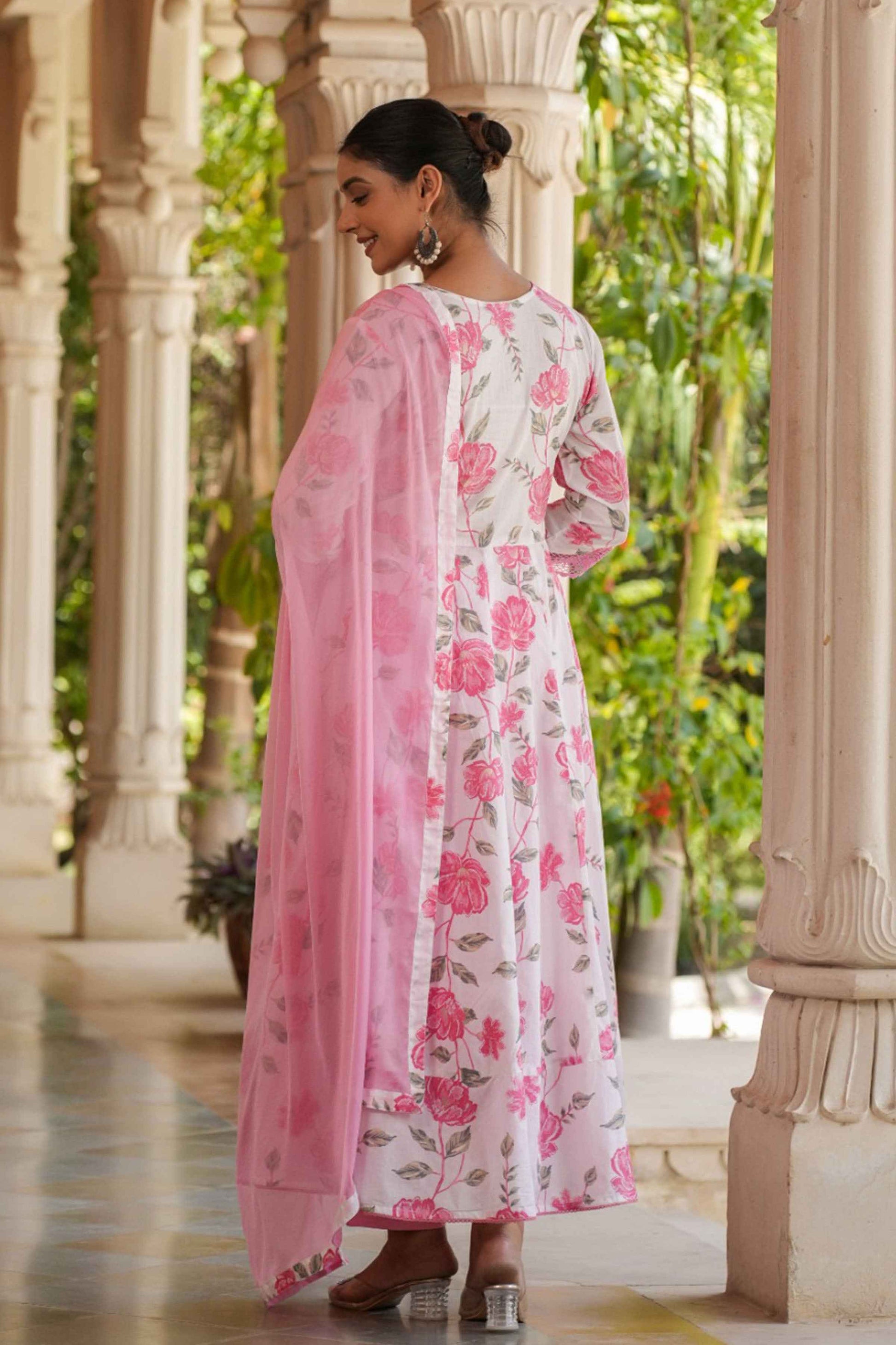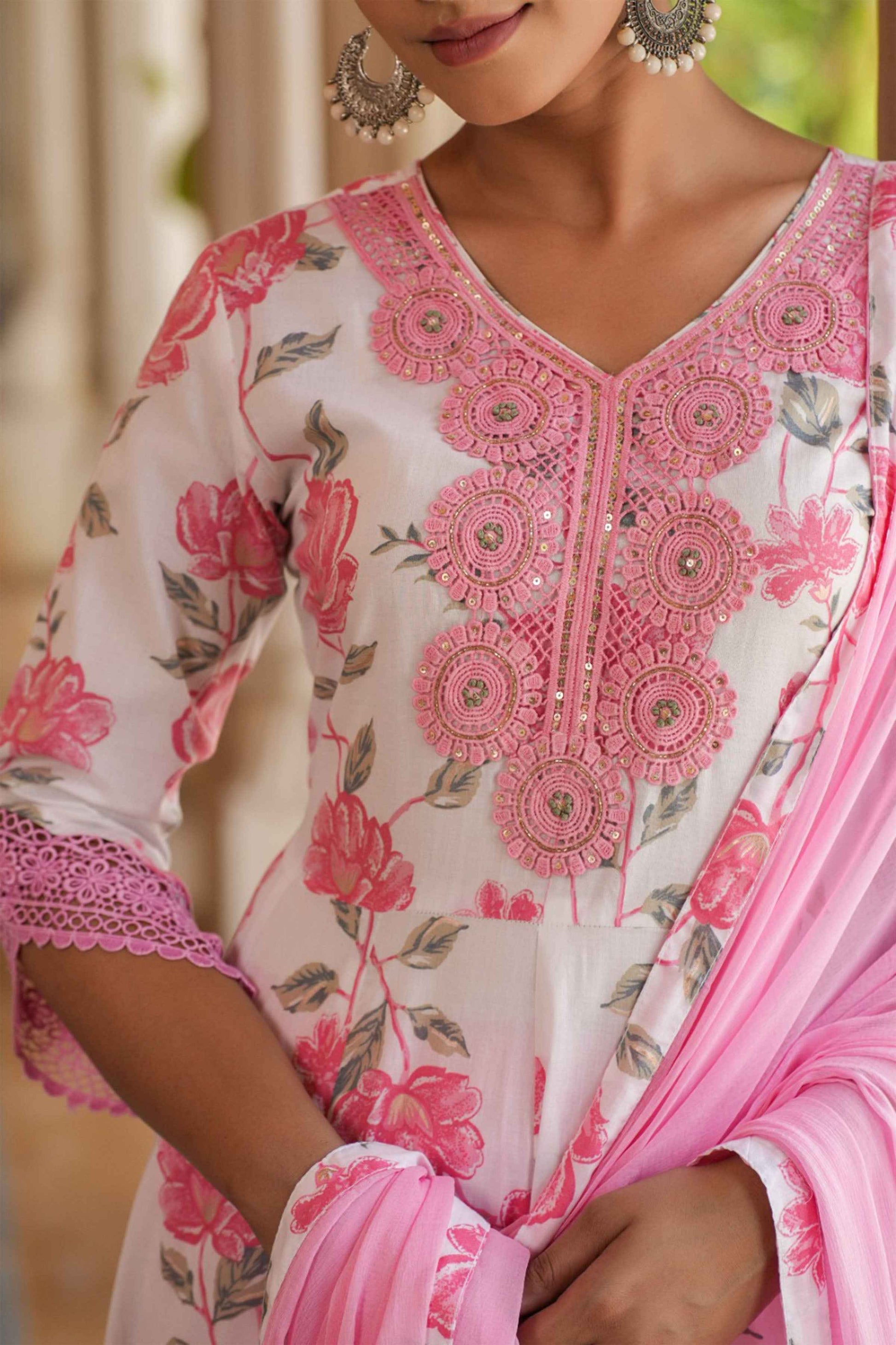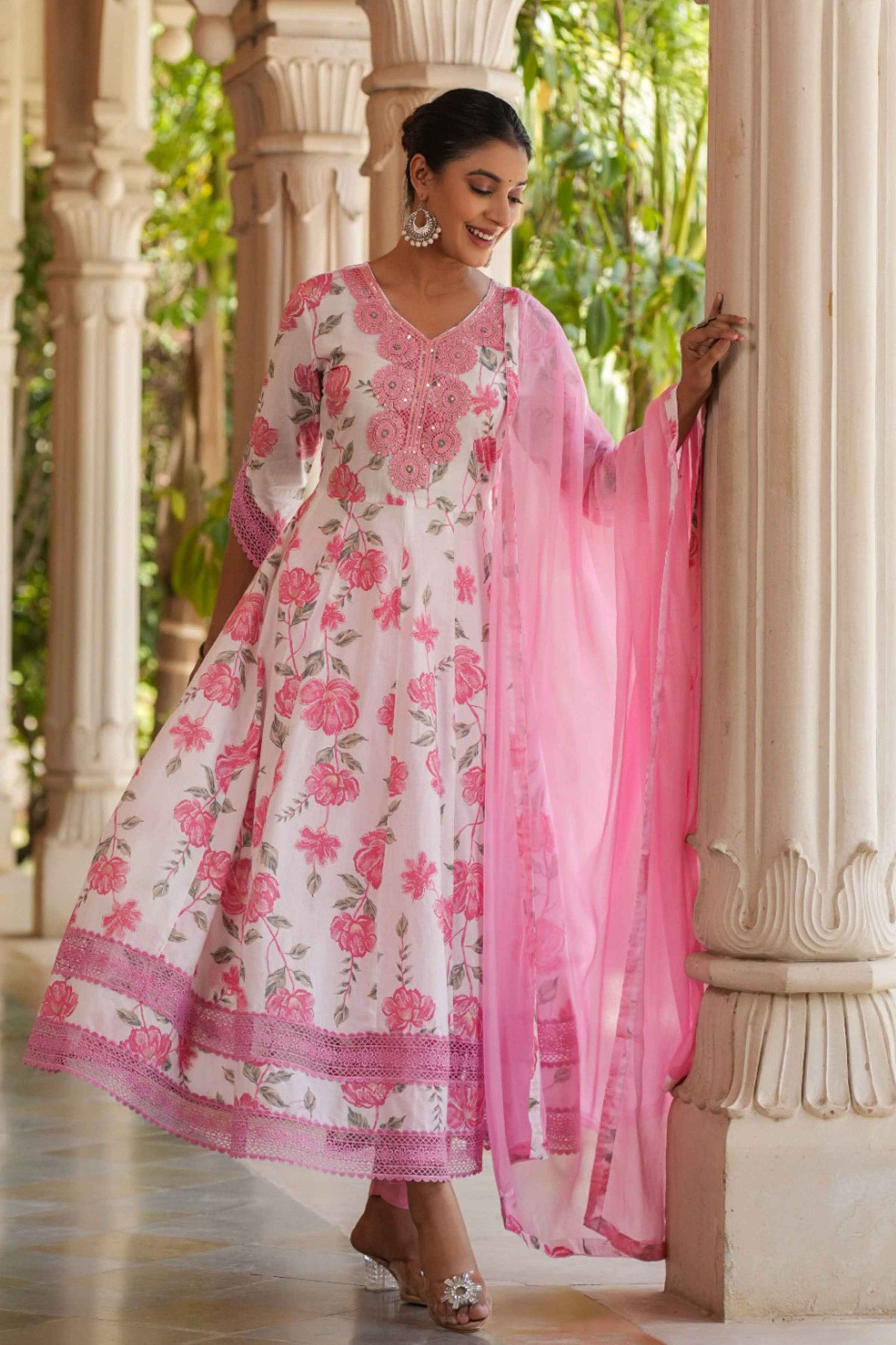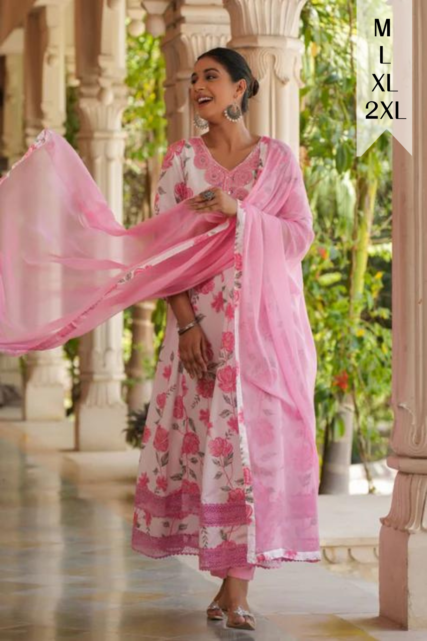 Whether you're attending a festival, party, or wedding, our Dreamy Petals Cotton Anarkali Set is sure to turn heads. Made from cotton fabric, it features charming floral print all over, v-neckline with embroidered detailing along with minimal sequin detailing, crochet lace work at hemline and quarter sleeves. It is paired with matching palazzo pants and chiffon dupatta with border work.