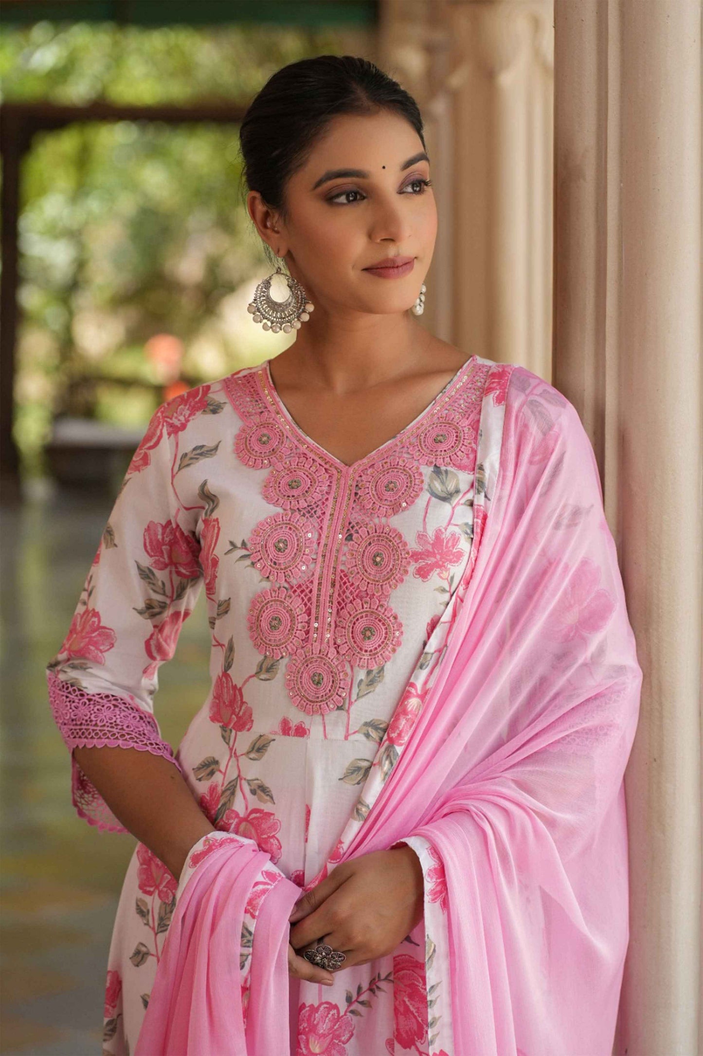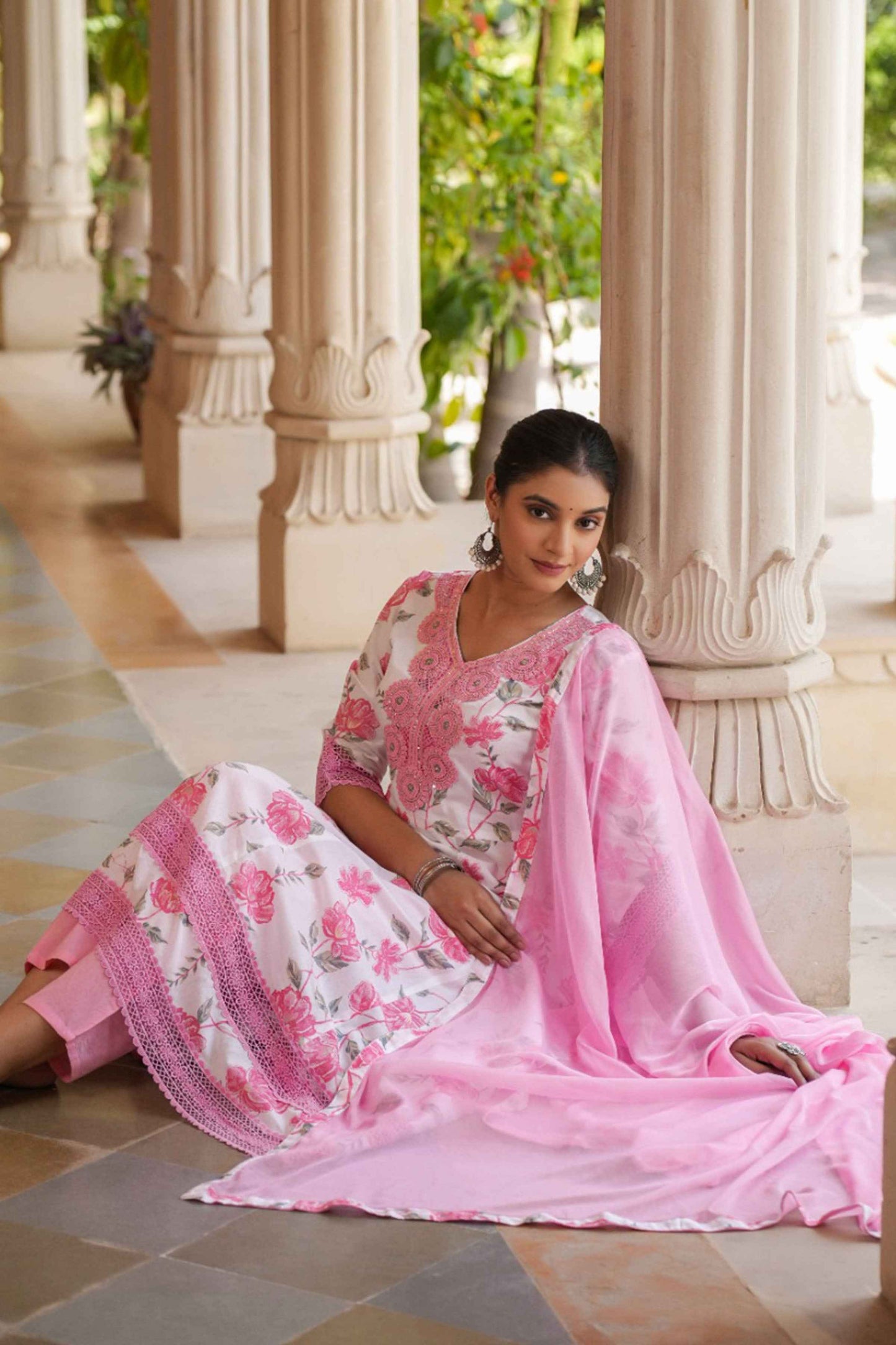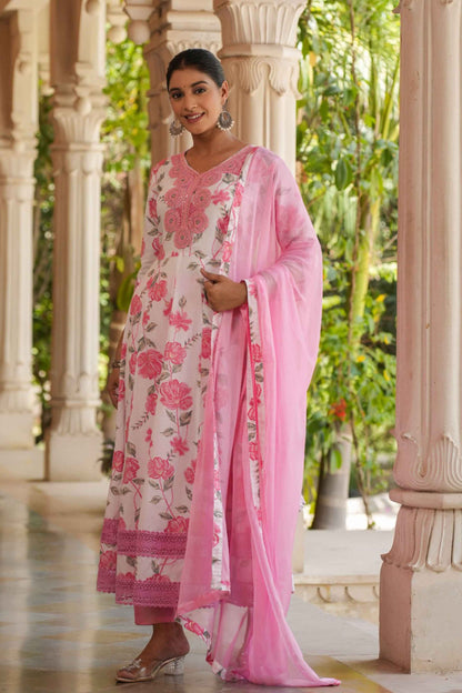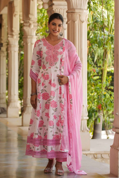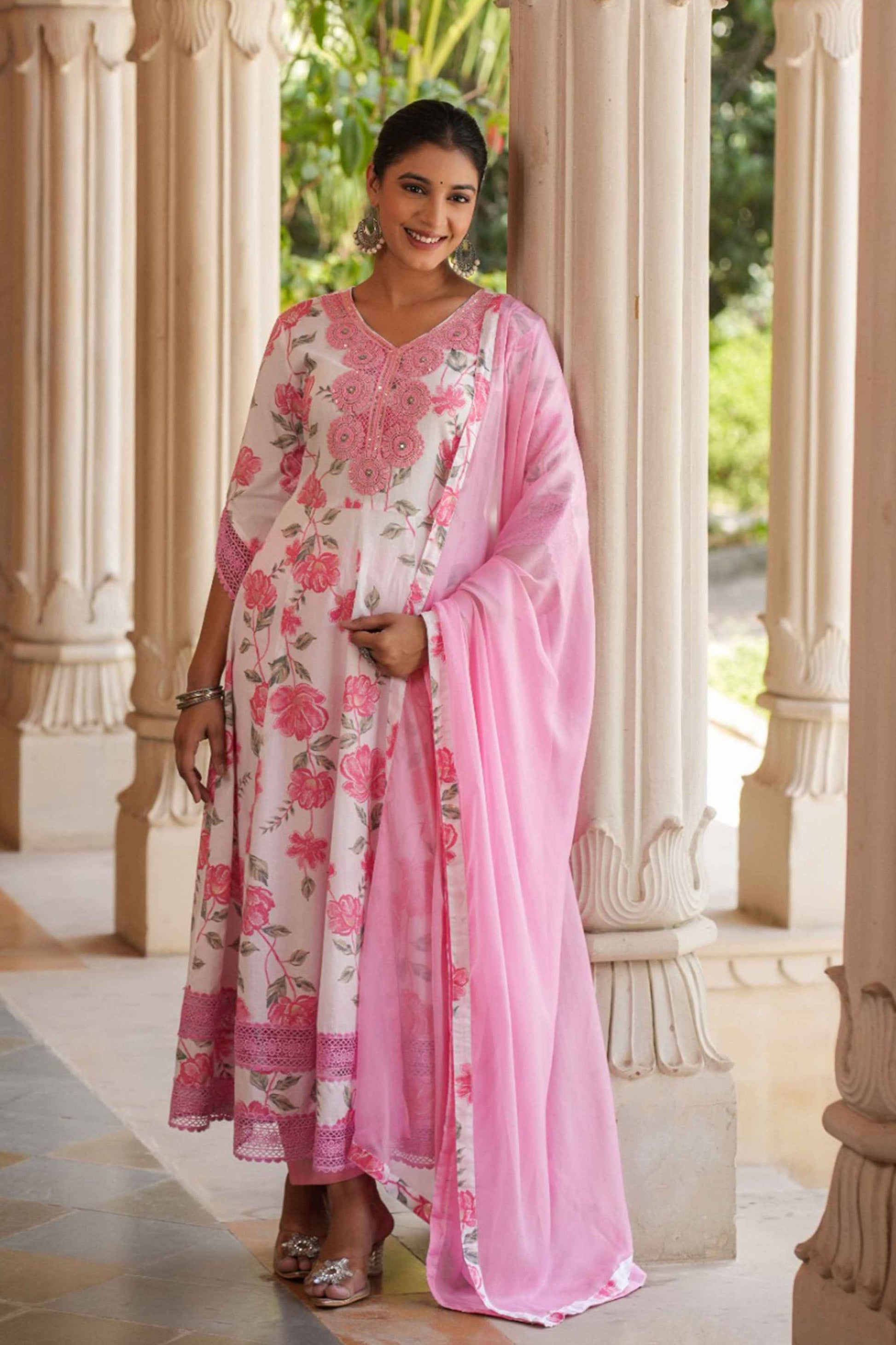 Whether you're attending a festival, party, or wedding, our Dreamy Petals Cotton Anarkali Set is sure to turn heads. Made from cotton fabric, it features charming floral print all over, v-neckline with embroidered detailing along with minimal sequin detailing, crochet lace work at hemline and quarter sleeves. It is paired with matching palazzo pants and chiffon dupatta with border work.