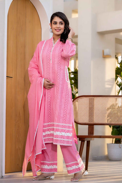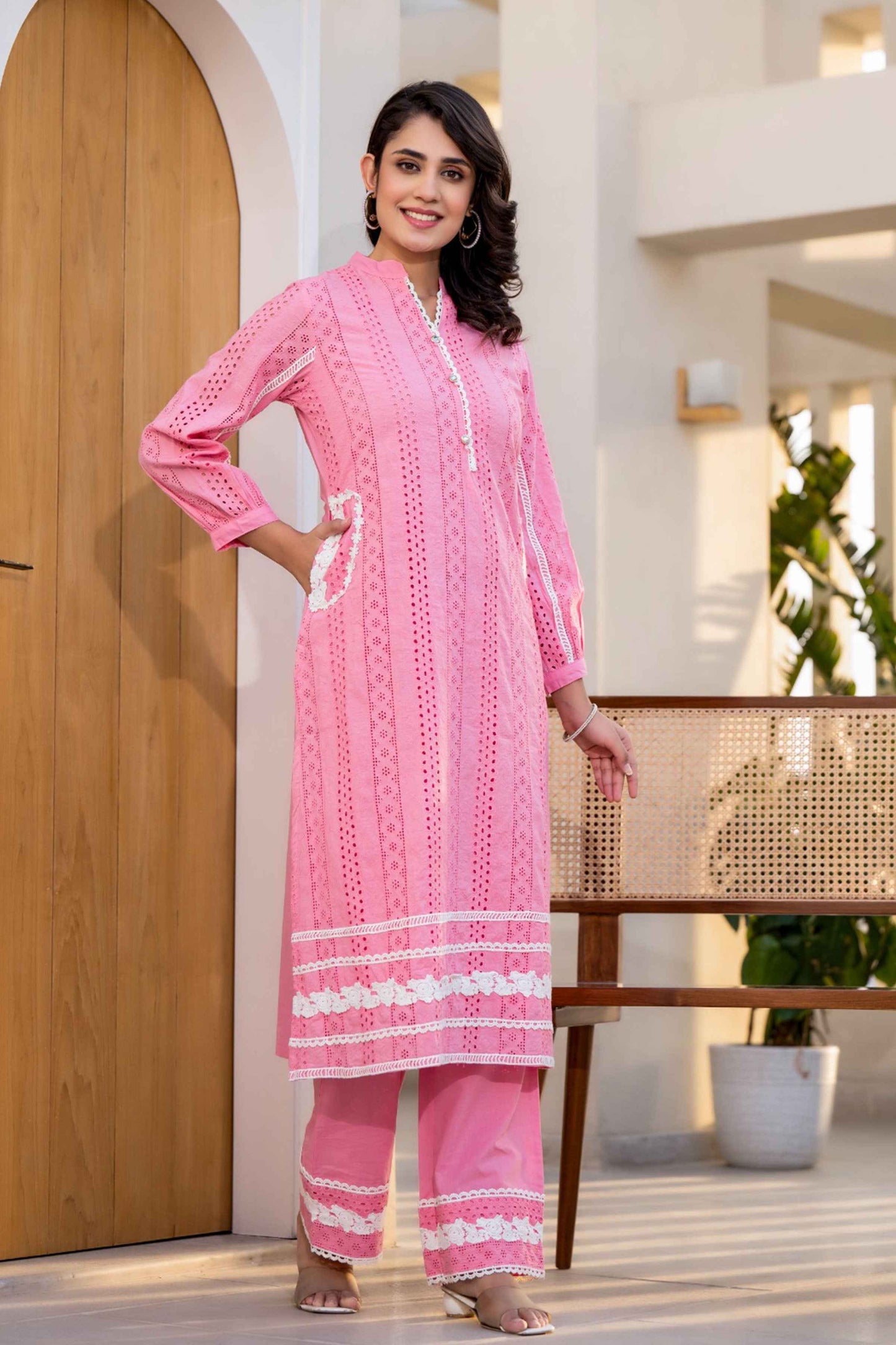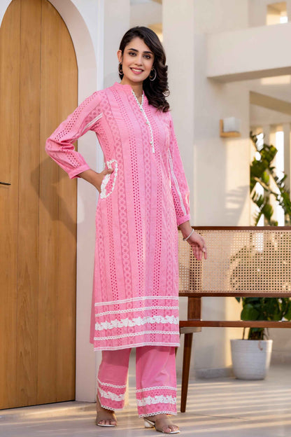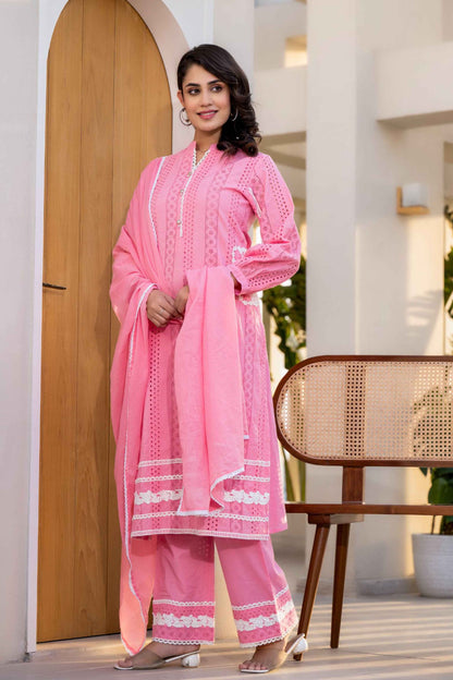 Turn heads and make a lasting impression with the stunning Dreamy Pink Schiffli Suit Set, a true showstopper designed to capture everyone's attention. Made from cotton fabric with intricate schiffli work, it features a mandarin neckline with stylish buttons, two side pockets adorned with lace work, lace detailing at hemline and quarter sleeves. It is paired with matching palazzo pants featuring elegant lace detailing at the hemline and a chiffon dupatta with lace detailing.Â