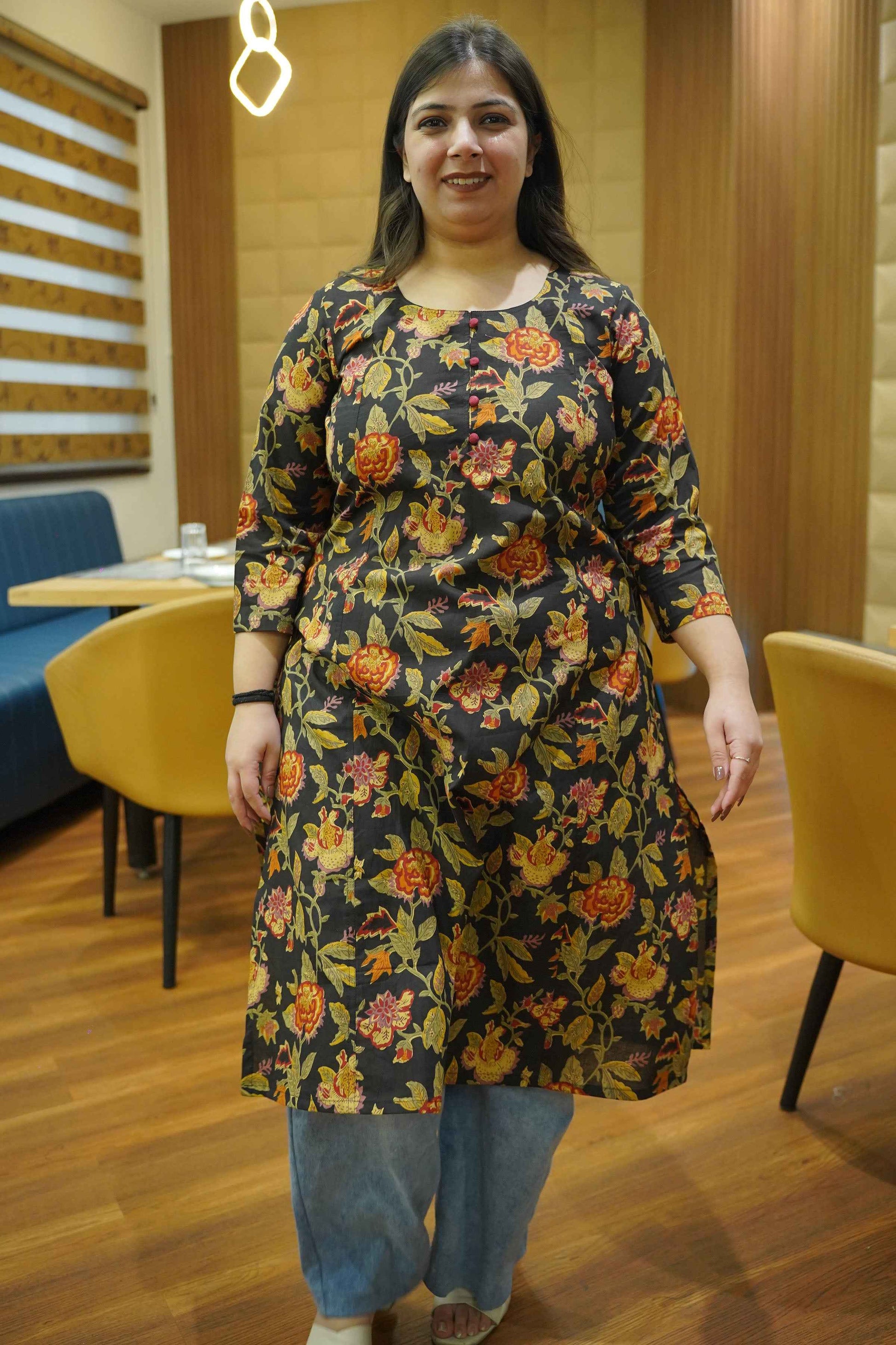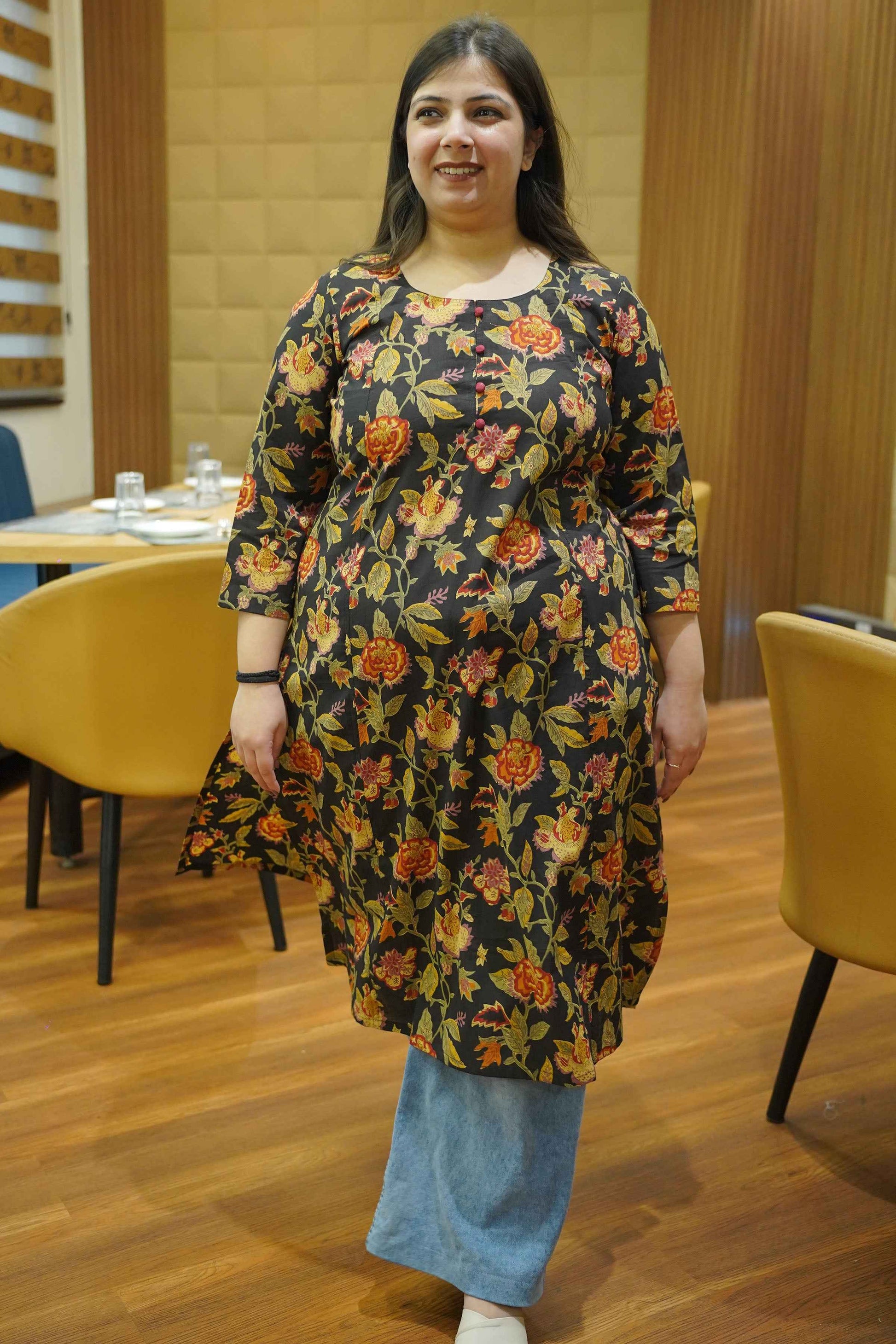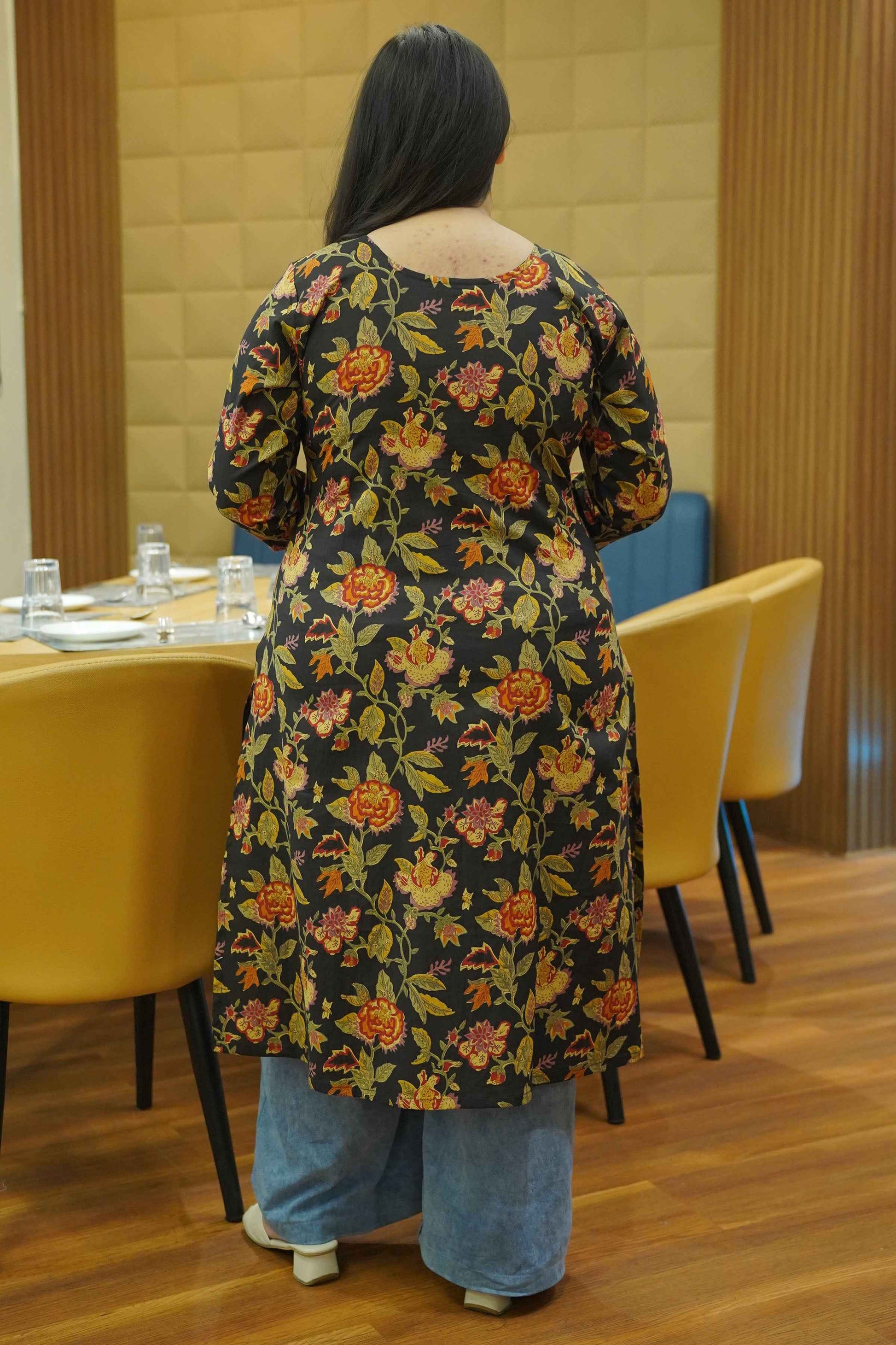 - Black cotton kurta with earthy-toned block prints