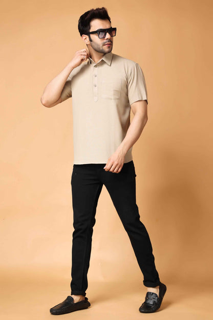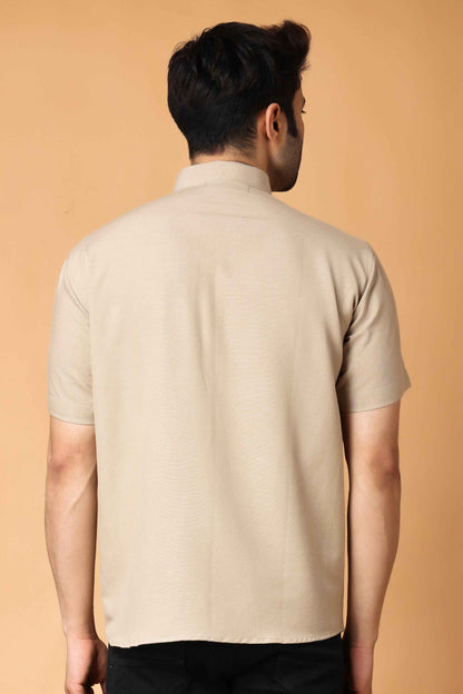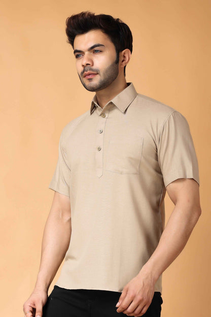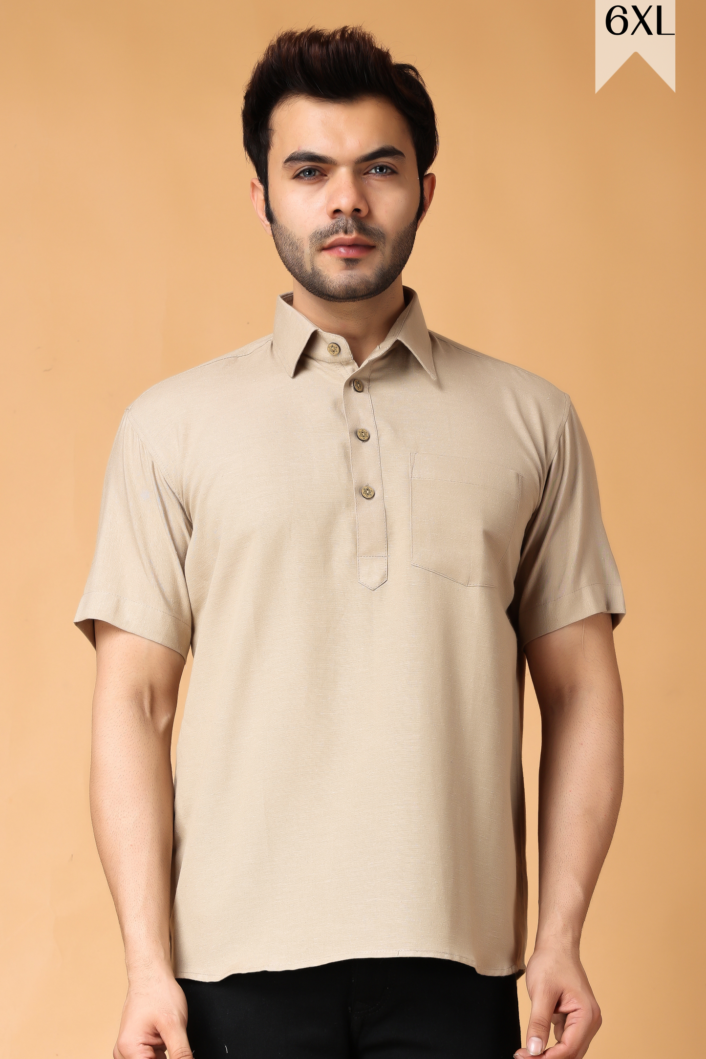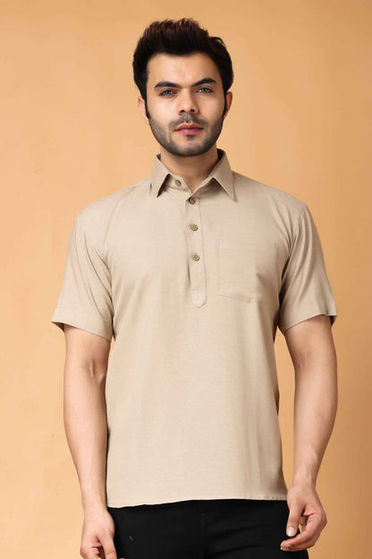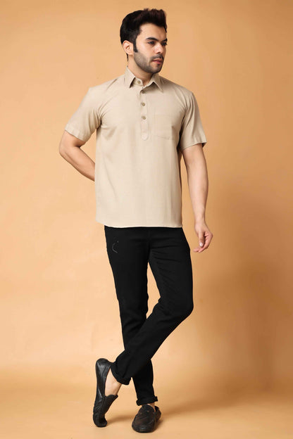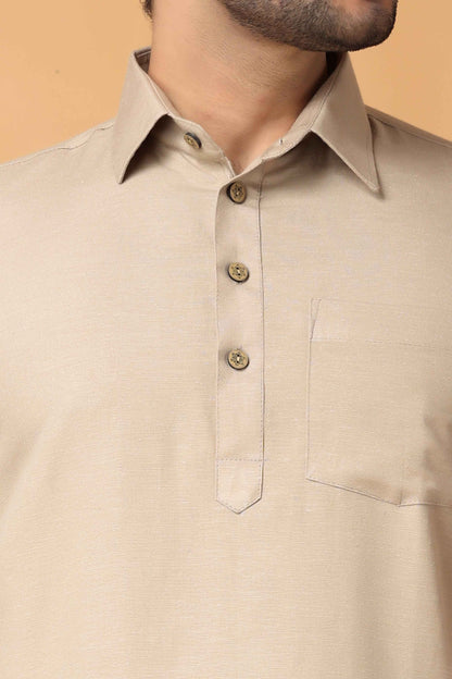 Create a lasting impression in this Short Kurta crafted with fine Cotton Linen. With a solid pattern, this chiseled fit kurta has half sleeves and a collar neckline with half button placket, making it a must-have for your wardrobe. The breezy fabric of this Kurta gives you a relaxed wear for long hours while the earthy Beige color adds an elegant touch to your look.