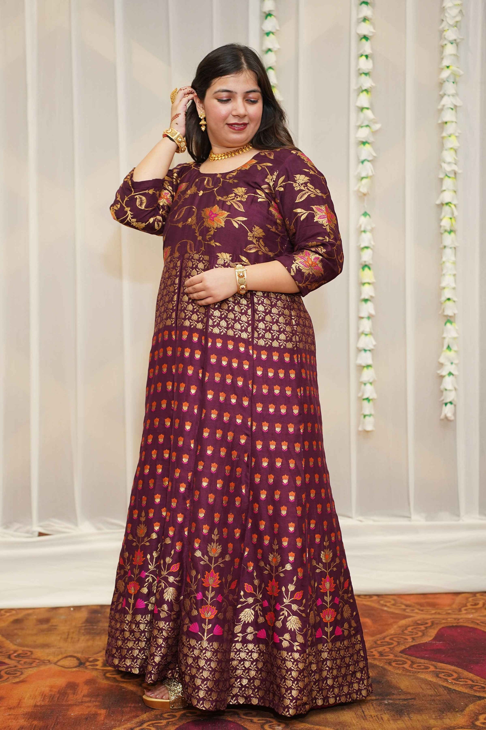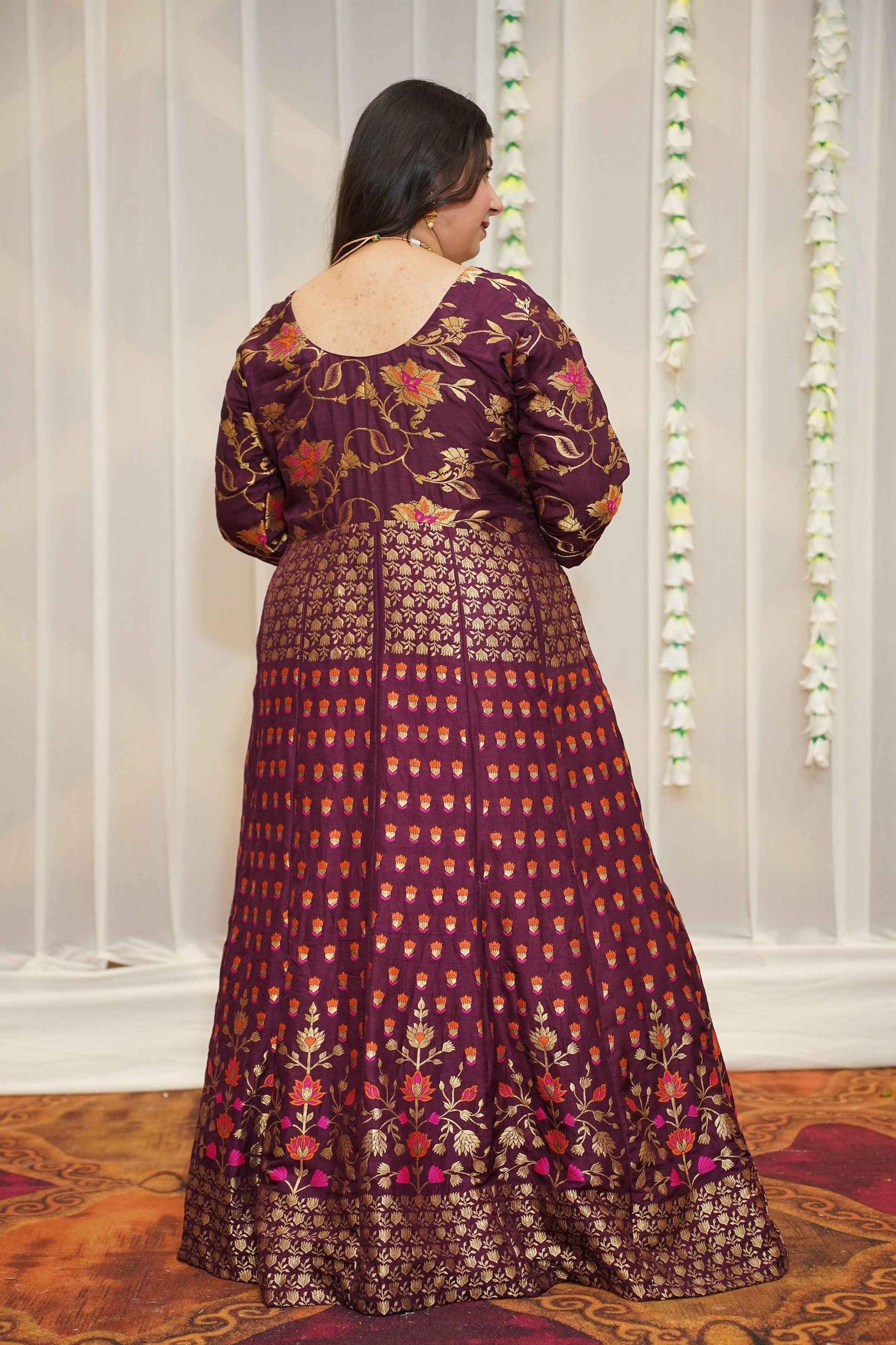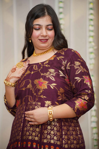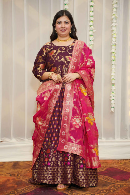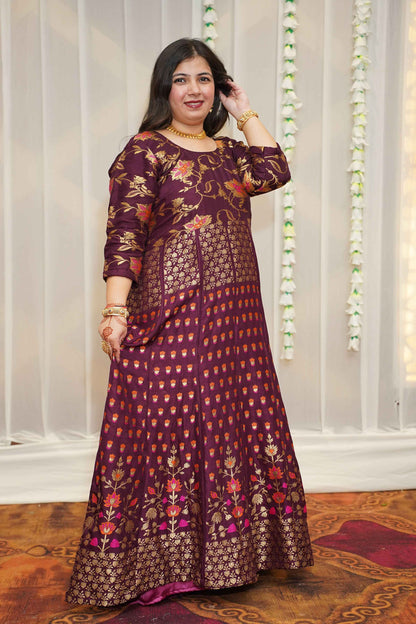 - Wine Anarkali Dress made from Tanjore Silk fabric