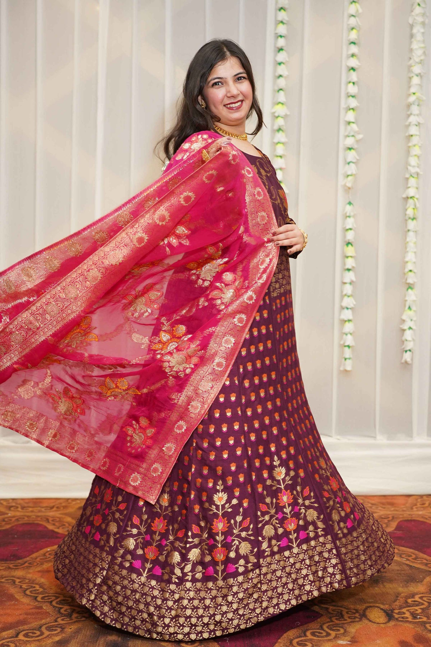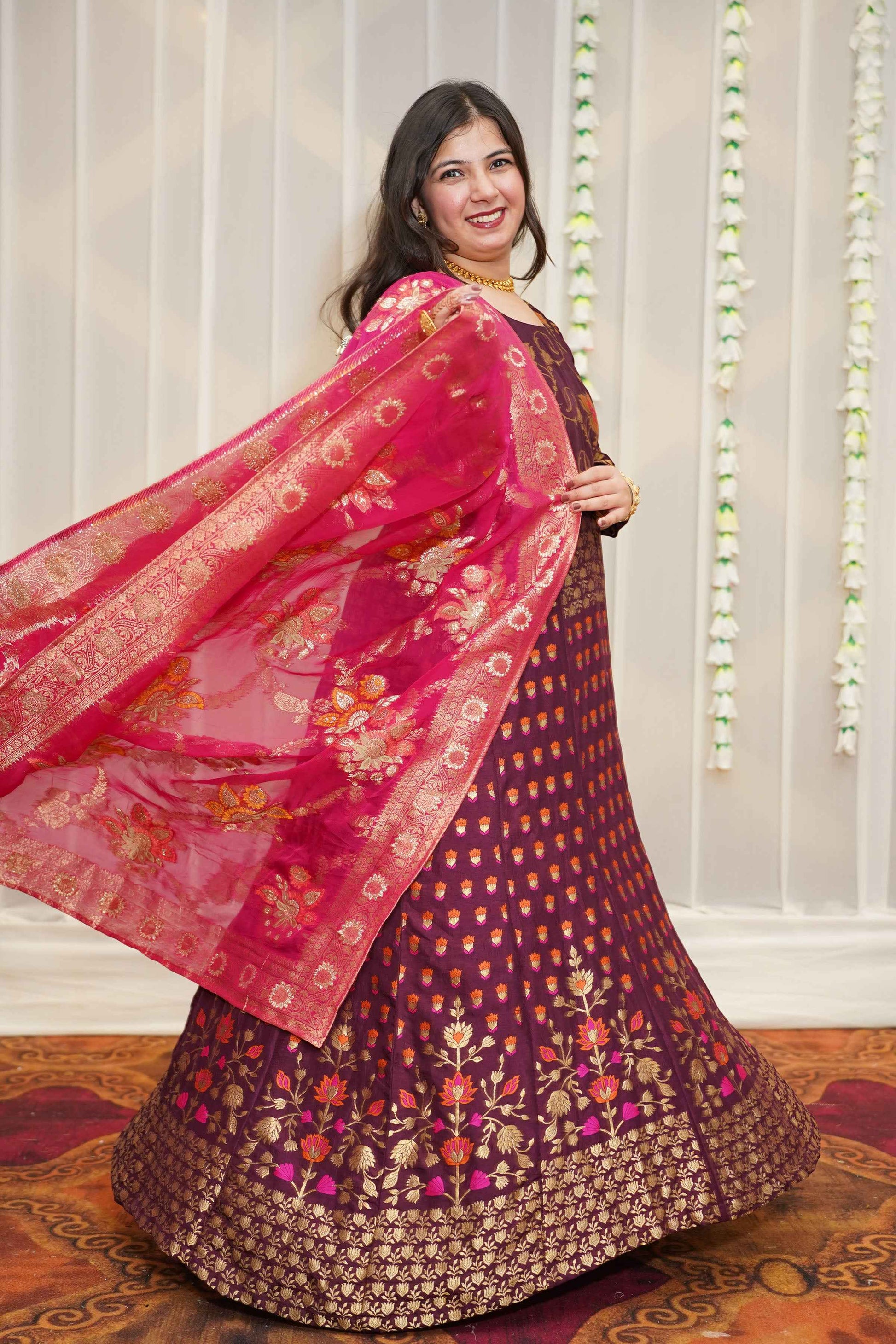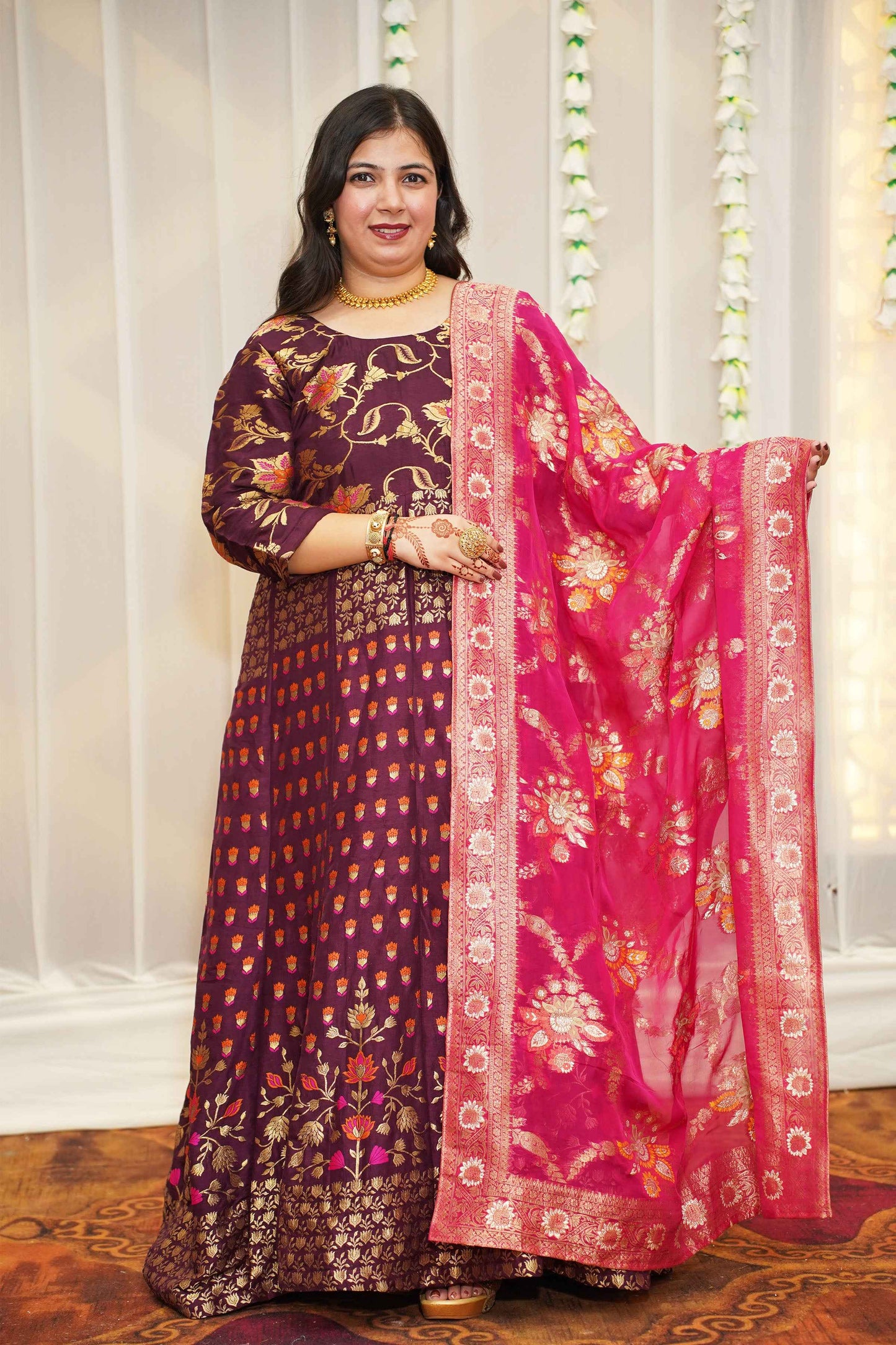 - Wine Anarkali Dress made from Tanjore Silk fabric