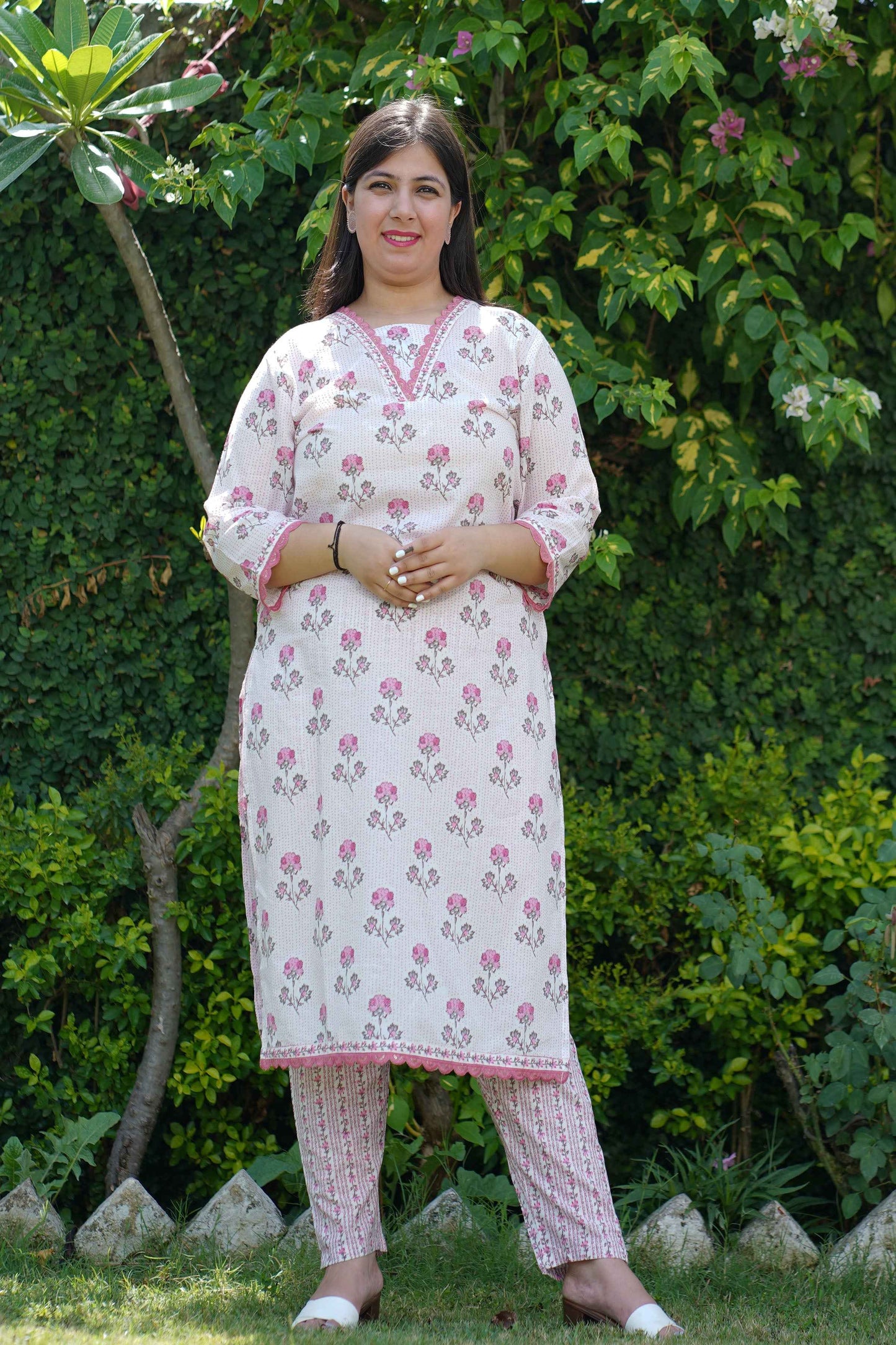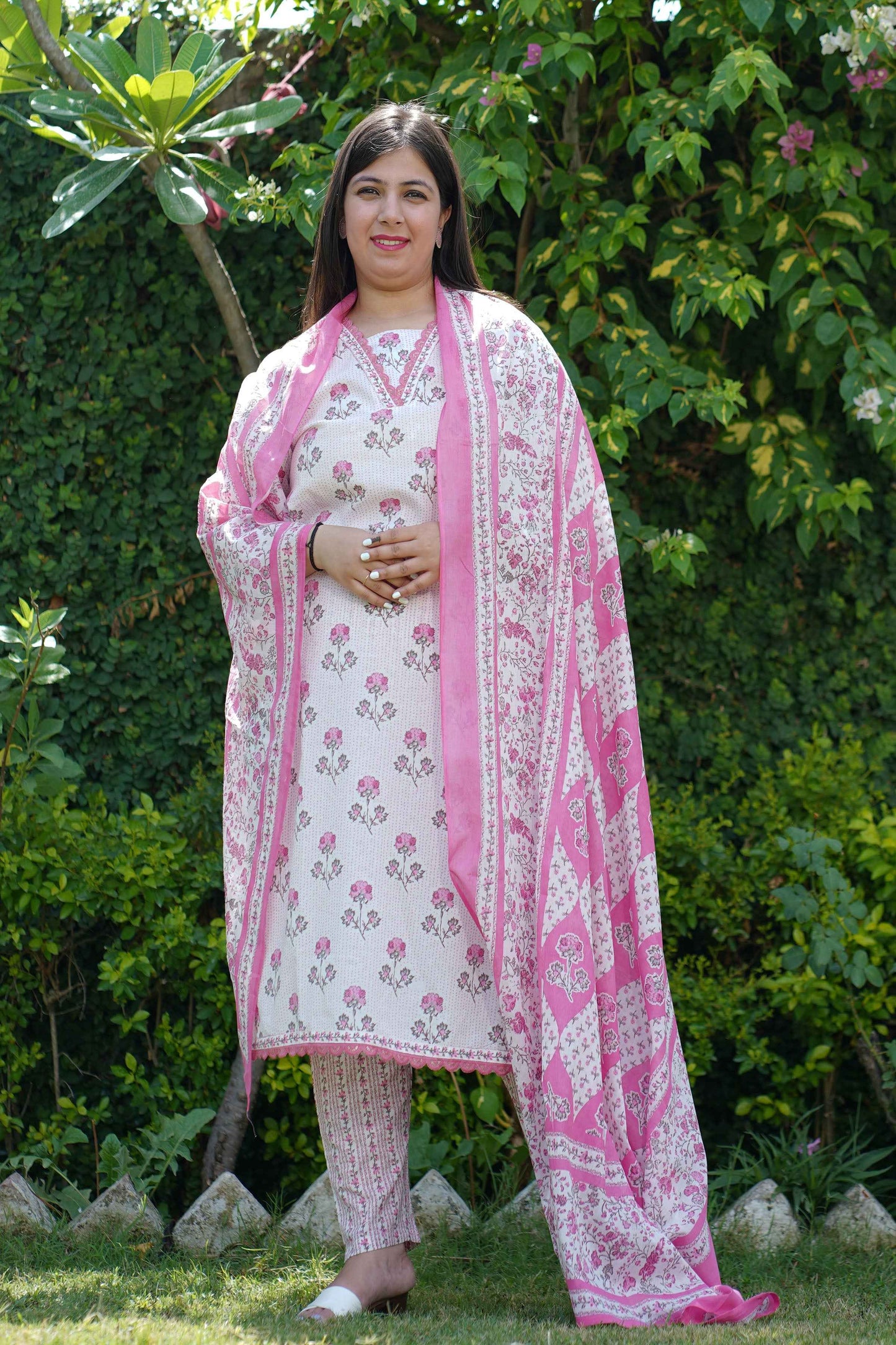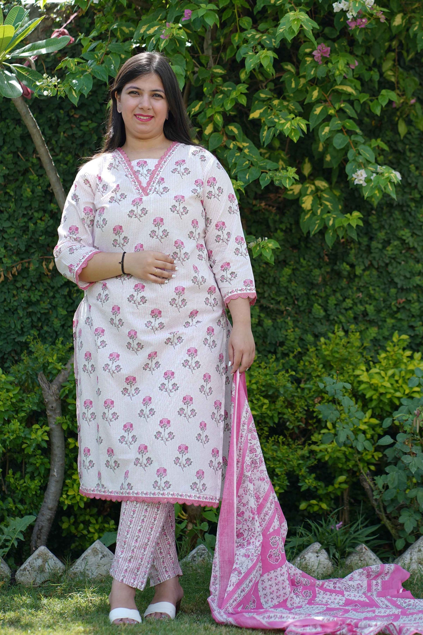 Turn heads this festive season with our enchanting Ethereal White Cotton Suit Set. Crafted from soft cotton fabric with an all-over floral print, it features delicate lace detailing at the V-neckline, hemline, and quarter sleeves. It is paired with matching bottoms and a printed dupatta, this ensemble ensures you stand out in style at every celebration.