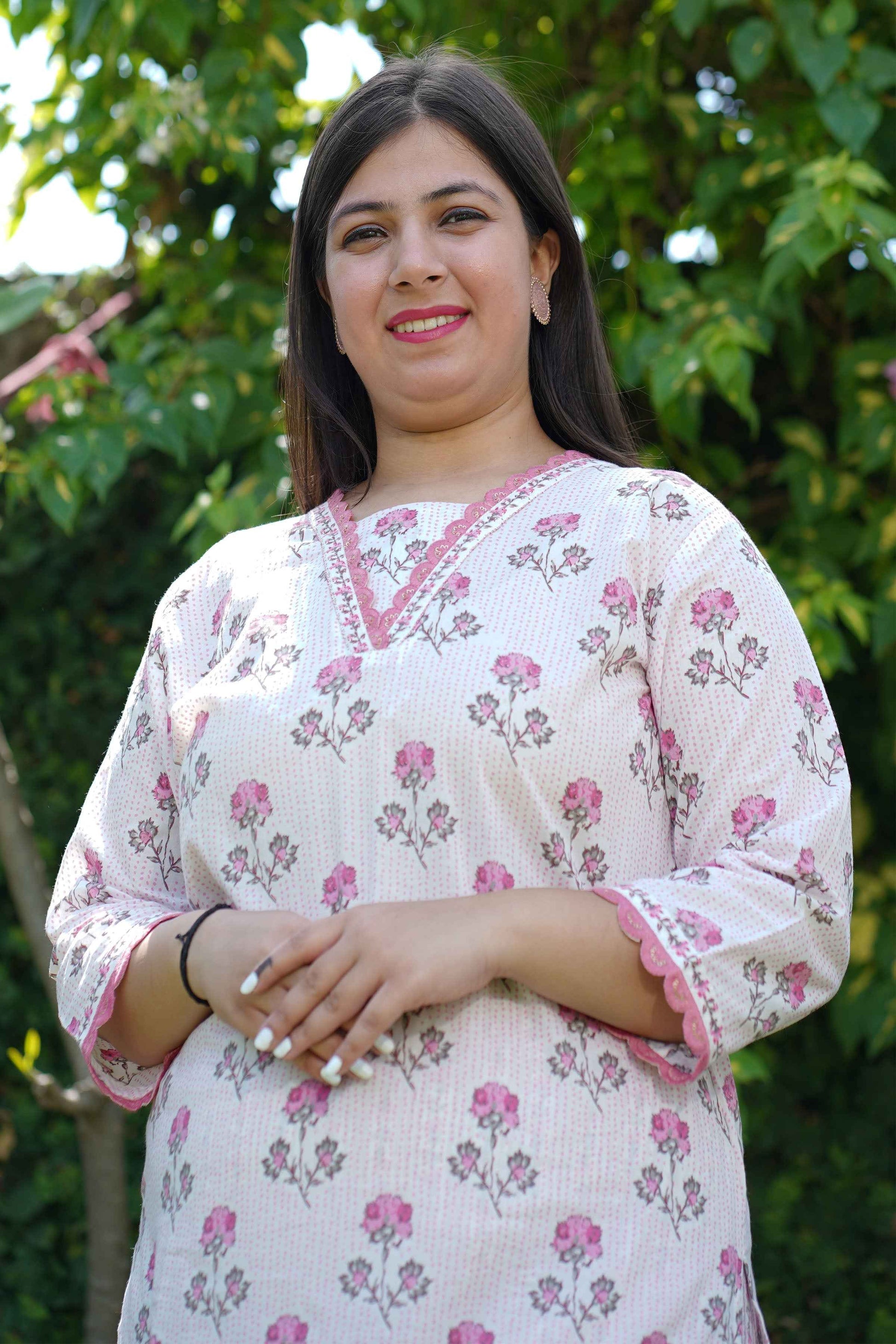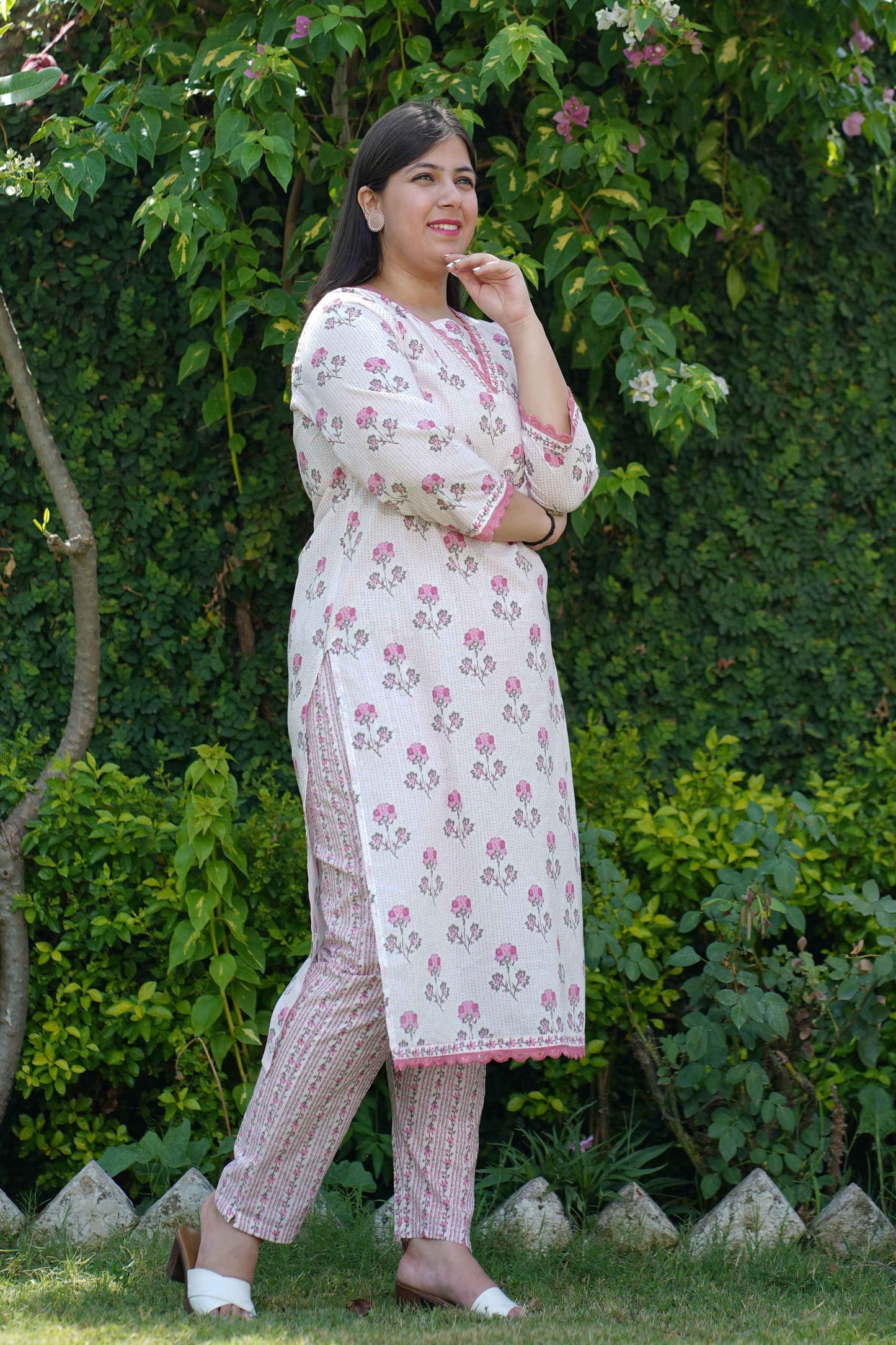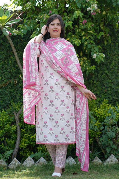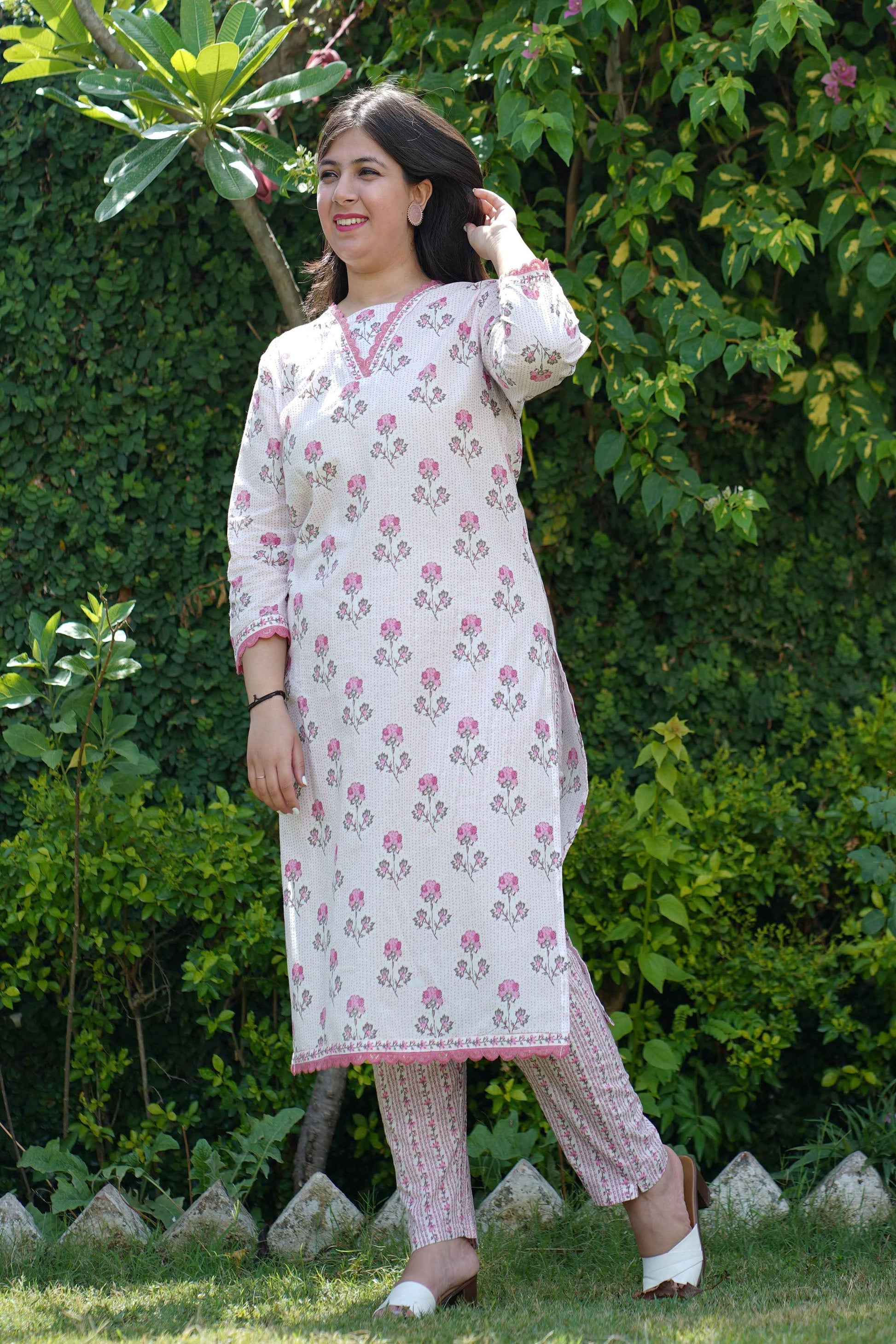 Turn heads this festive season with our enchanting Ethereal White Cotton Suit Set. Crafted from soft cotton fabric with an all-over floral print, it features delicate lace detailing at the V-neckline, hemline, and quarter sleeves. It is paired with matching bottoms and a printed dupatta, this ensemble ensures you stand out in style at every celebration.