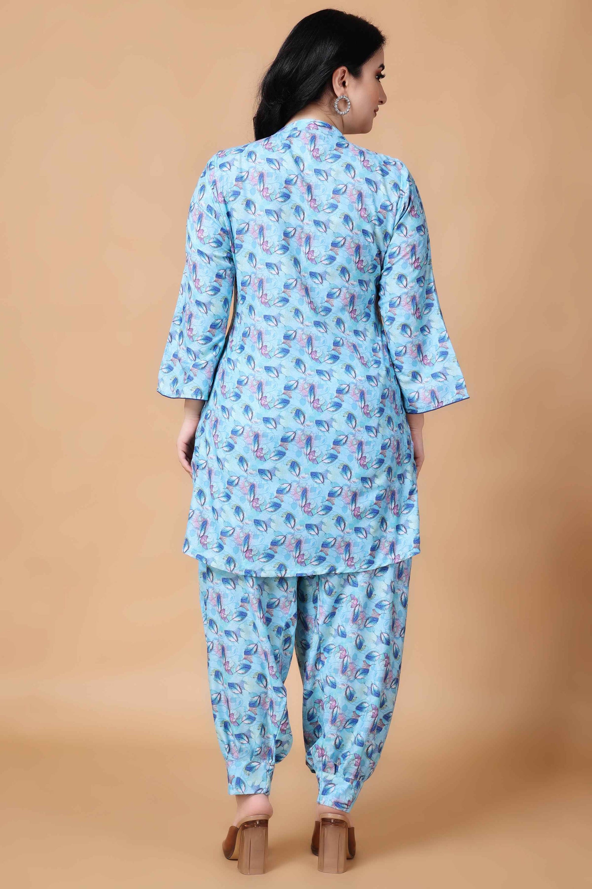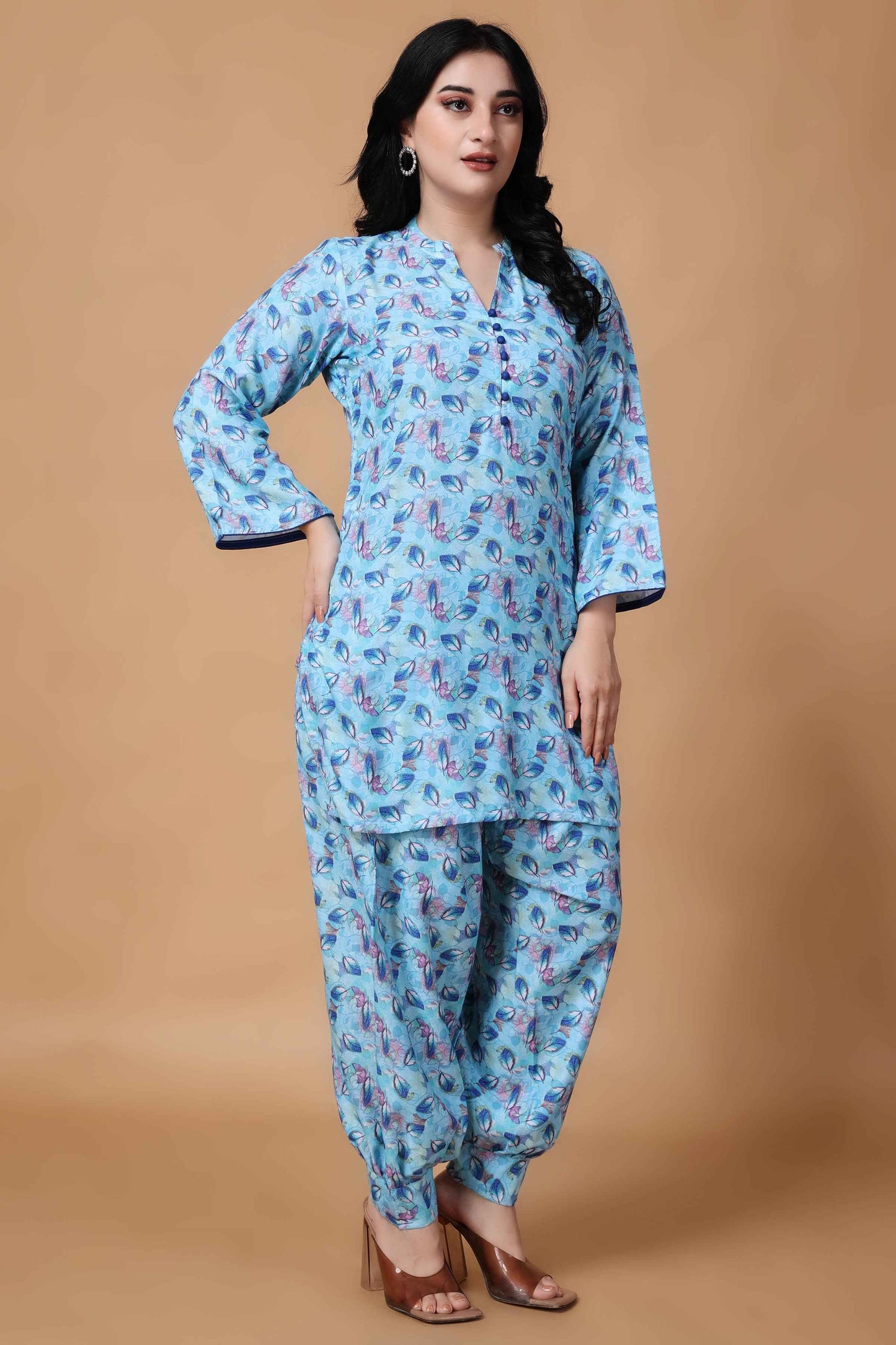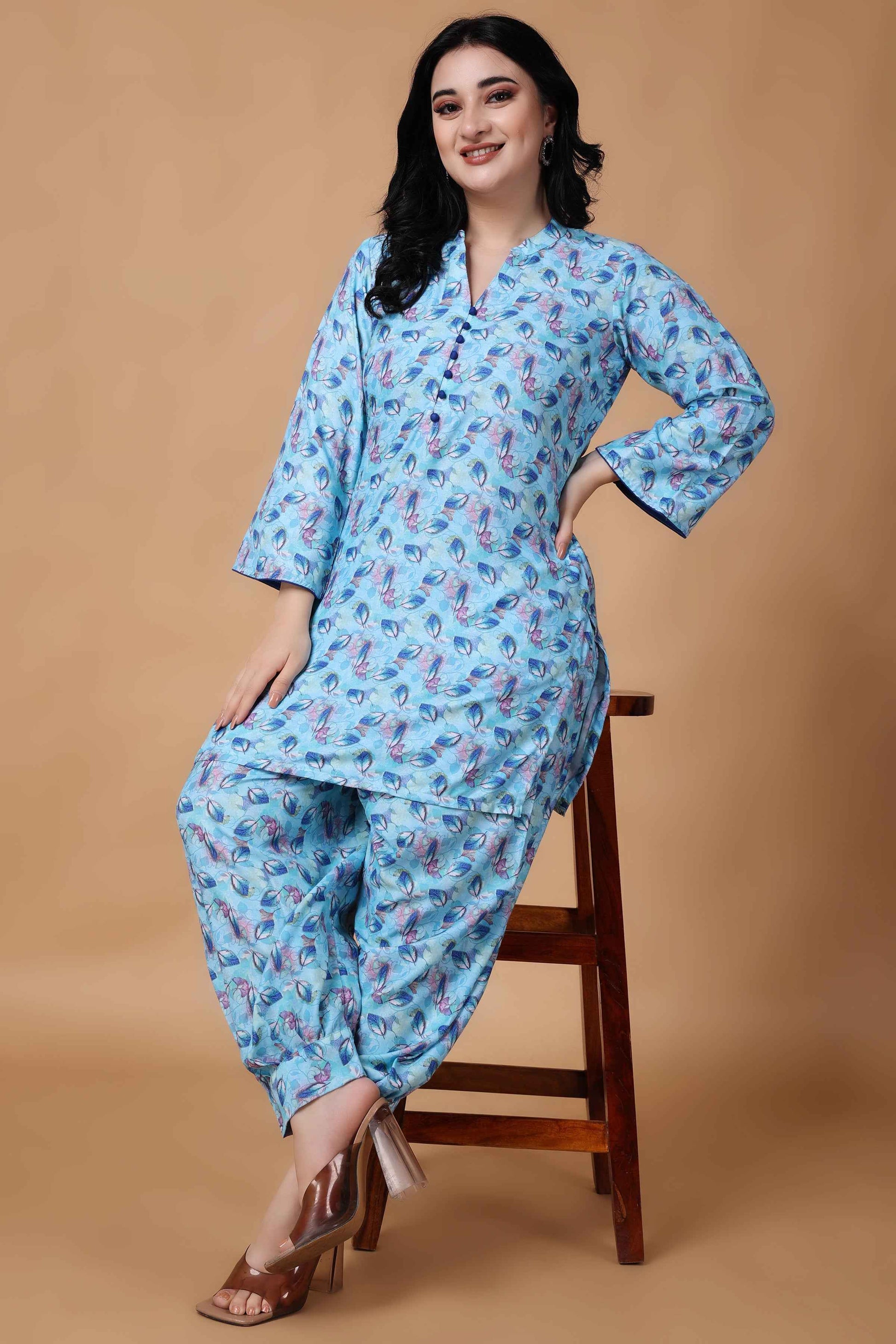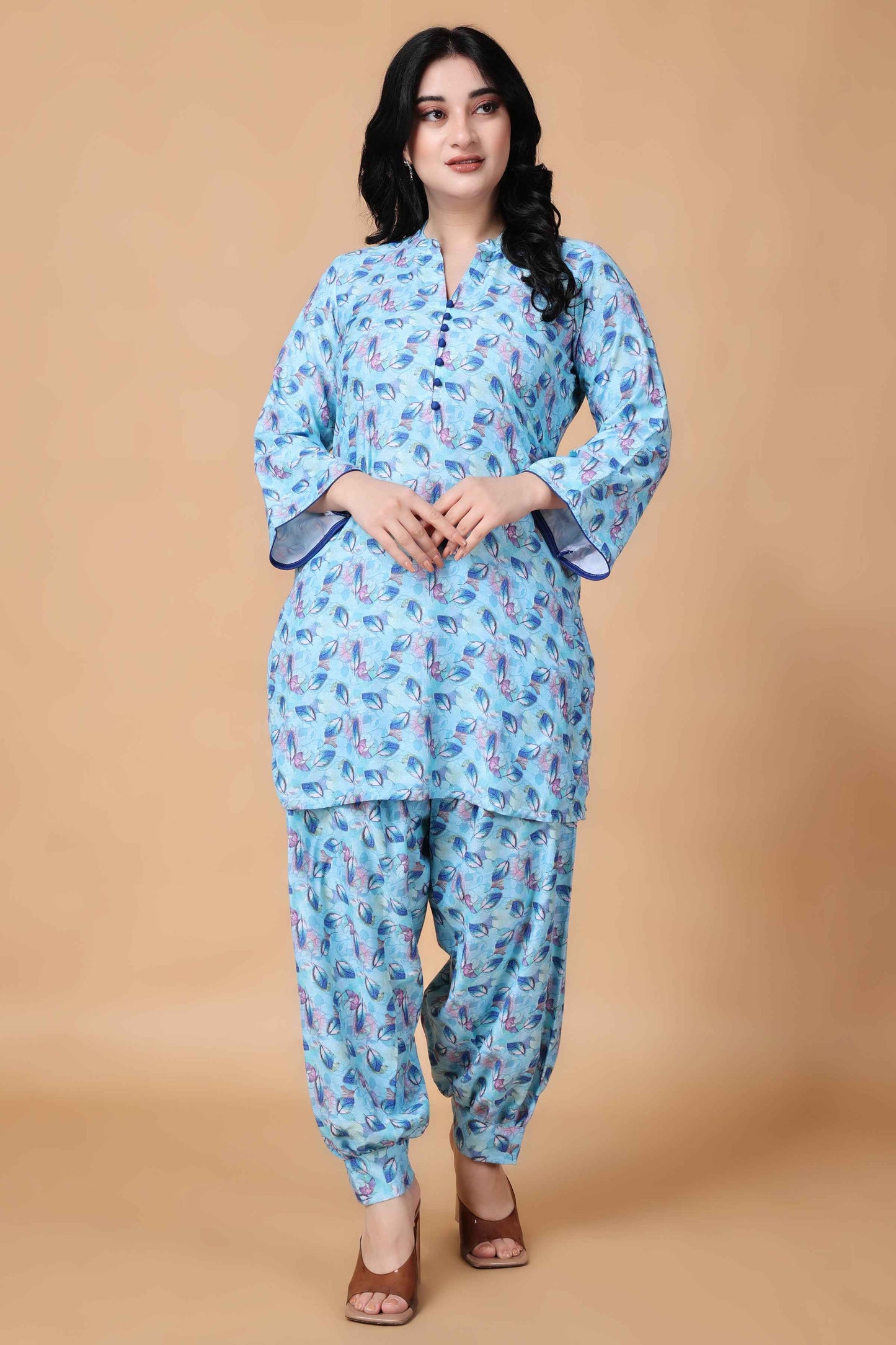 Introducing the Firozi Printed Modal Co-ord Set, a stylish and comfortable ensemble designed for the summer season. This set features a vibrant floral print all over, mandarin collar with potli buttons and quarter sleeves. The matching bottoms feature an elastic waistband and double pockets. Designed for both style and convenience, the Firozi Summer Modal Co-ord Set is perfect for a day out or casual gatherings.