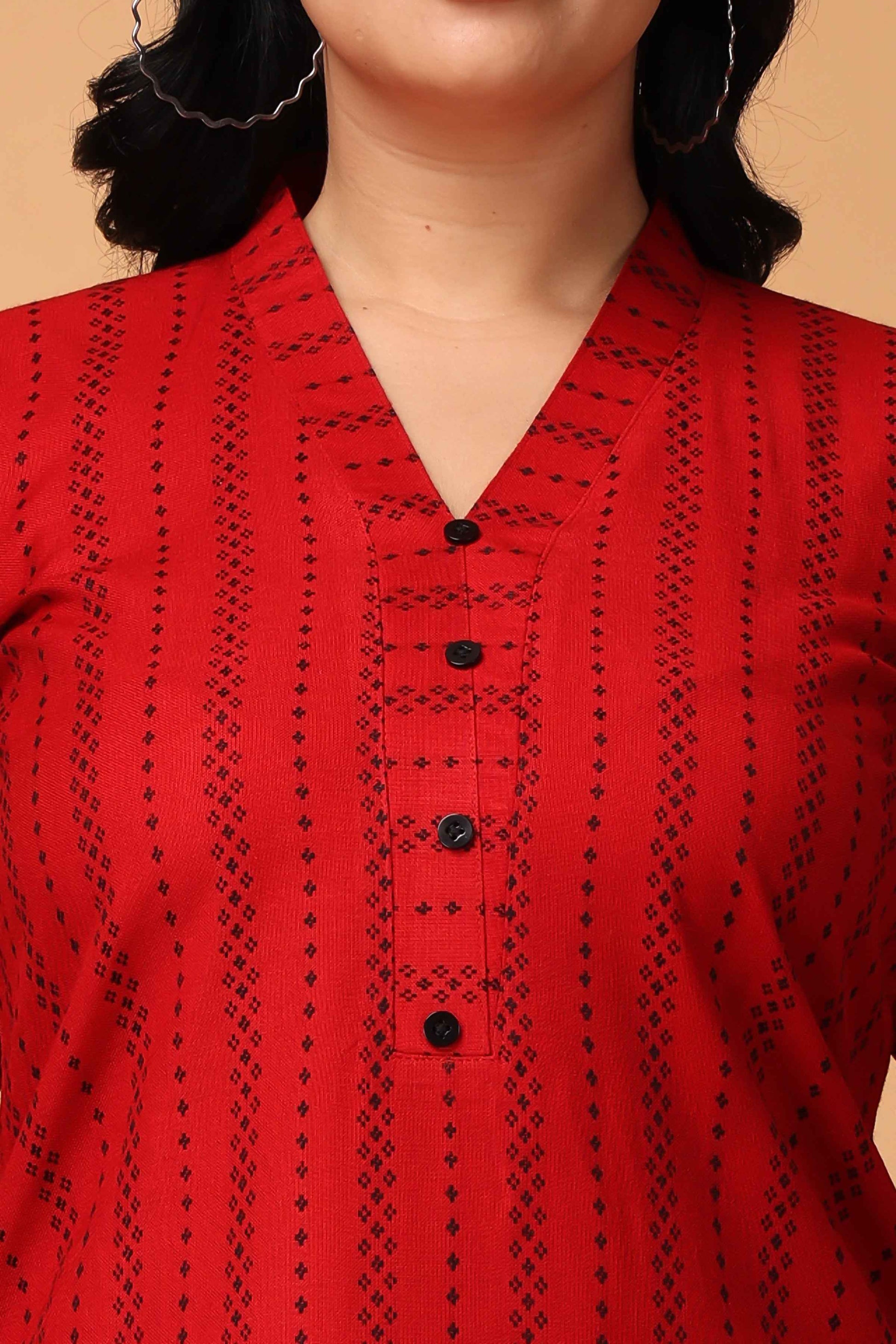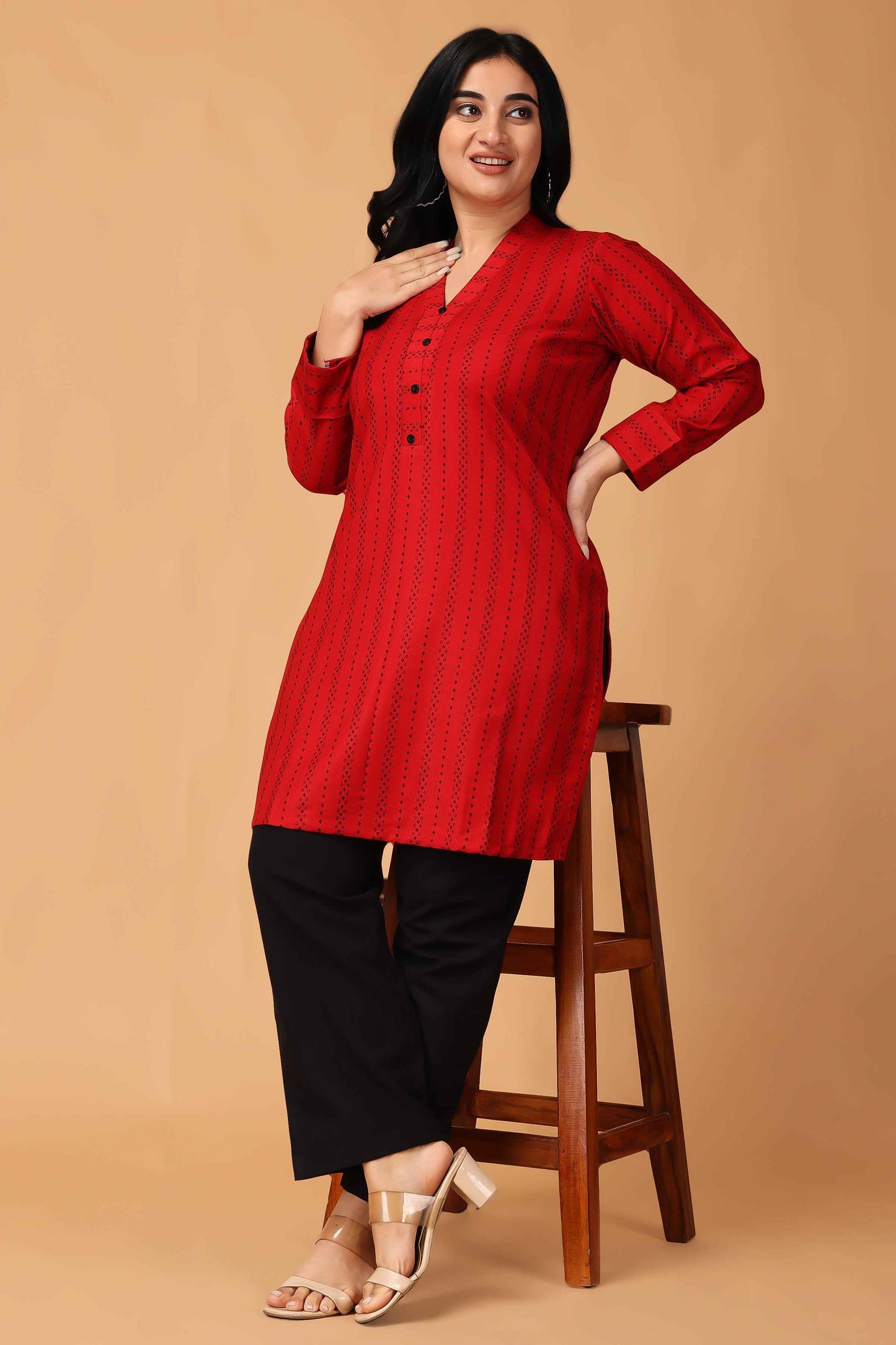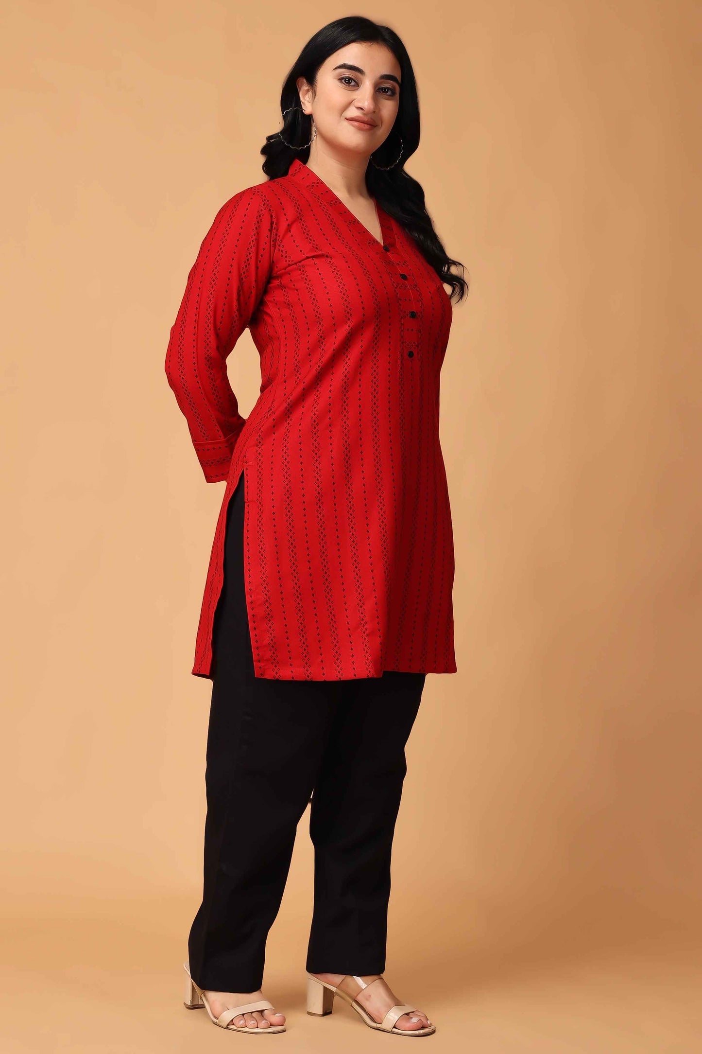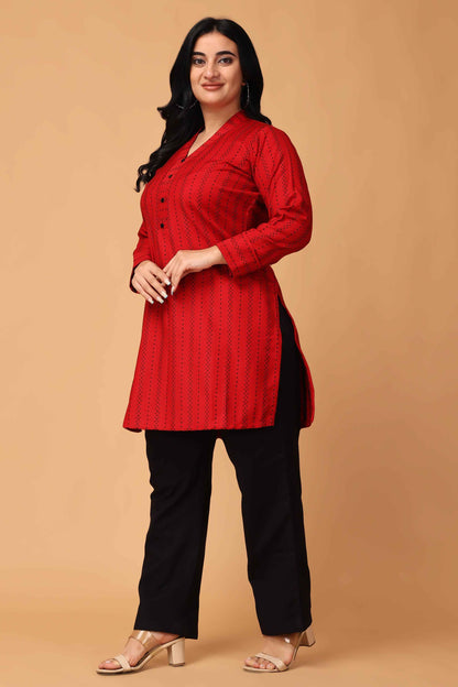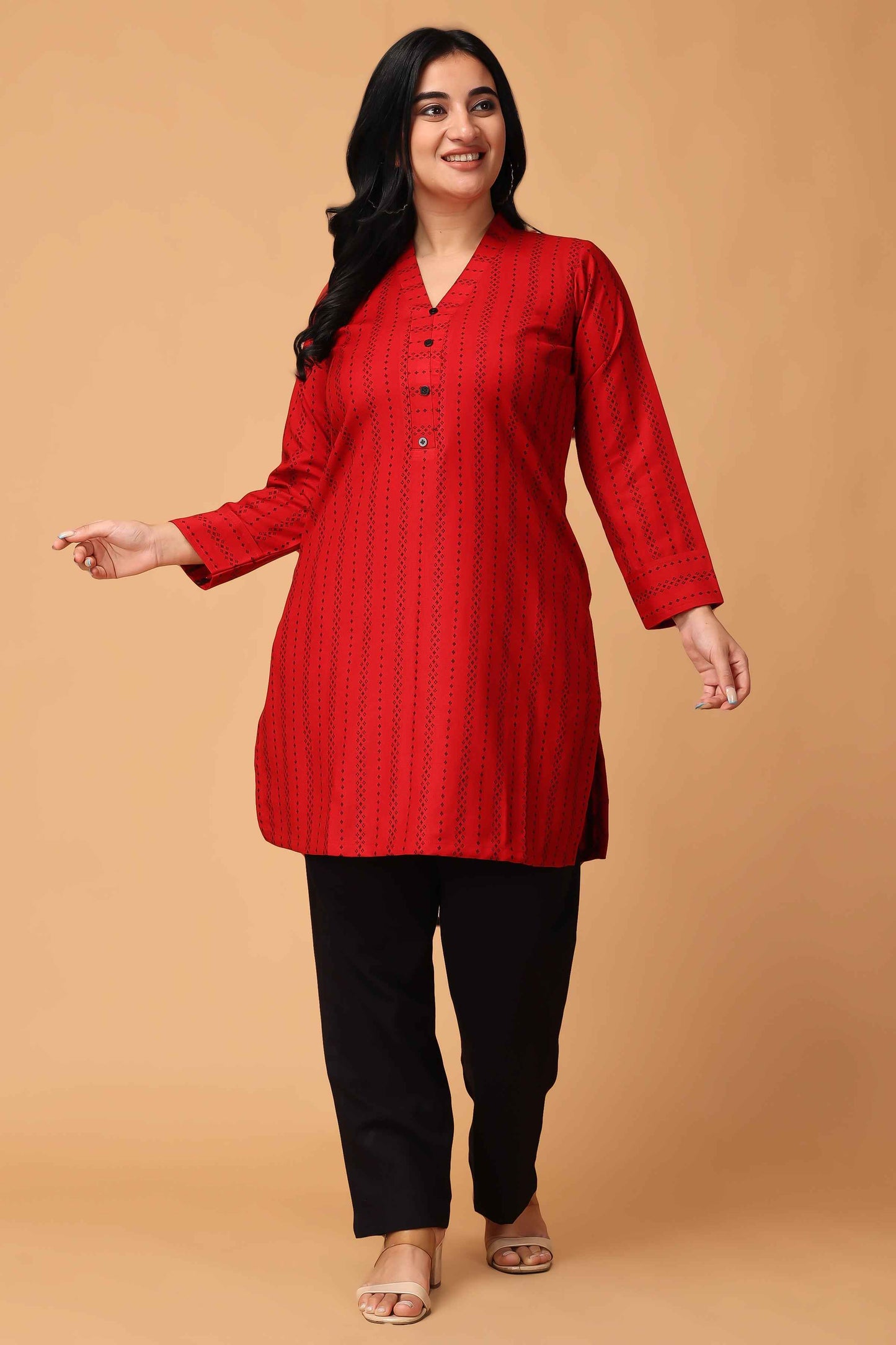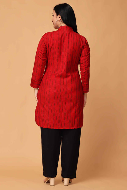 Cherish the timeless elegance of this deep Red Woollen Kurta, adorned with enduring grace. With a mandarin neck and full sleeves, the kurta showcases stylish stripe all over. Pair it effortlessly with palazzo pants, accessorize with oxidized earrings and complete the look with sandals for a chic and comfortable ensemble perfect for any relaxing day out.