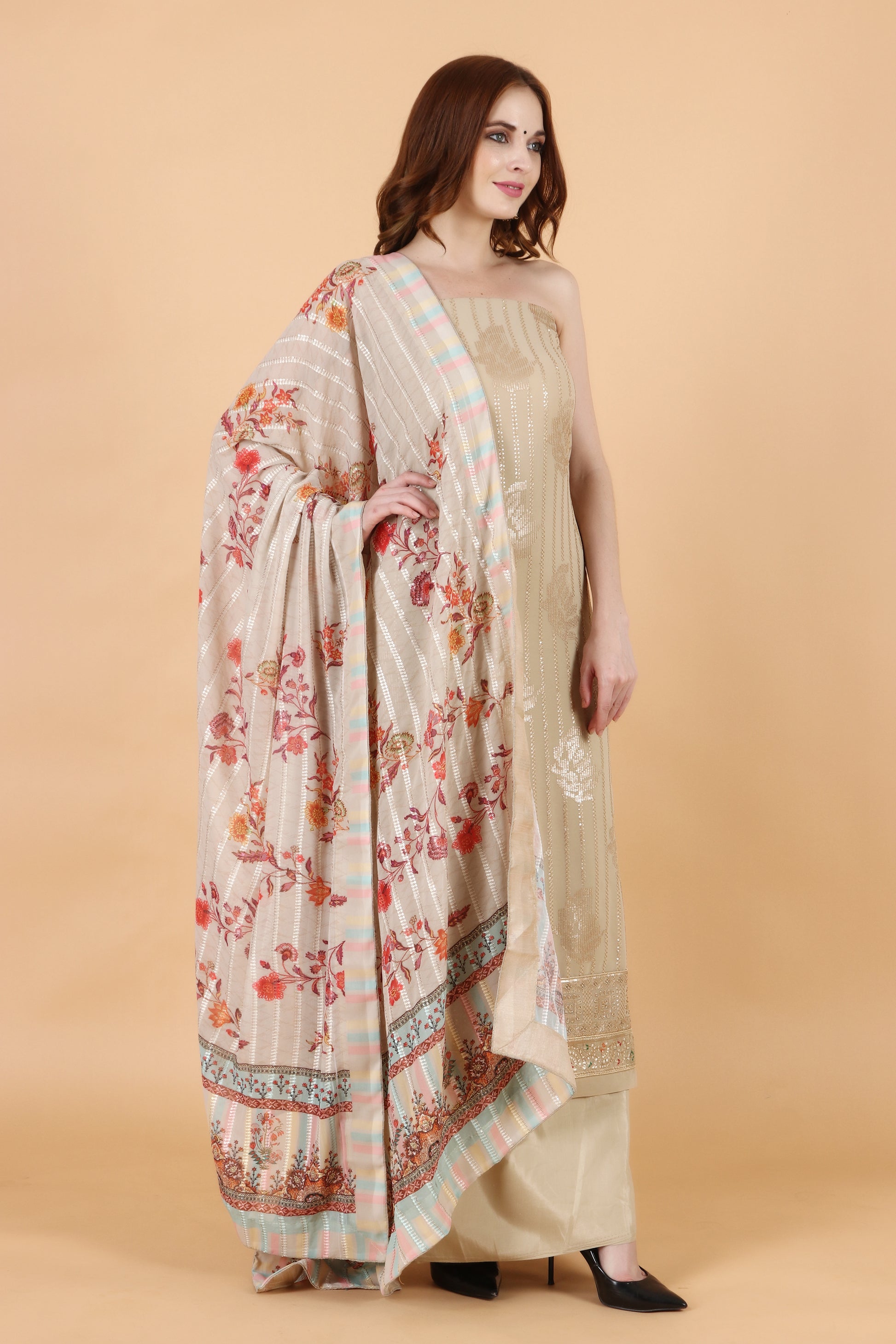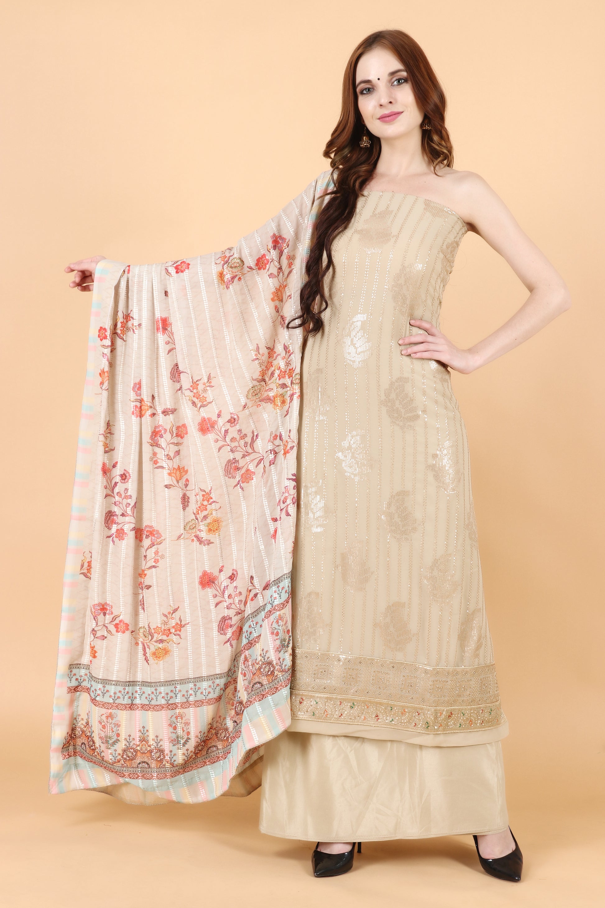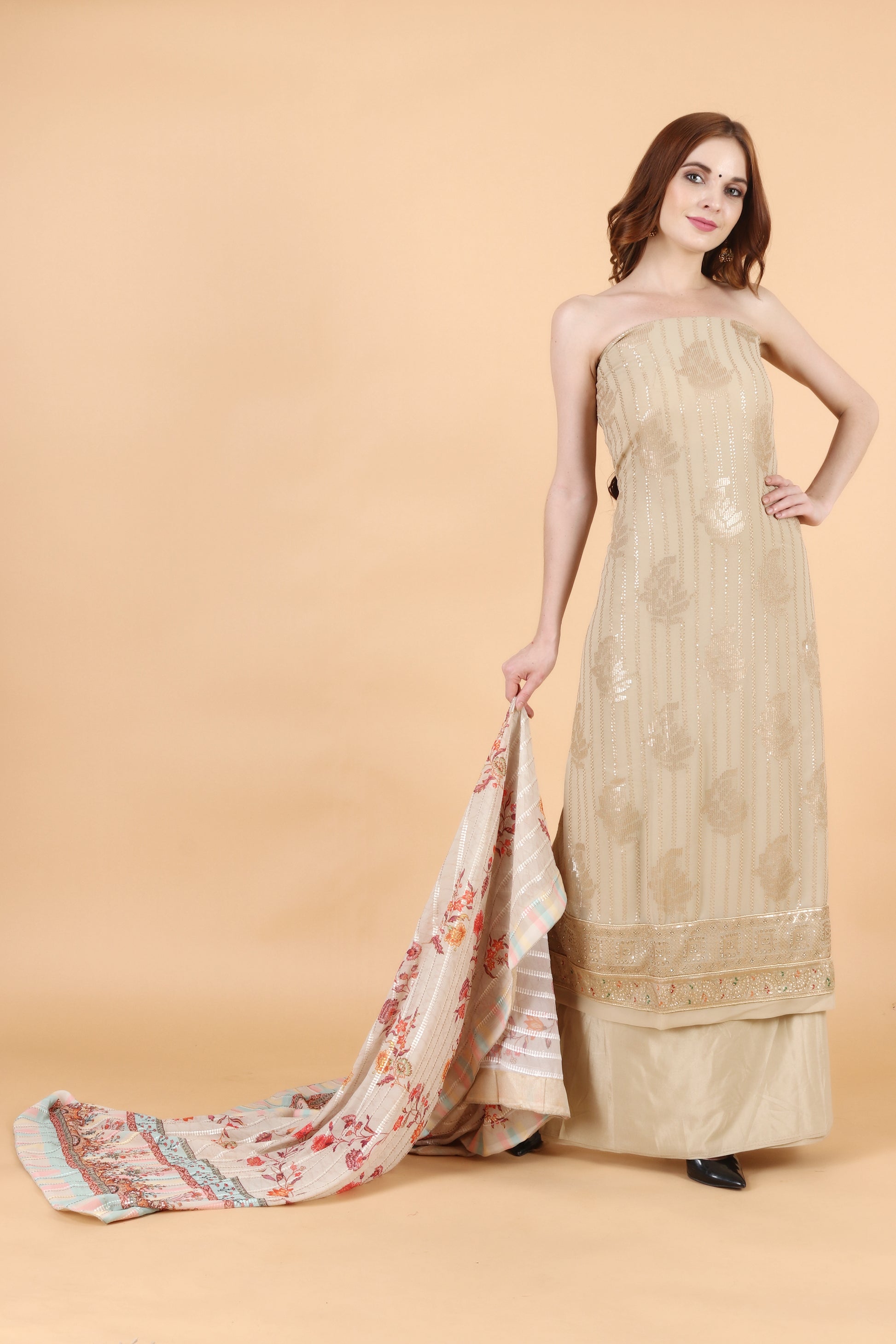 - The unstitched salwar suit is elevated with thread & intricate sequin work