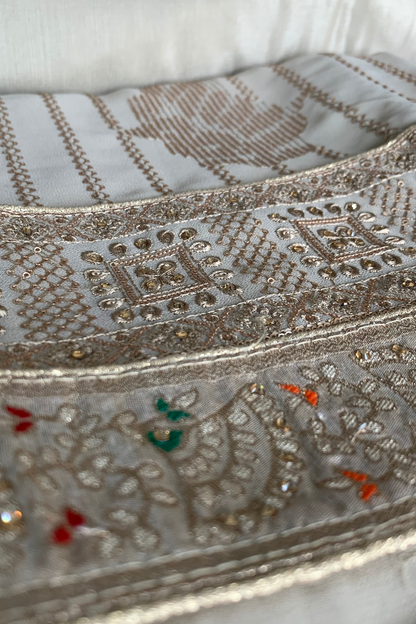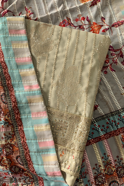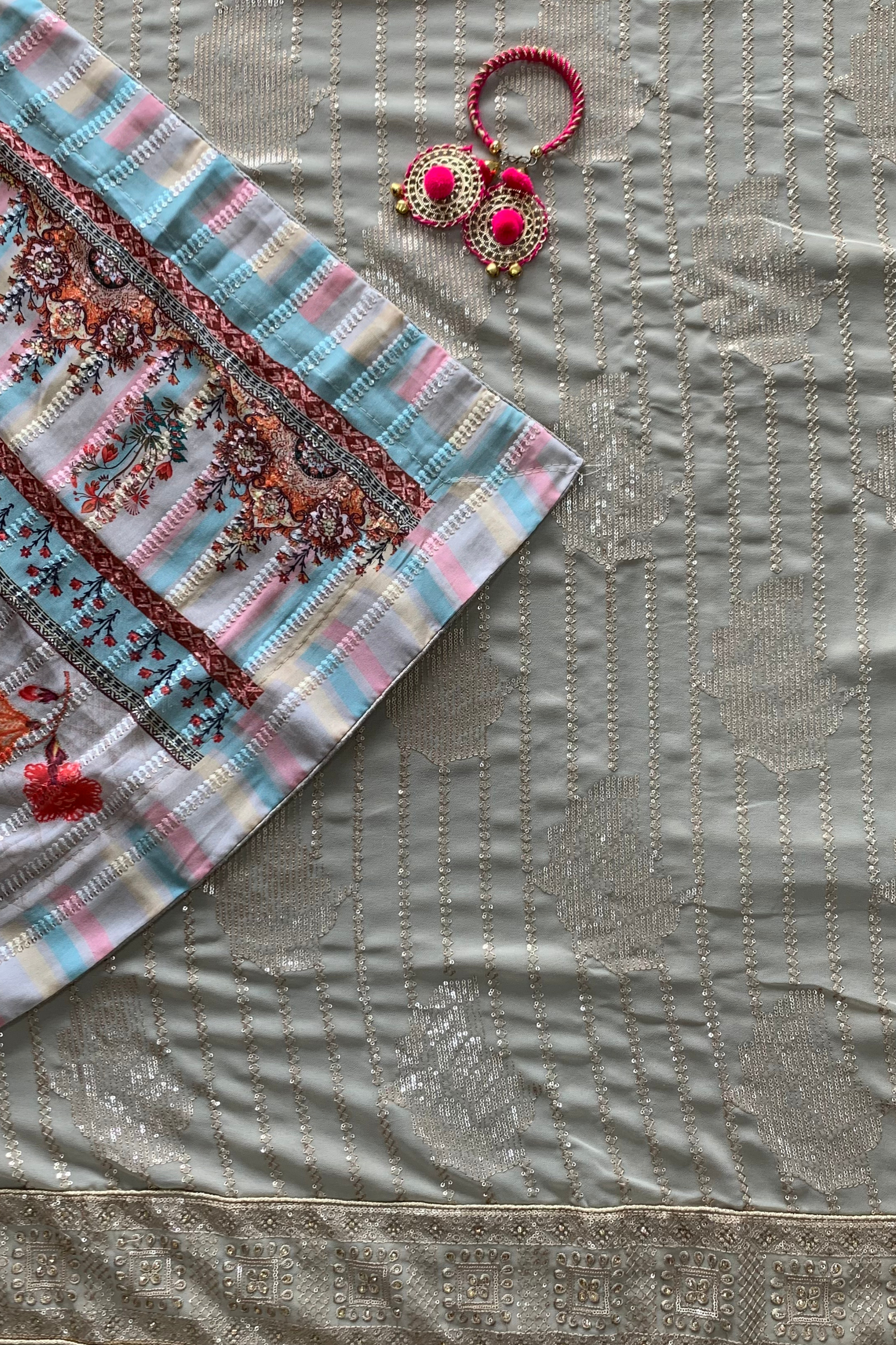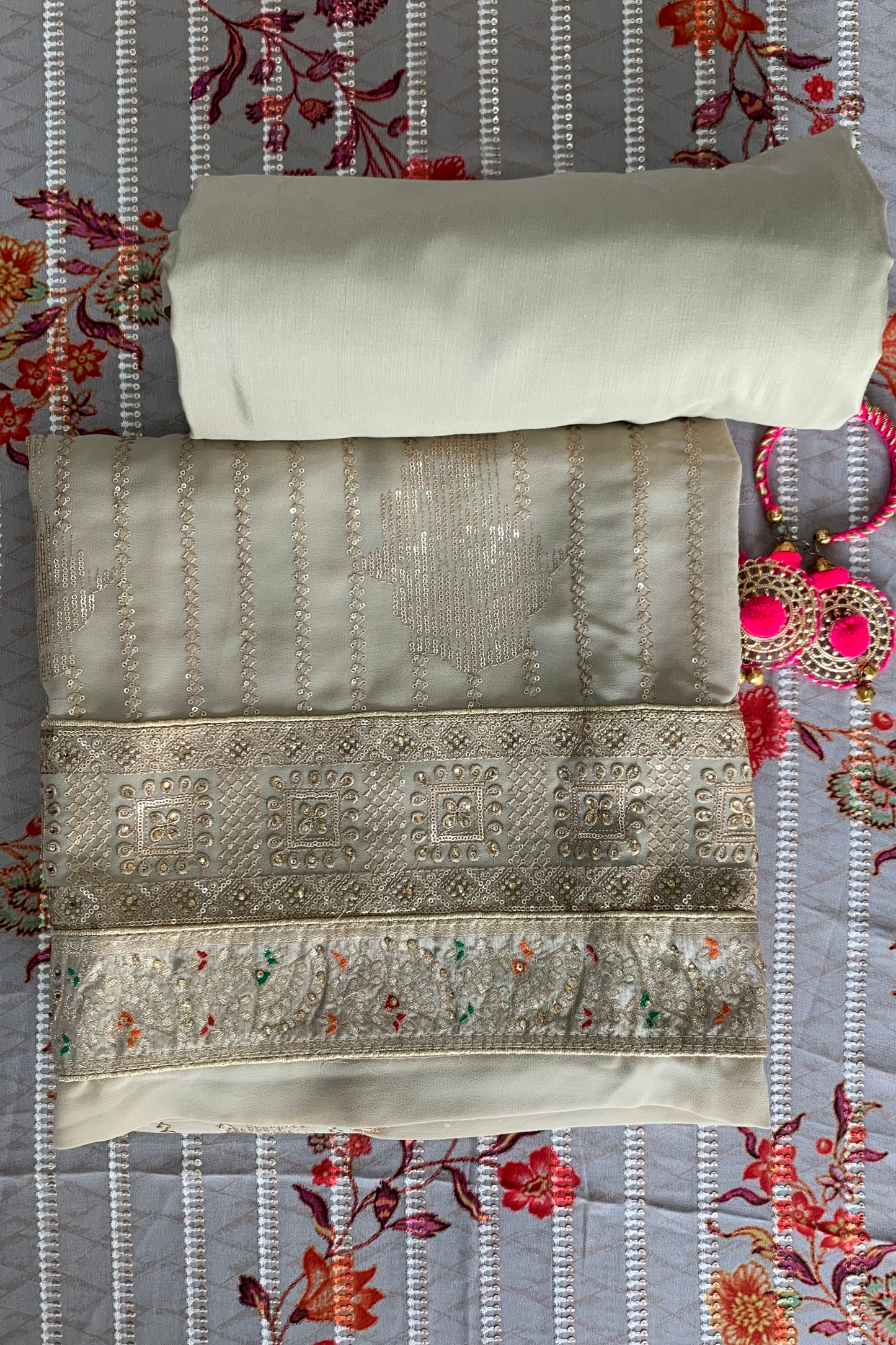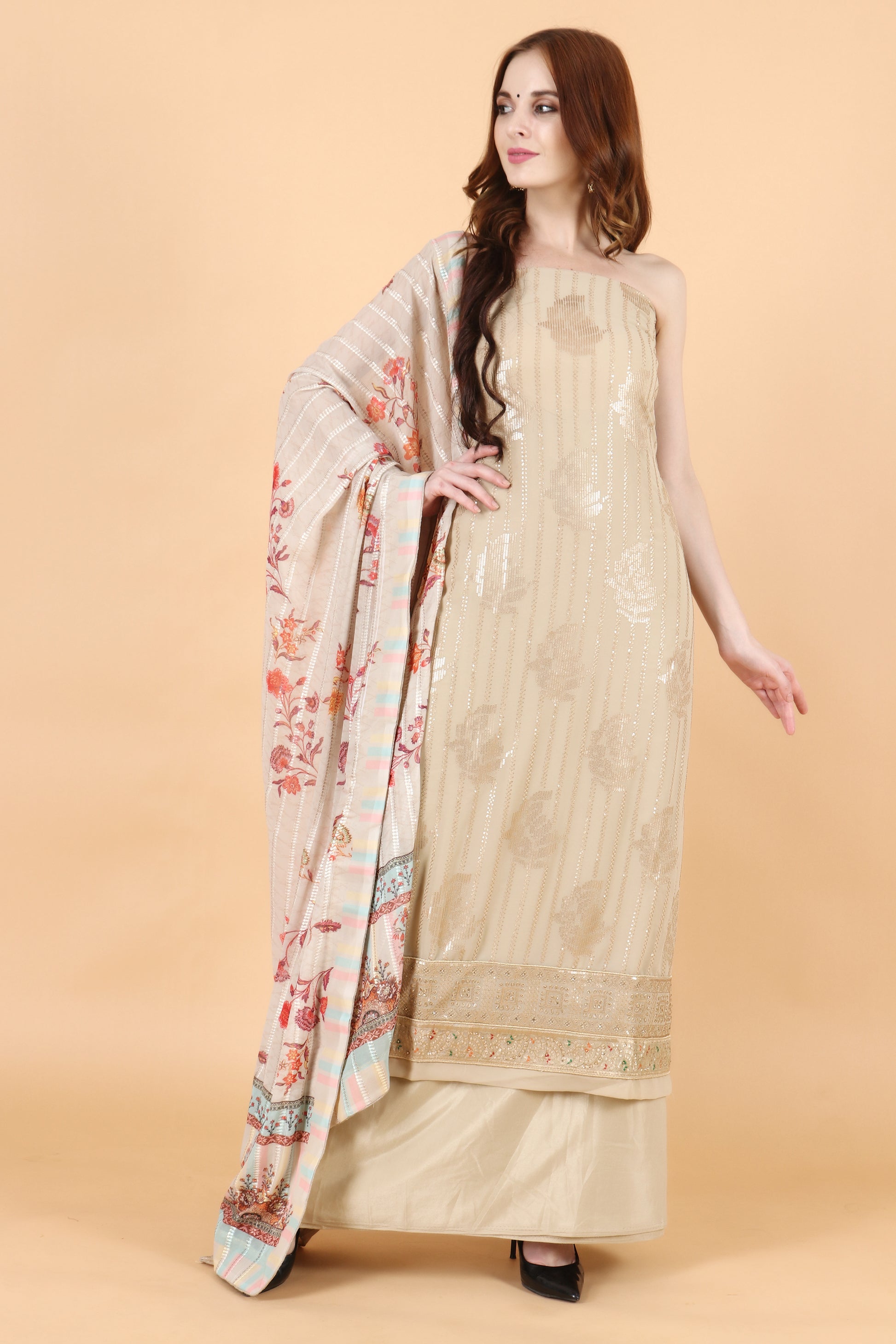 - The unstitched salwar suit is elevated with thread & intricate sequin work