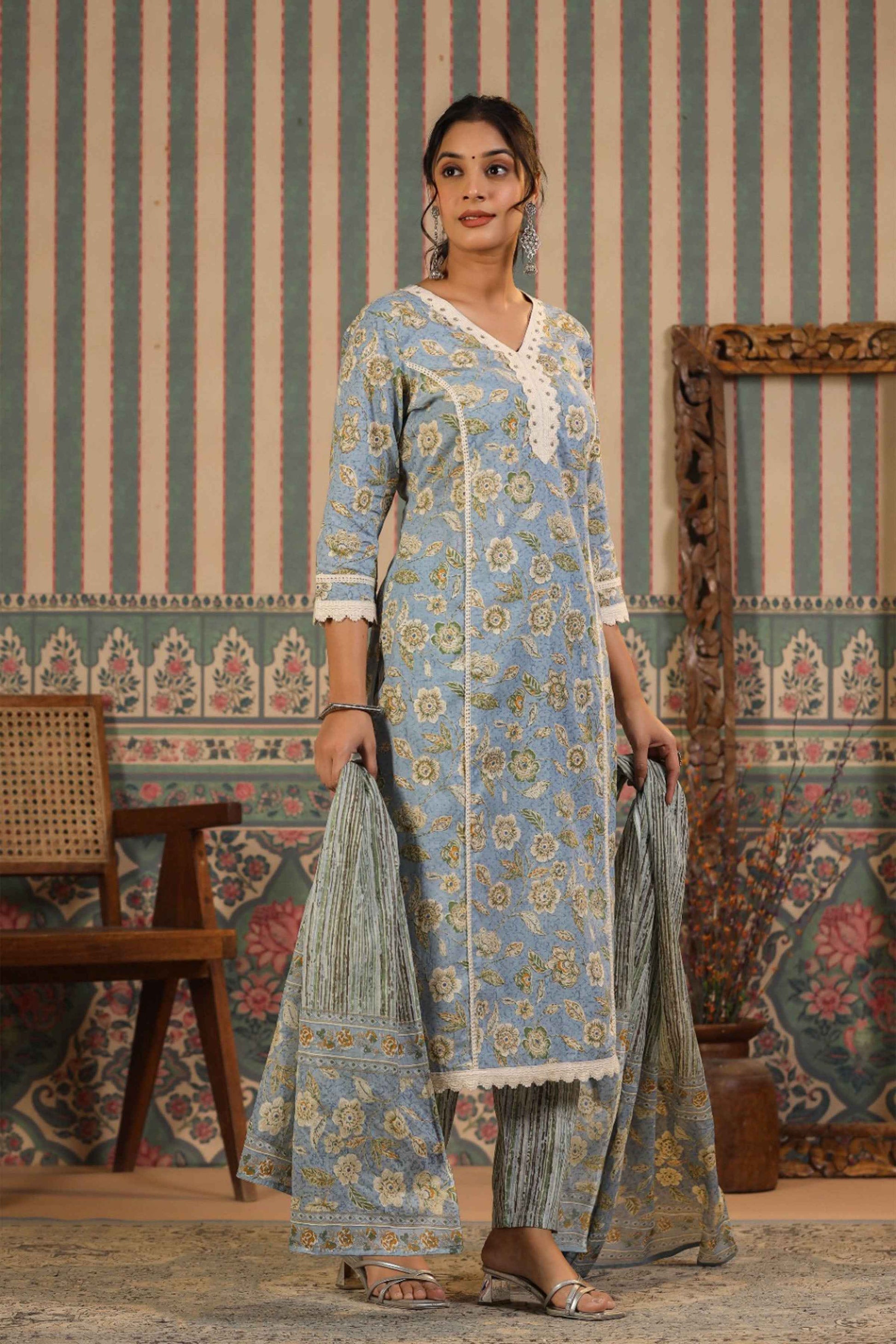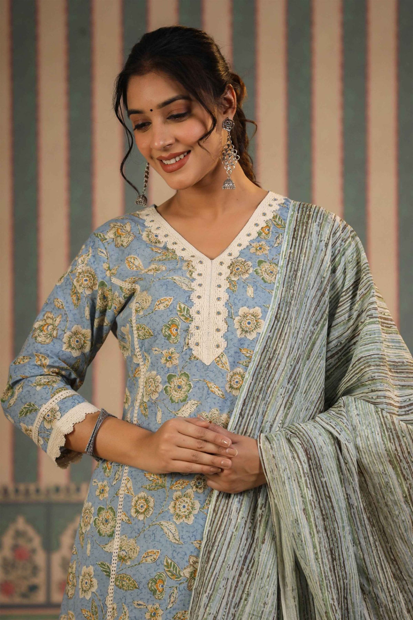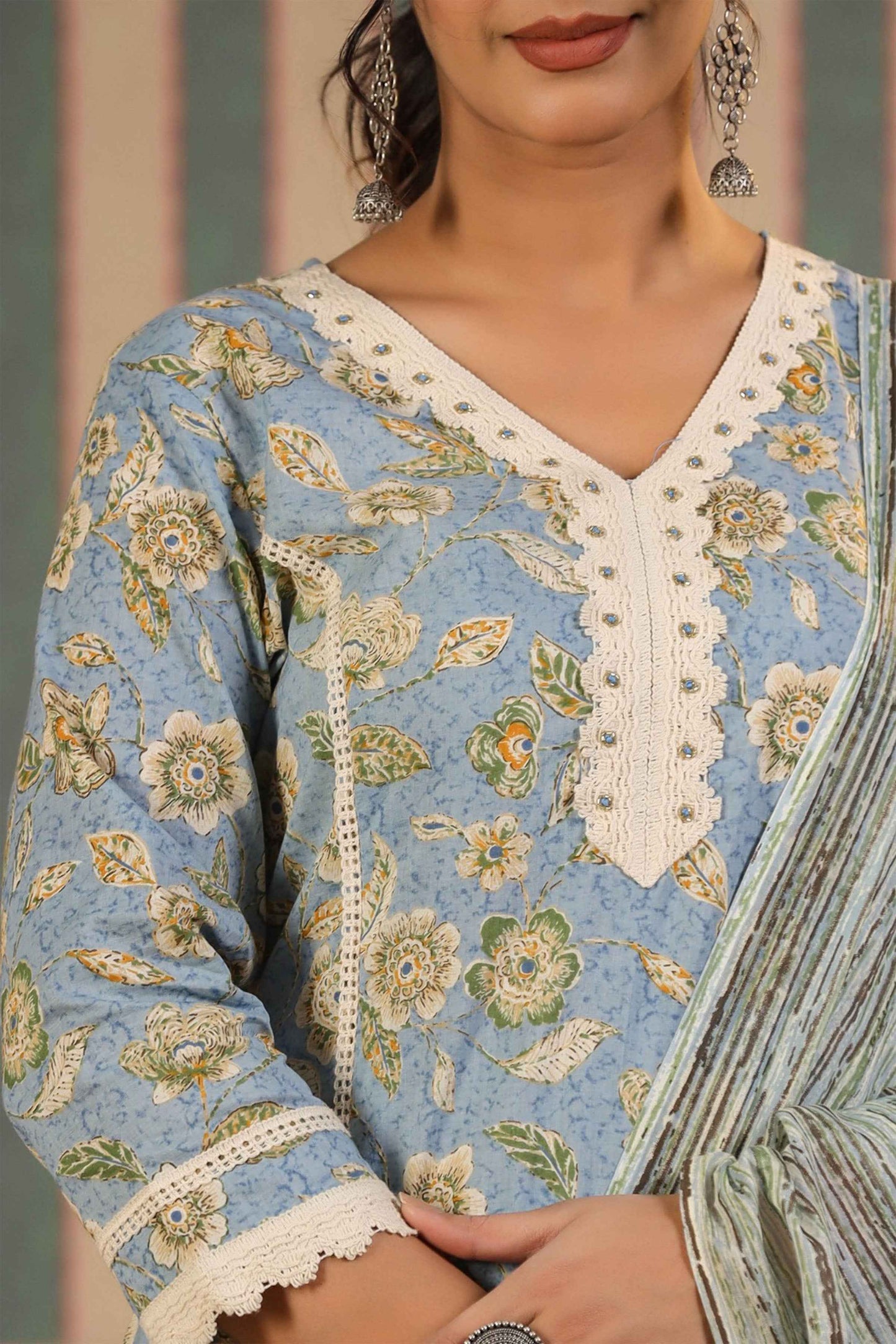 Turn heads wherever you go with the stunning Grey Lace Accent Suit Set. Crafted from soft cotton fabric with an all-over floral print, this exquisite outfit features a V-neckline with crochet lace detailing, two side lace accents, and lace trim on the hemline and quarter sleeves. It is paired with matching palazzo pants and a printed dupatta, it's designed to ensure all eyes are on you.