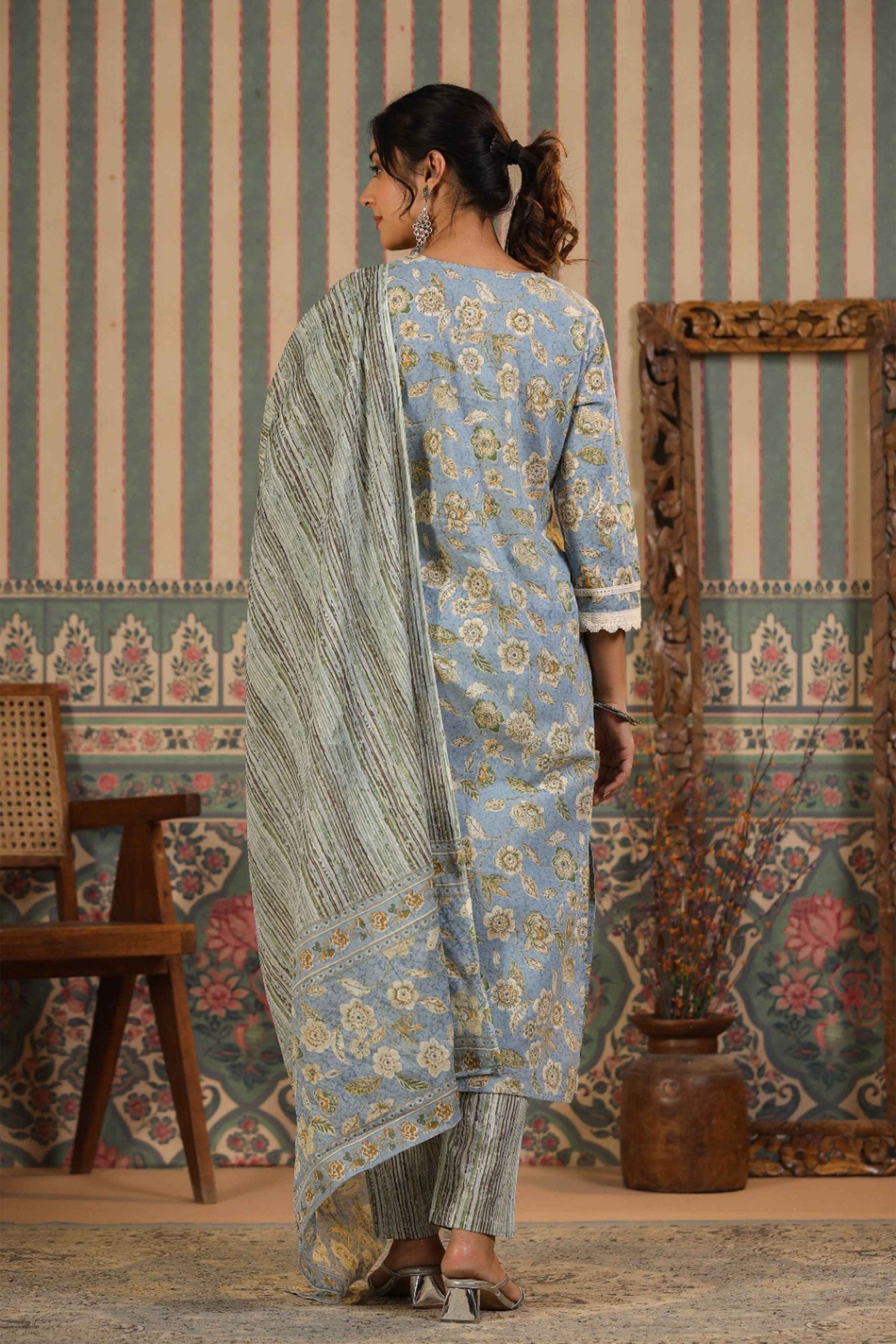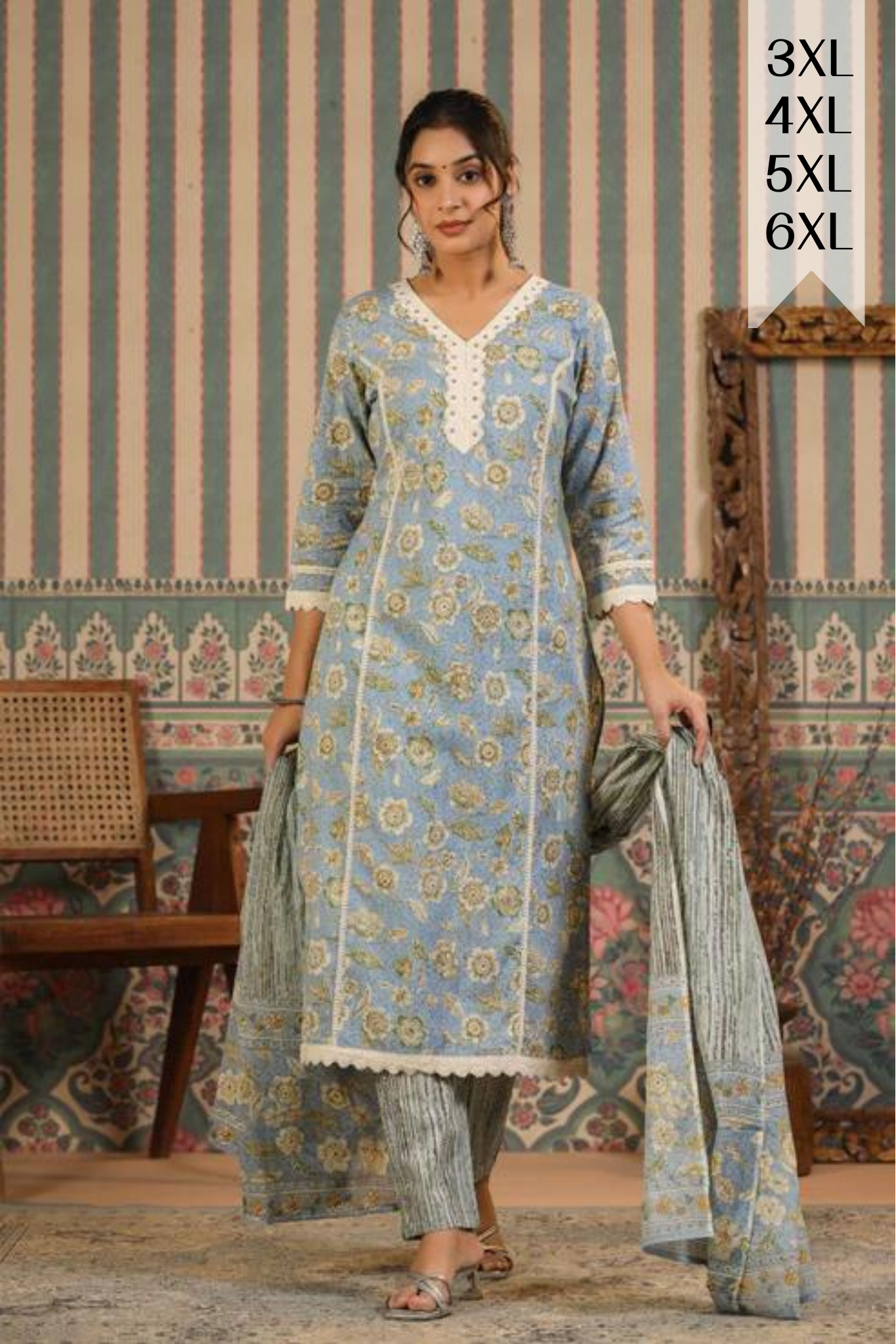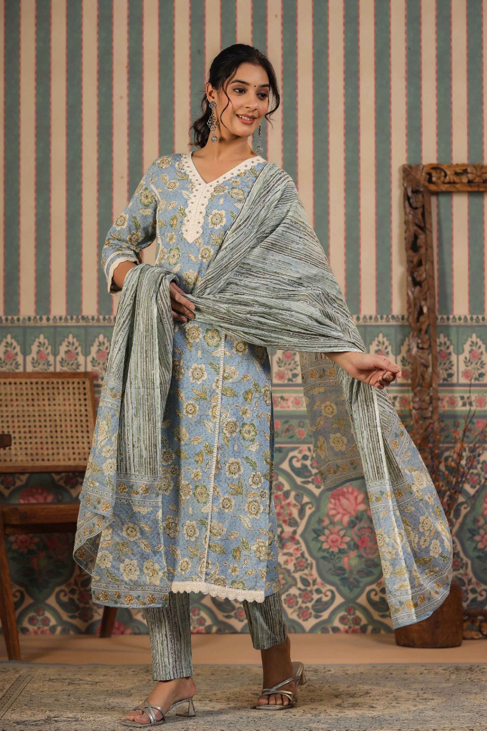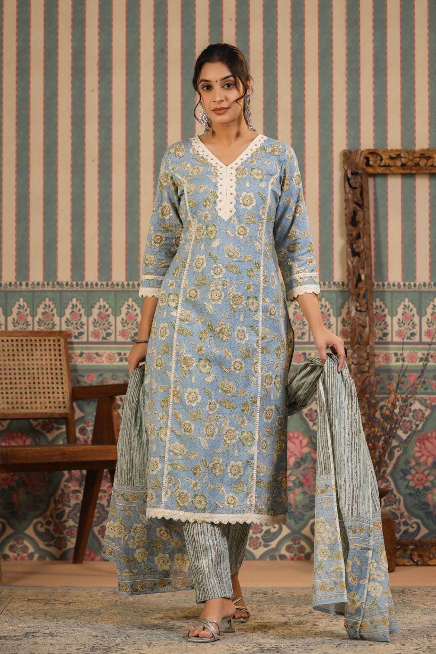Turn heads wherever you go with the stunning Grey Lace Accent Suit Set. Crafted from soft cotton fabric with an all-over floral print, this exquisite outfit features a V-neckline with crochet lace detailing, two side lace accents, and lace trim on the hemline and quarter sleeves. It is paired with matching palazzo pants and a printed dupatta, it's designed to ensure all eyes are on you.