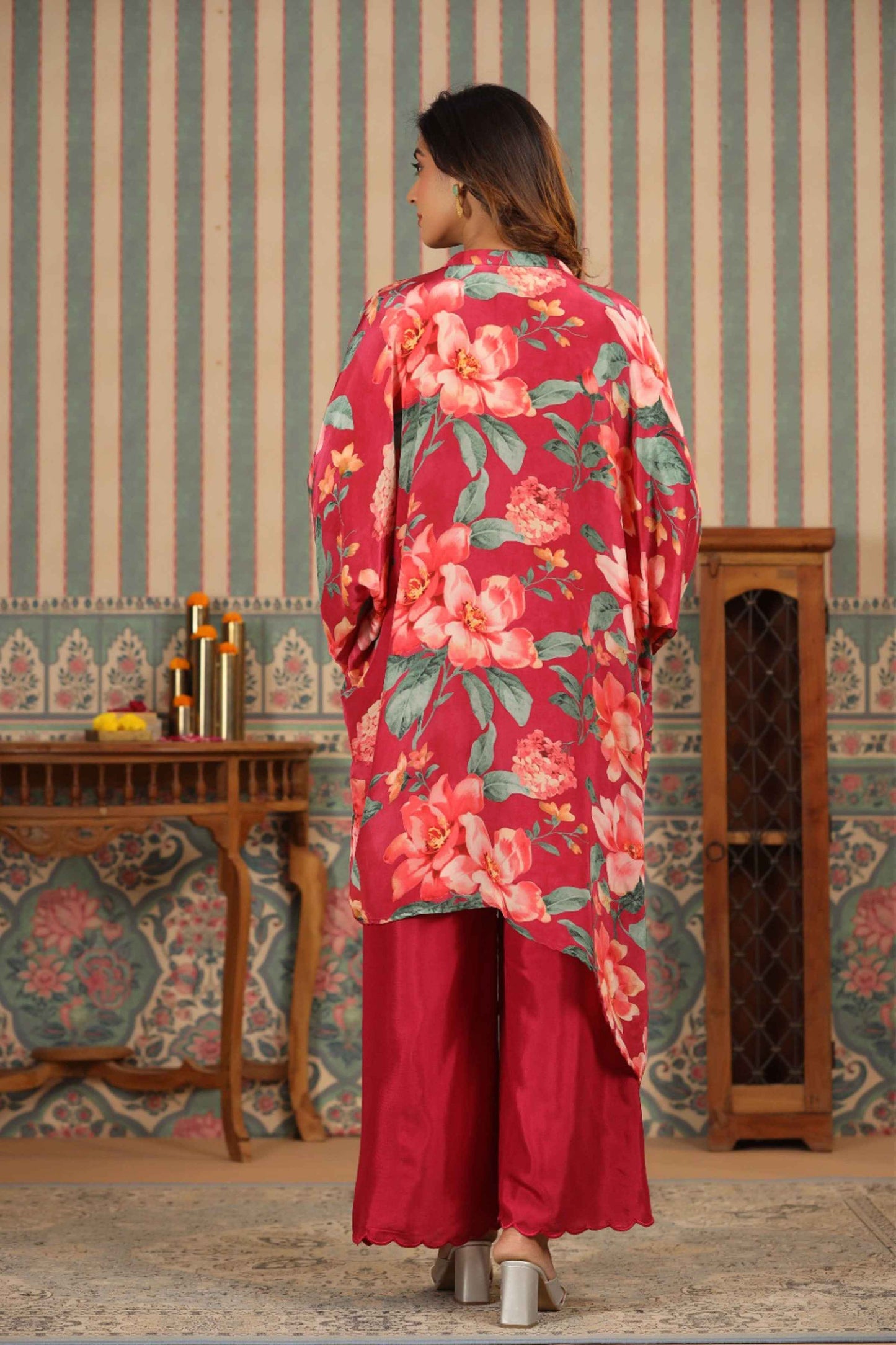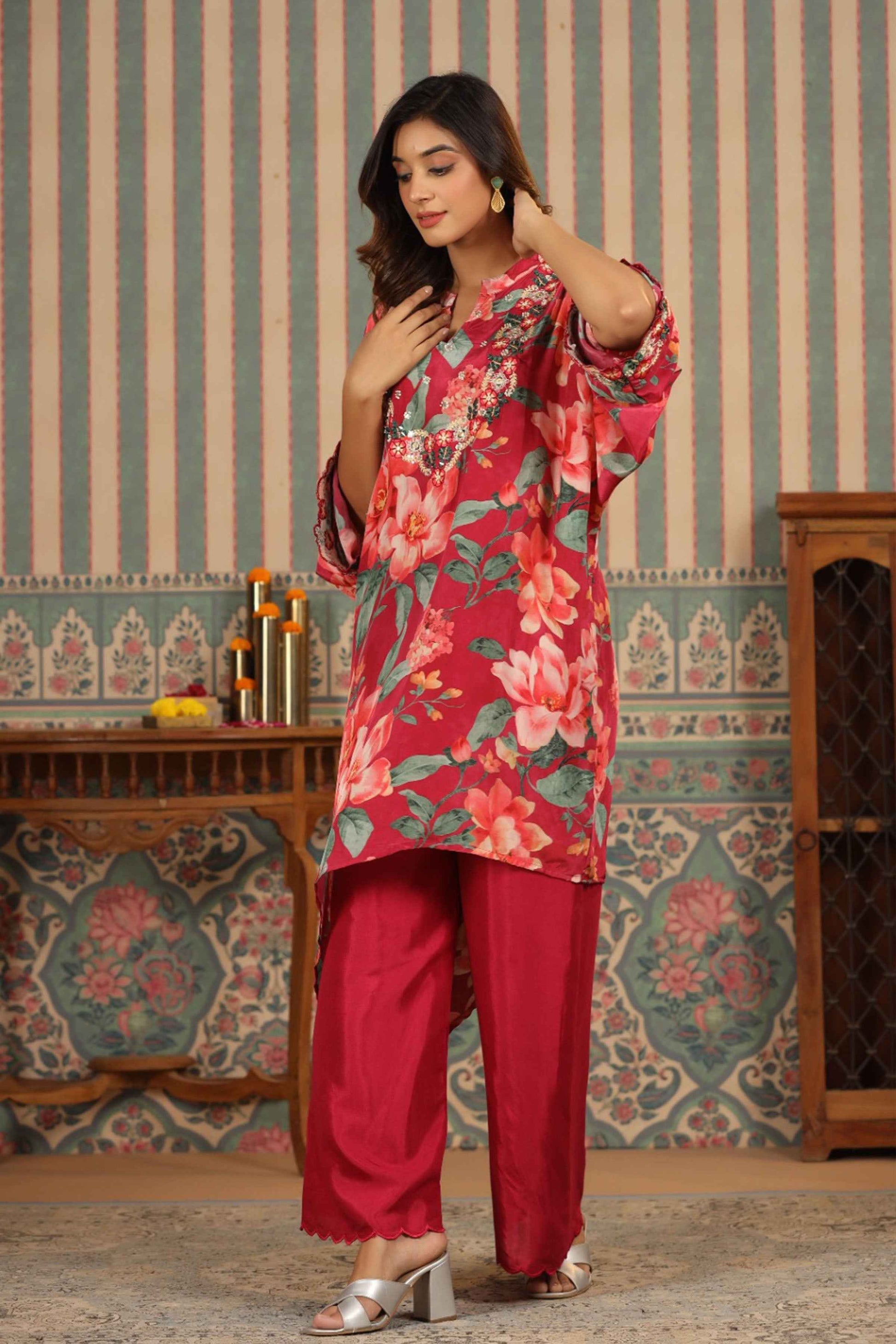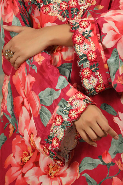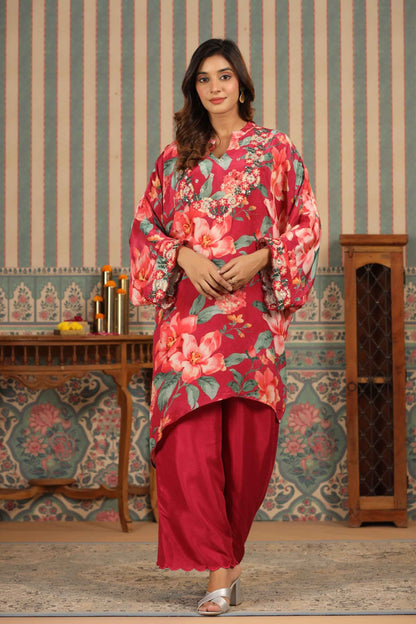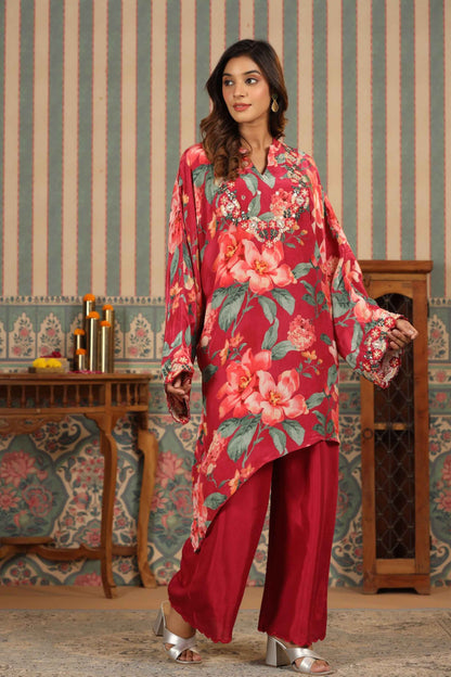 Step into elegance with our mesmerizing Hot Pink Floral Asymmetric Co-ord Set. Fashioned from muslin fabric, embellished with a charming floral print, it boasts a mandarin neckline and intricate floral embroidery adorning the neckline and full sleeves. Complemented by plain palazzo pants, this ensemble effortlessly merges sophistication with comfort for an exquisite appearance.