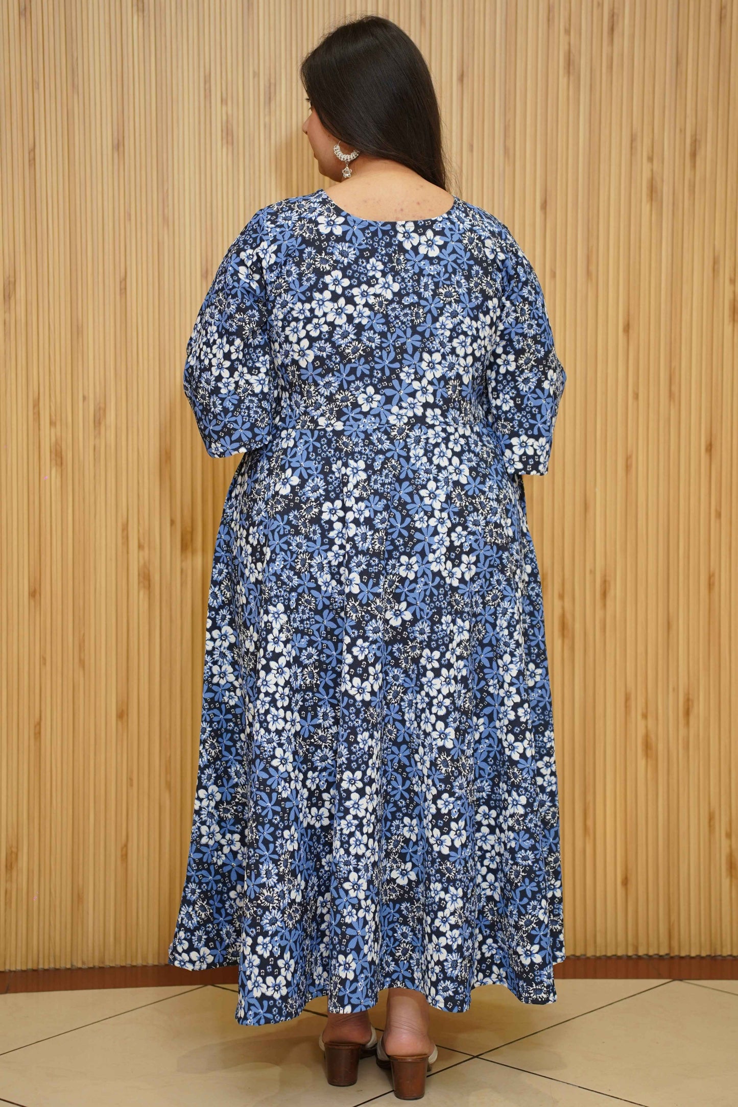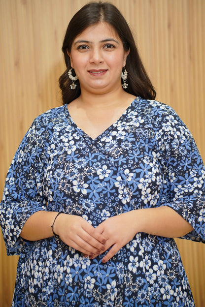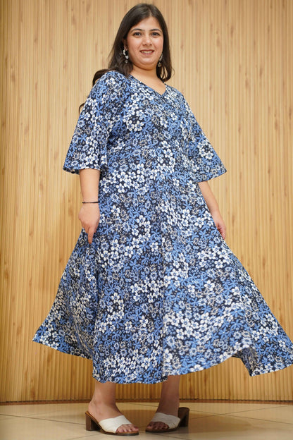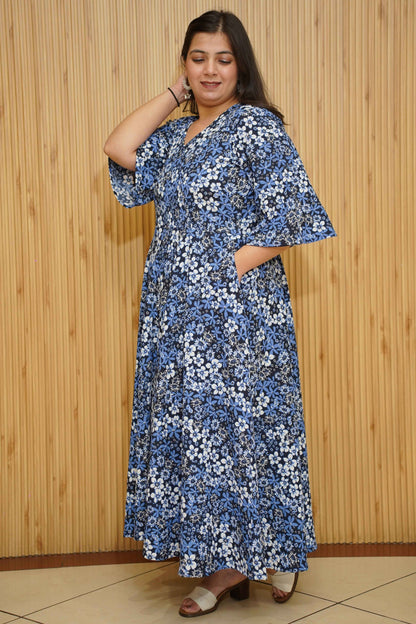 Unveil your beauty in the Indigo Blossom Floral Maxi Dress—where elegance meets vibrancy! Crafted from polyester, this dress features a striking print all-over, a V-neckline with an angrakha pattern, and a flattering silhouette with flared sleeves, offering both style and comfort for any occasion.