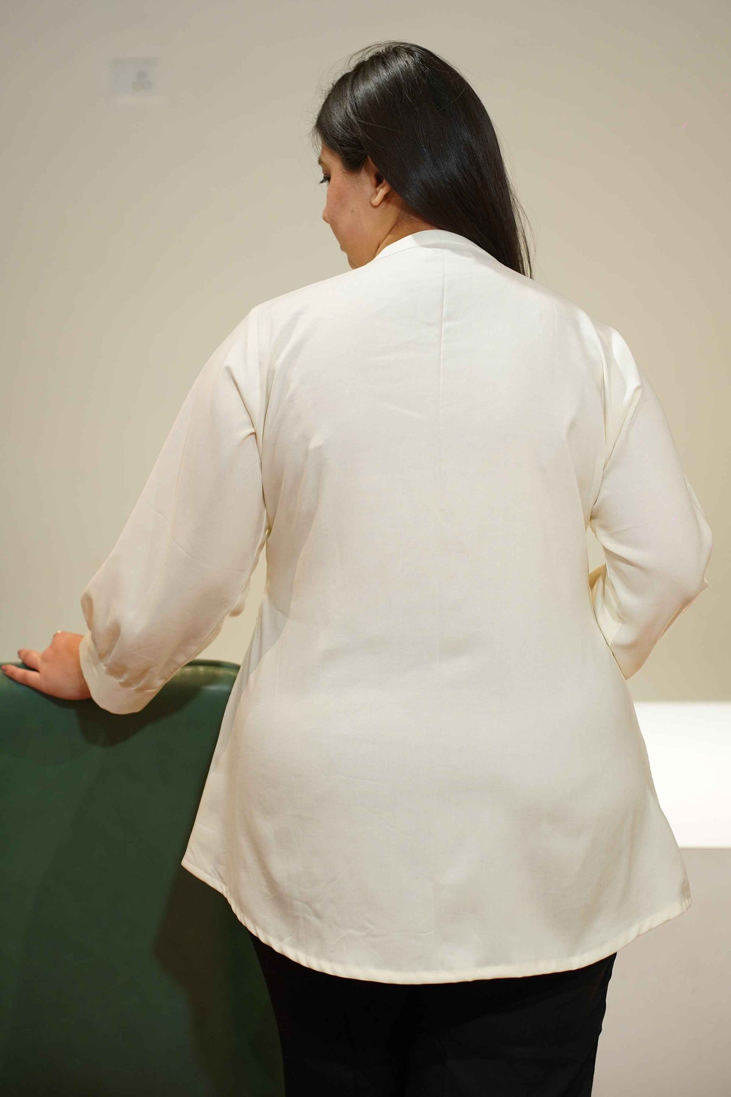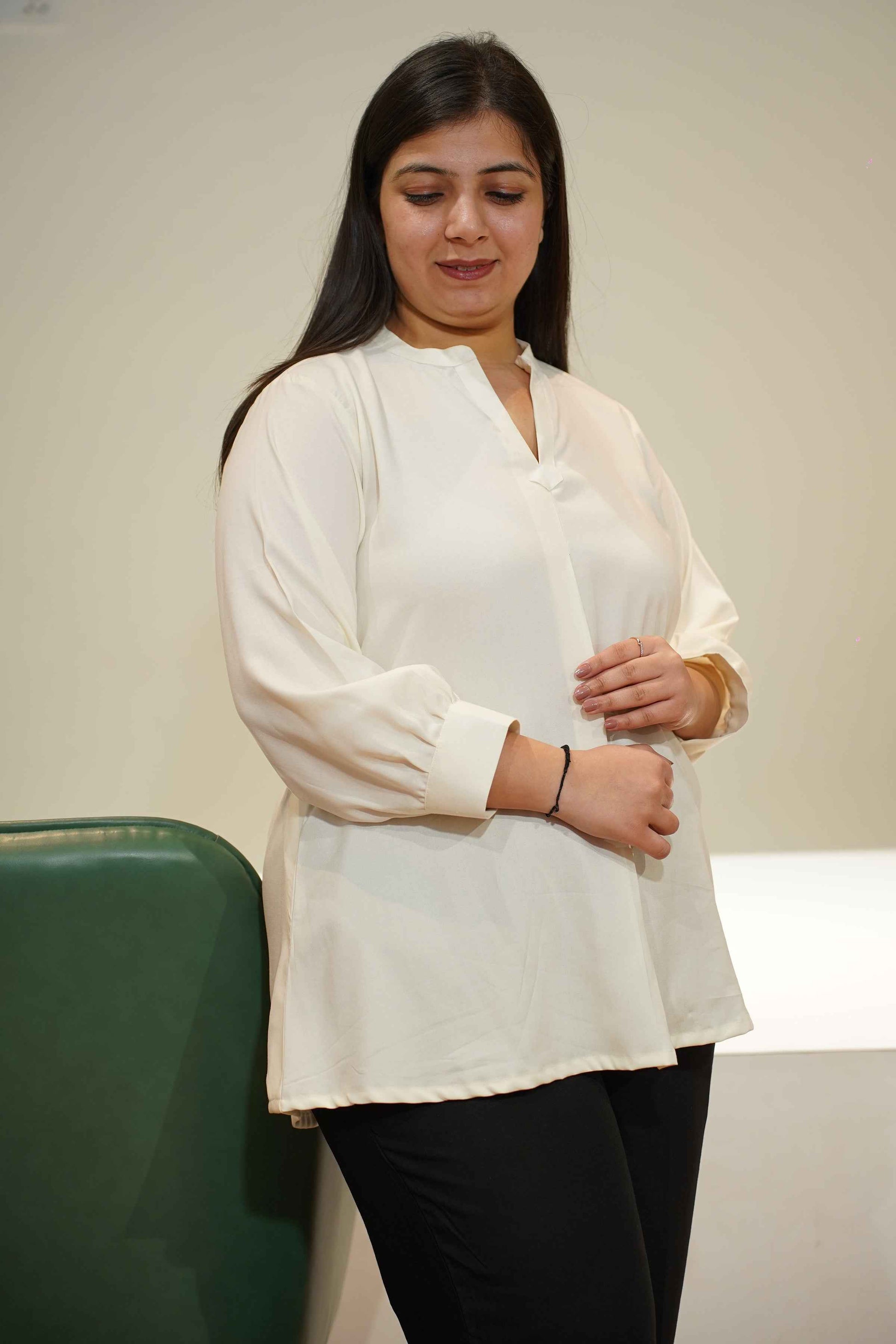 - Solid ivory-colored pleated top