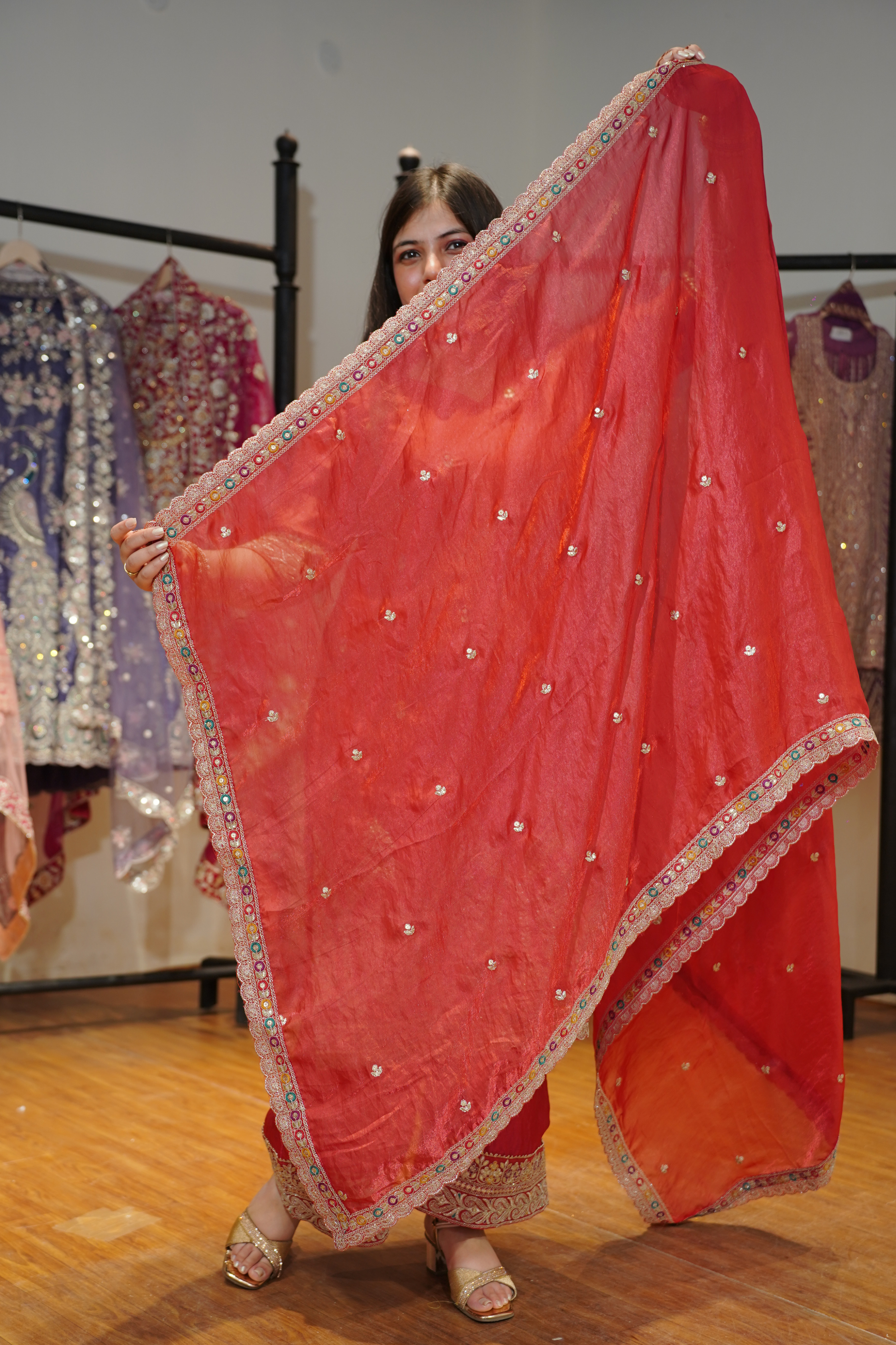 - Paired with four sided scalloped border Dupatta