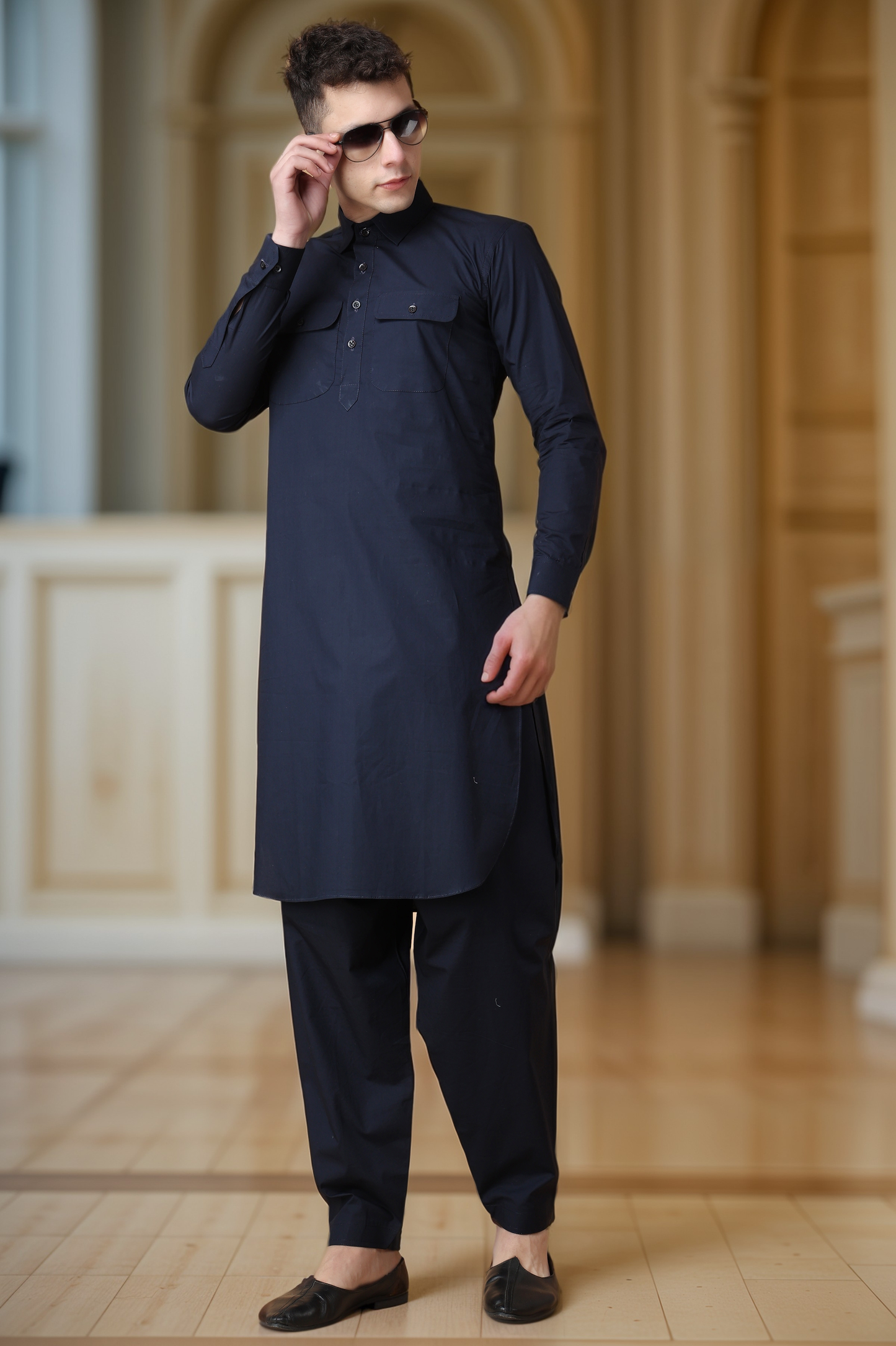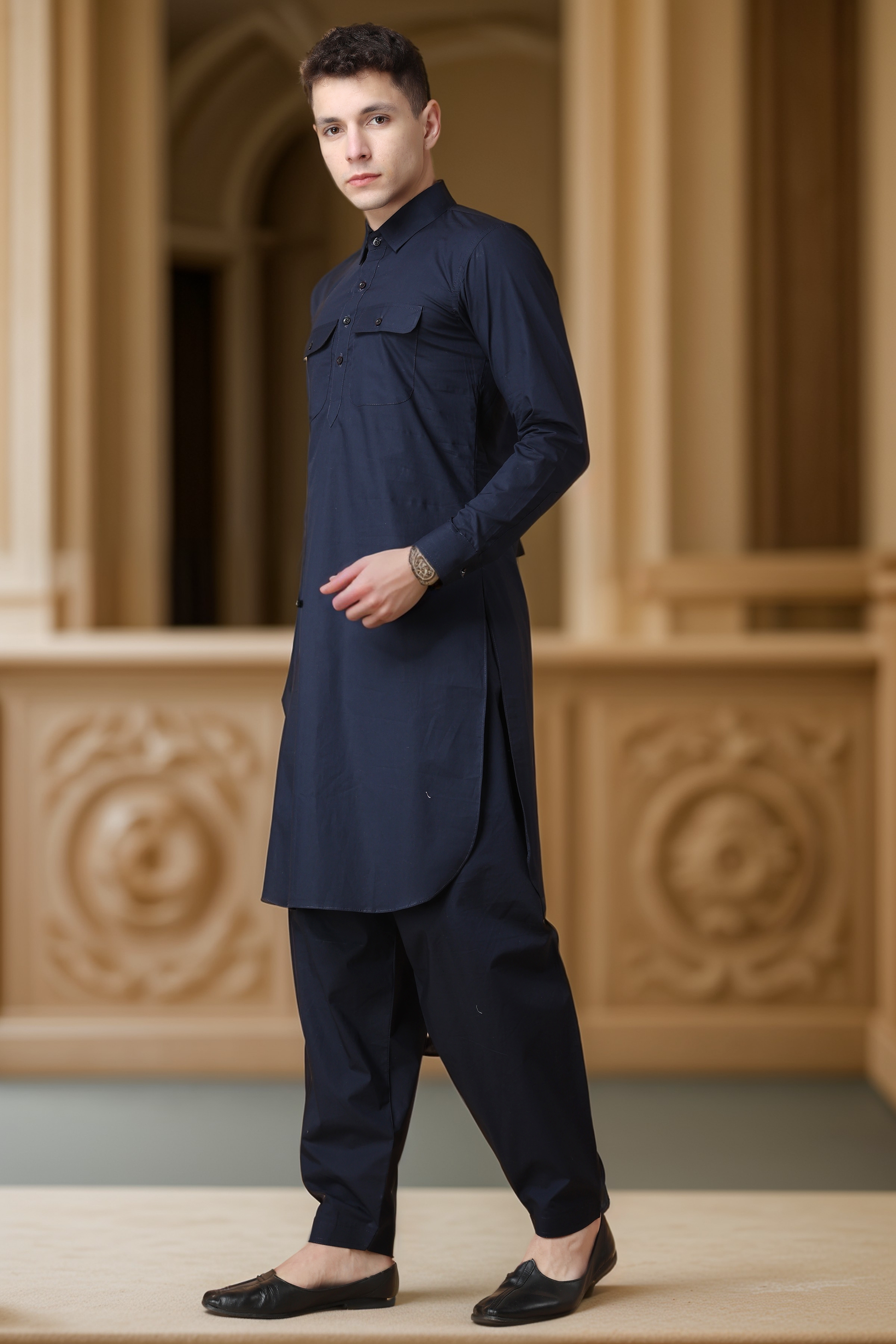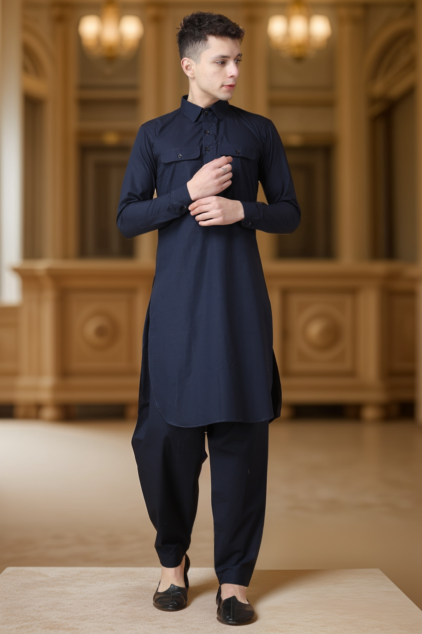 - Navy Blue Cotton Pathani Suit