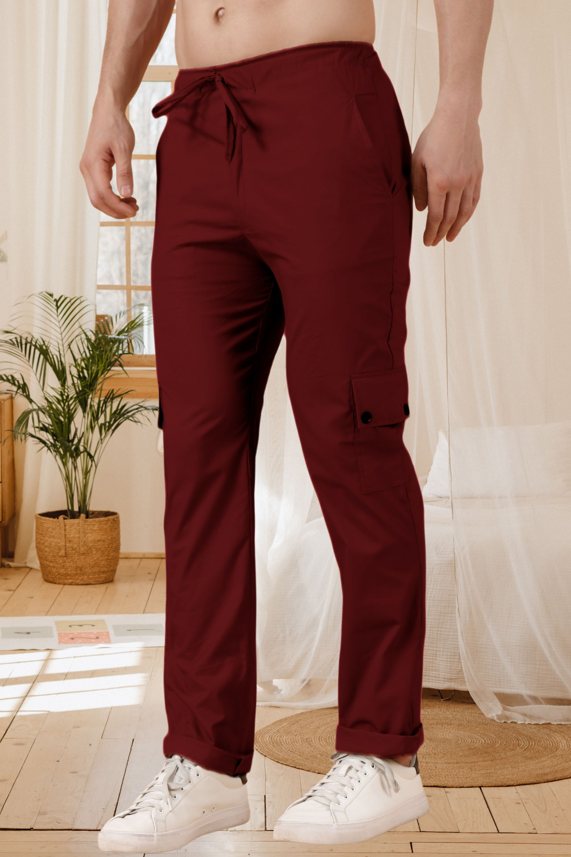- Maroon Solid Cotton Cargo Pants