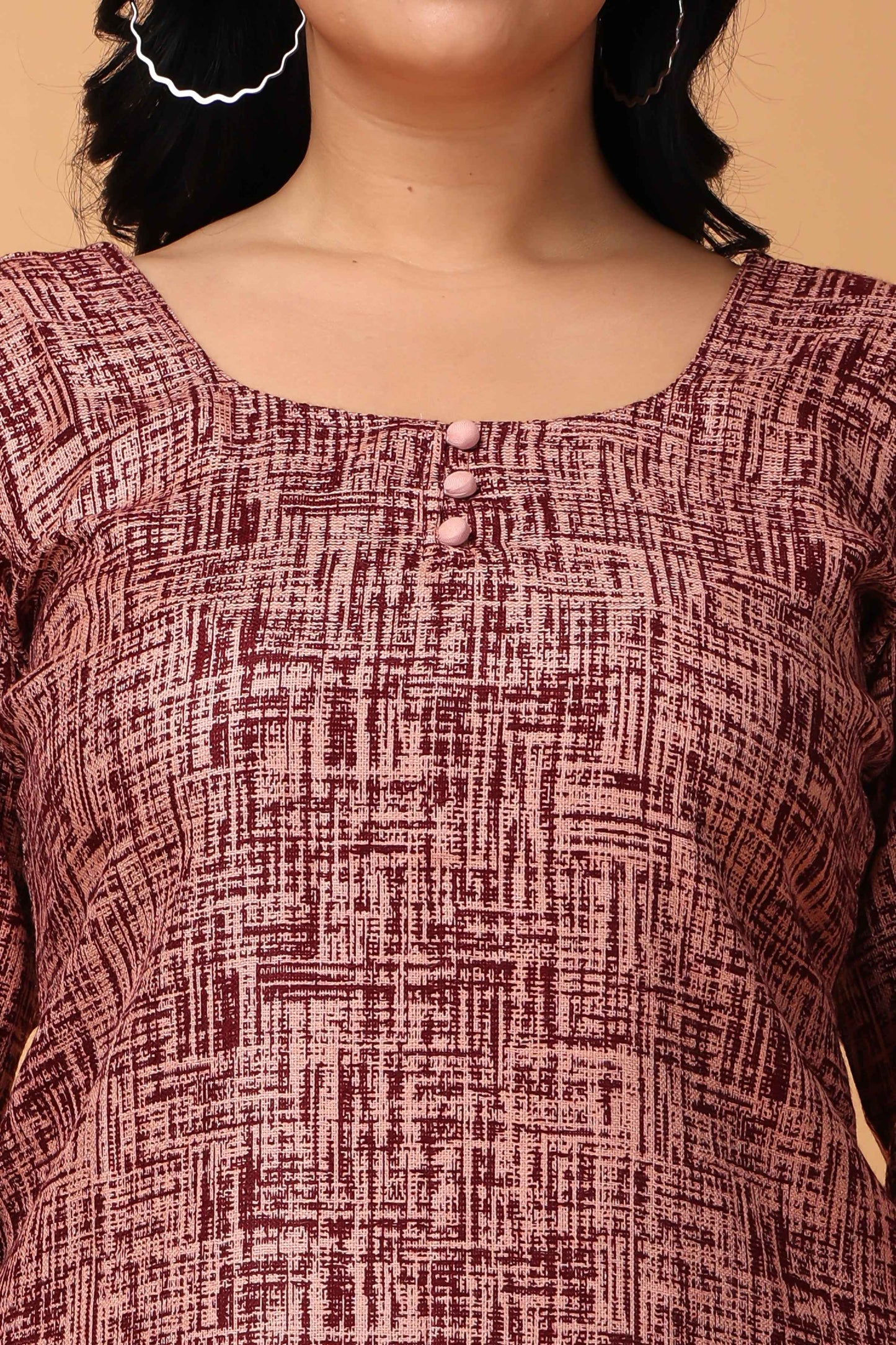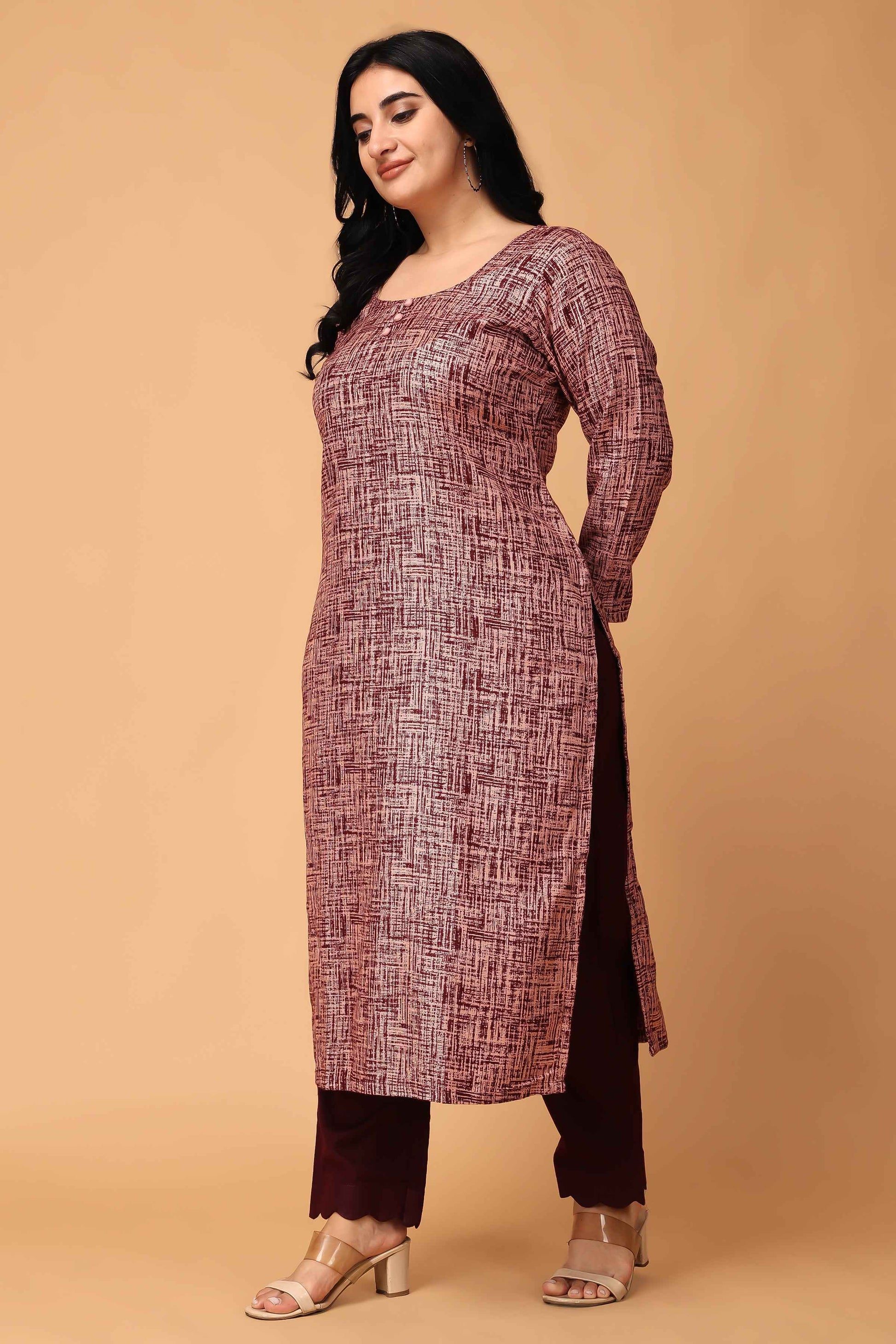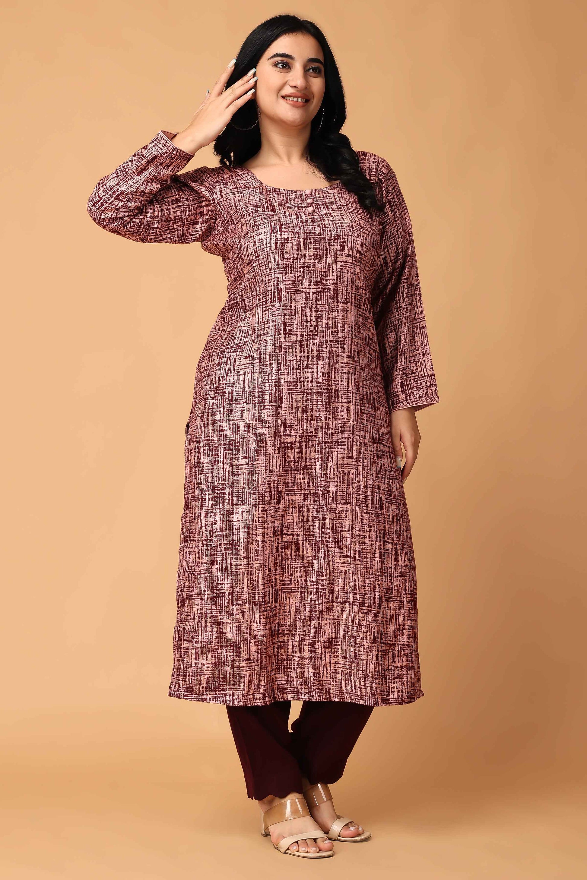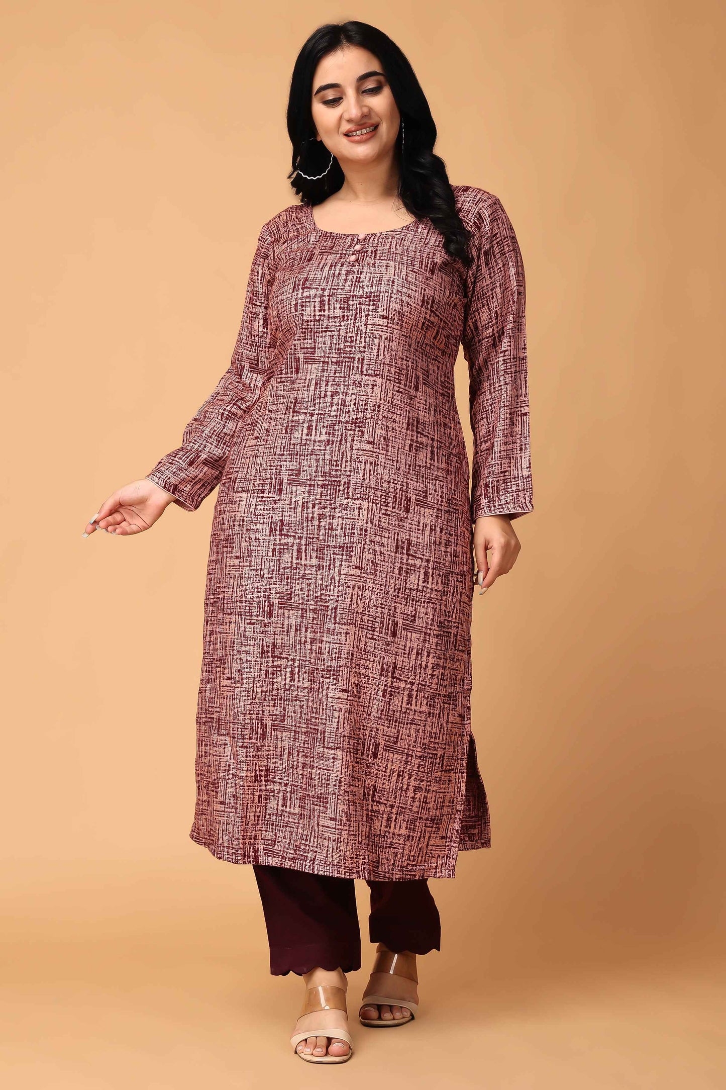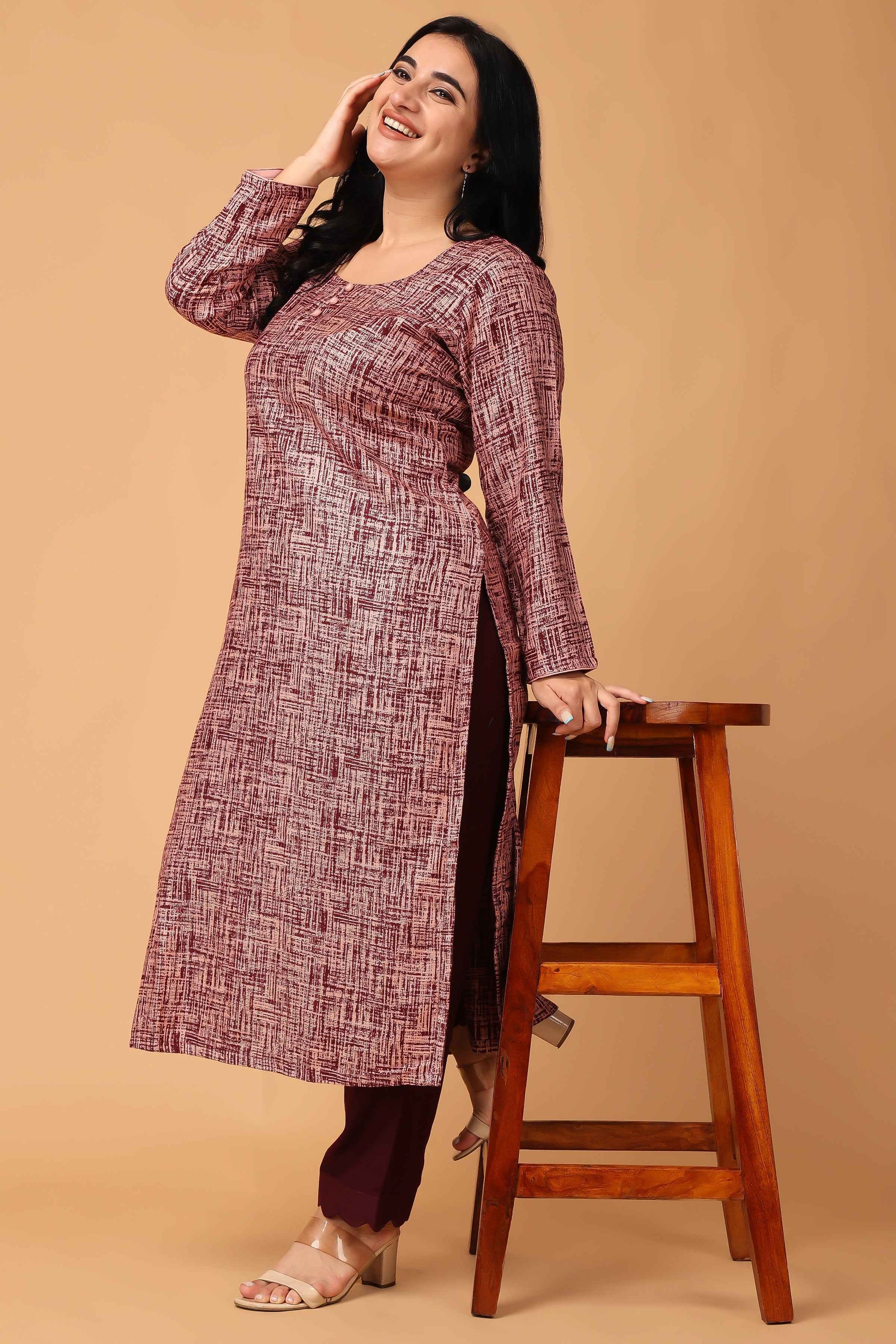 Introducing our Woollen Textured Kurta Set, a must-have for your winter wardrobe. Crafted from Cashmilon fabric, this set features a stylish texture in an eye catchy combination of Wine & Onion, adding a touch of sophistication to your look. The round neckline with mock detailing and full sleeves make it perfect for the season. It is paired with Wine bottom that makes it cozy and chic and all set to turn heads.