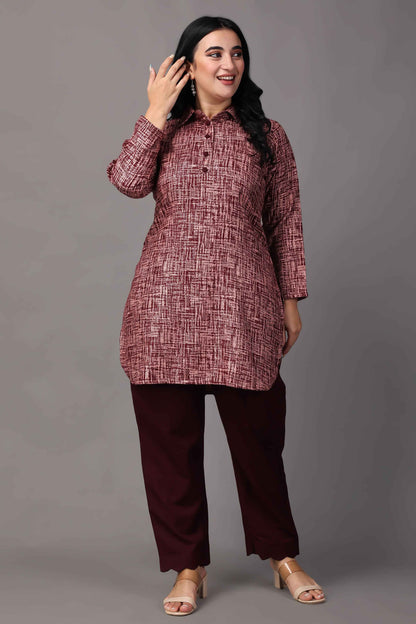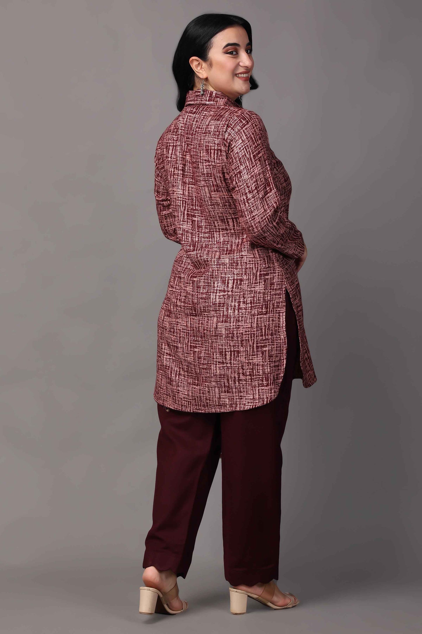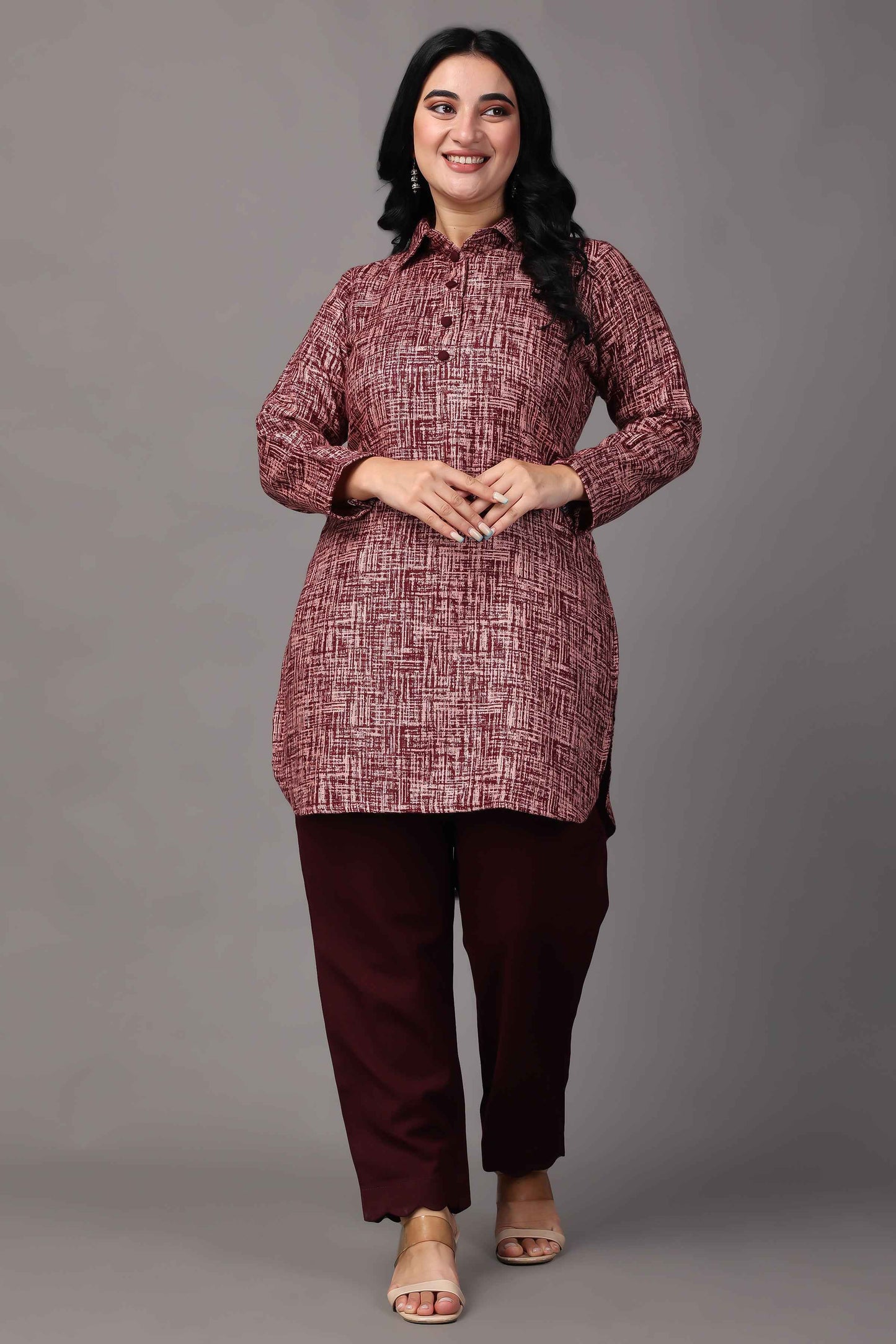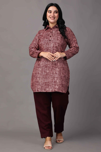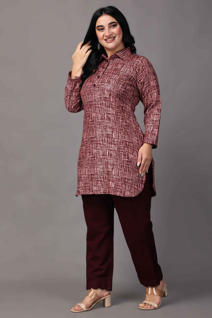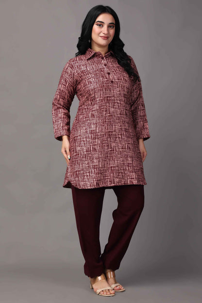 Discover Women's Woollen Kurtas to amp everyday fashion with Apella. It is designed to keep you stylish and comfortable. Made from Cashmilon fabic, this textured Kurta features a unique color combination of Onion and Wine and comes with a collar neckline, mock button detailing and full sleeves. Pair it with palazzo pants or lycra pants for a versatile and fashionable ensemble, ideal for the season.