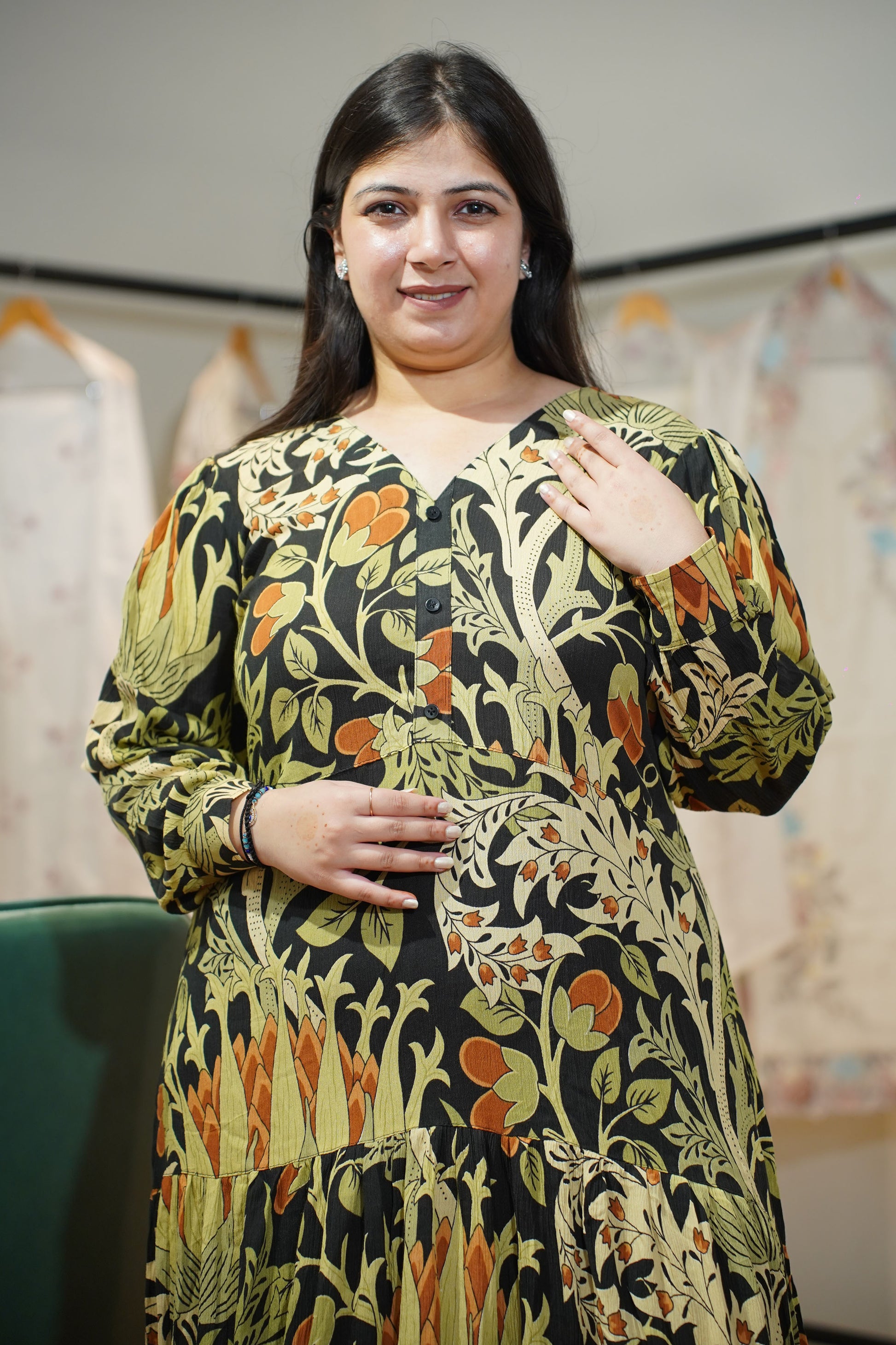 - Olive and black printed crepe rayon dress