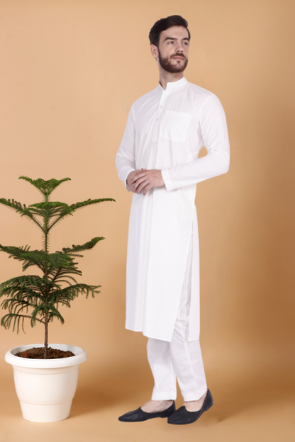 Dress up to impress by donning this amazing white full sleeve mandarin collar kurta pyjama set by Apella. Made with premium quality cotton, this set ensures maximum breathability and keeps you at ease for long hours.