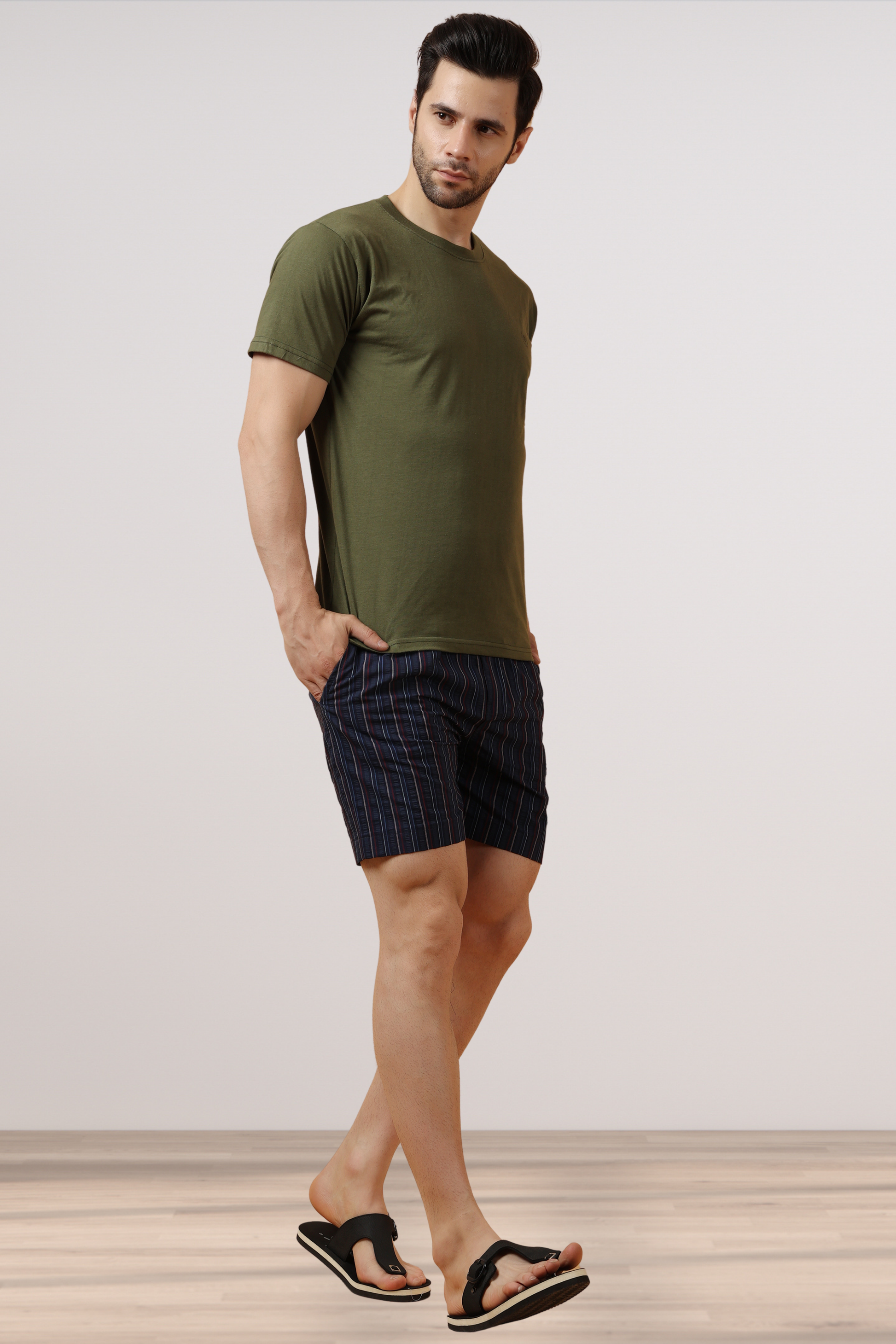 Slip into these Navy Shorts from Apella to take you through your lounge days with luxurious ease. The striped profile exudes a modern charm while the fully elasticized waist cinches you in for a secure fit. The dual-pocket style flaunts a dobby-cotton composition for effortless comfort.