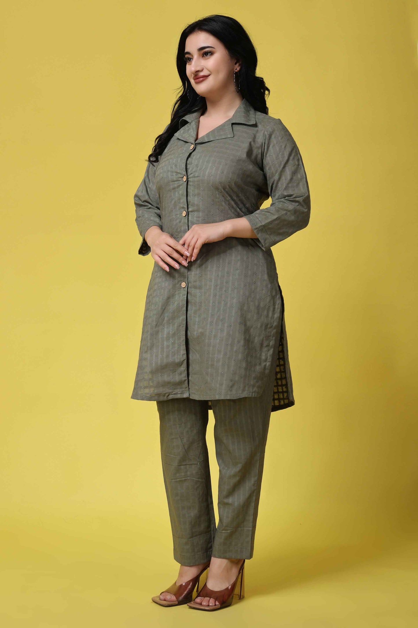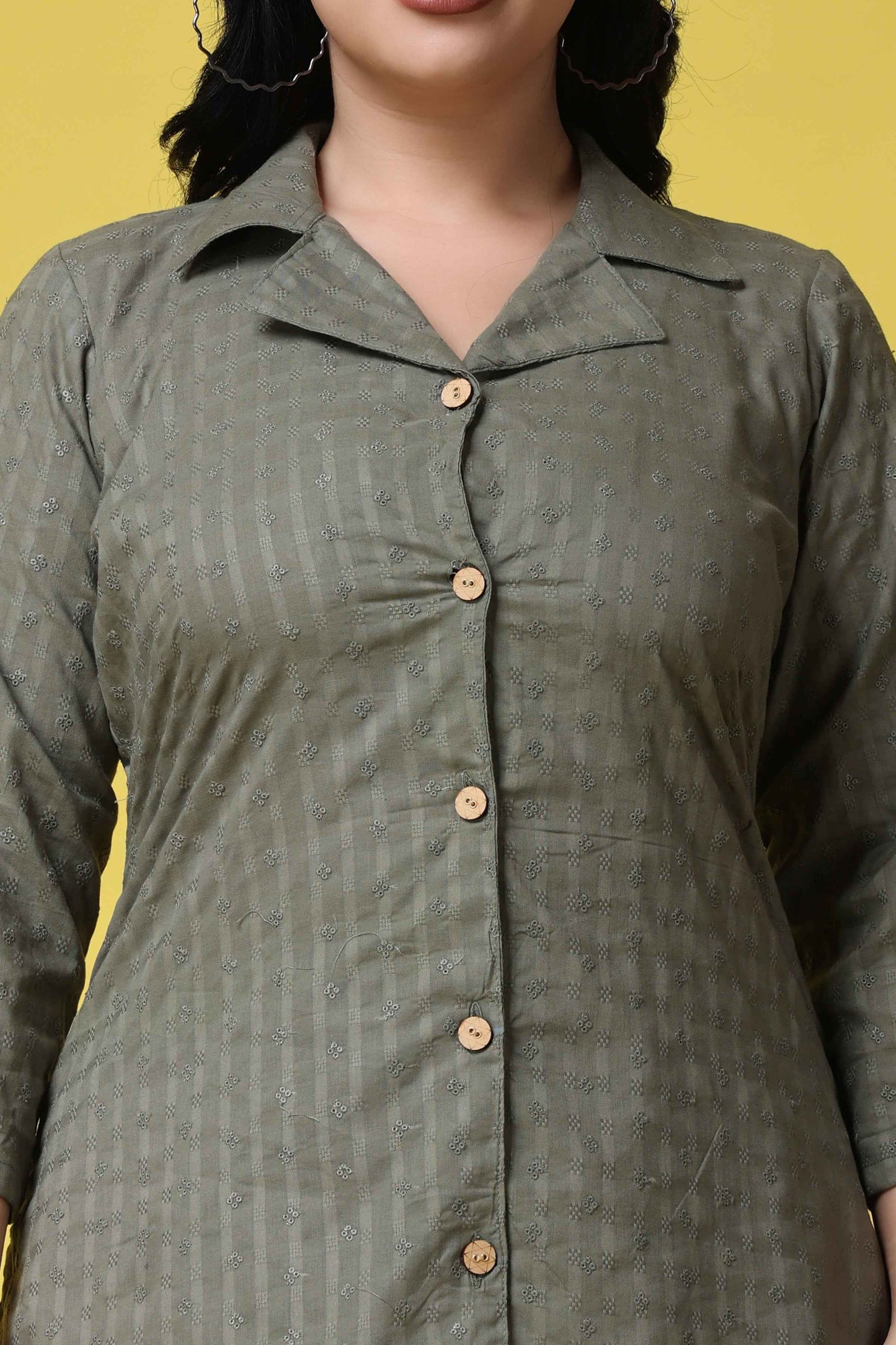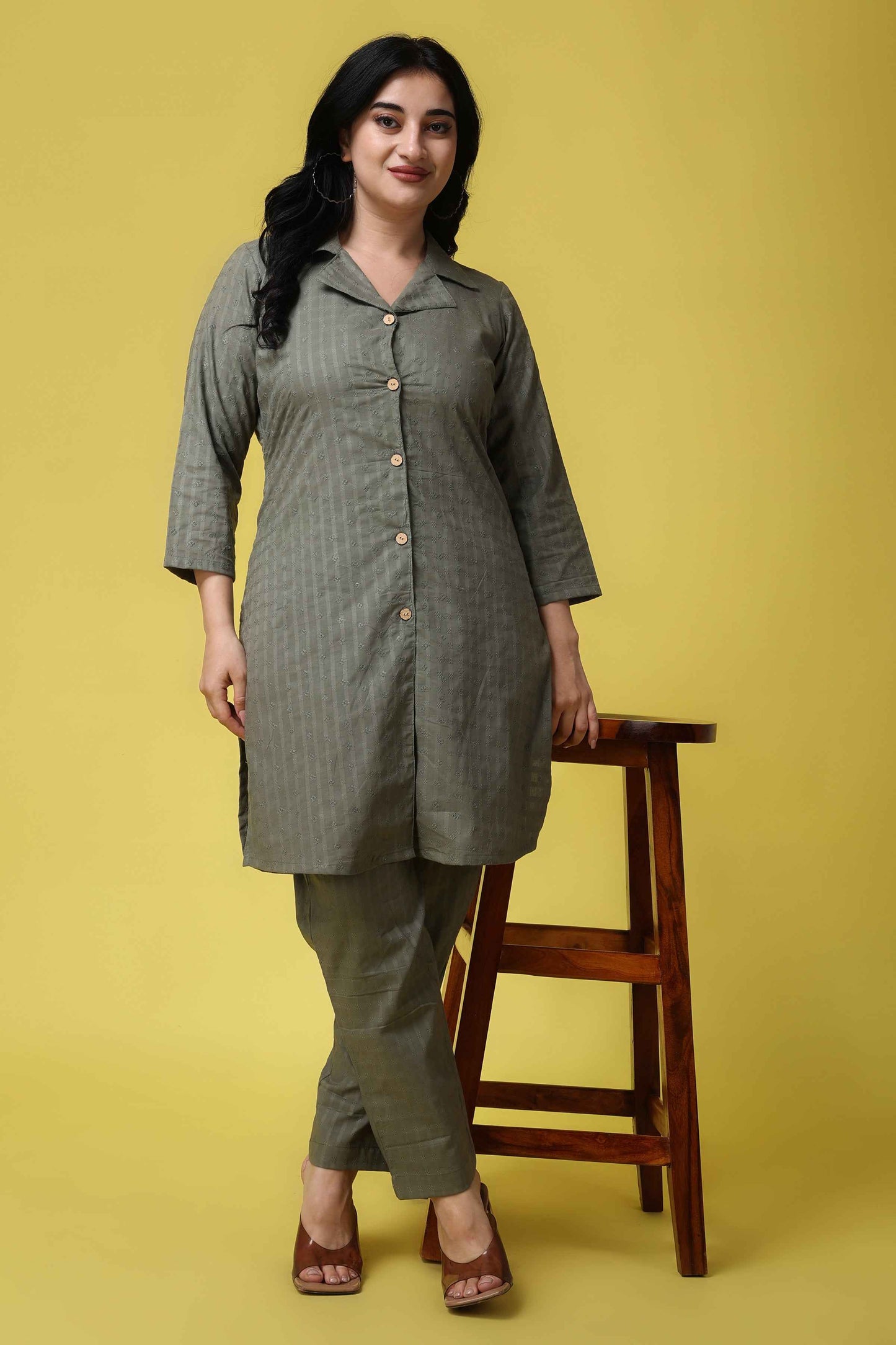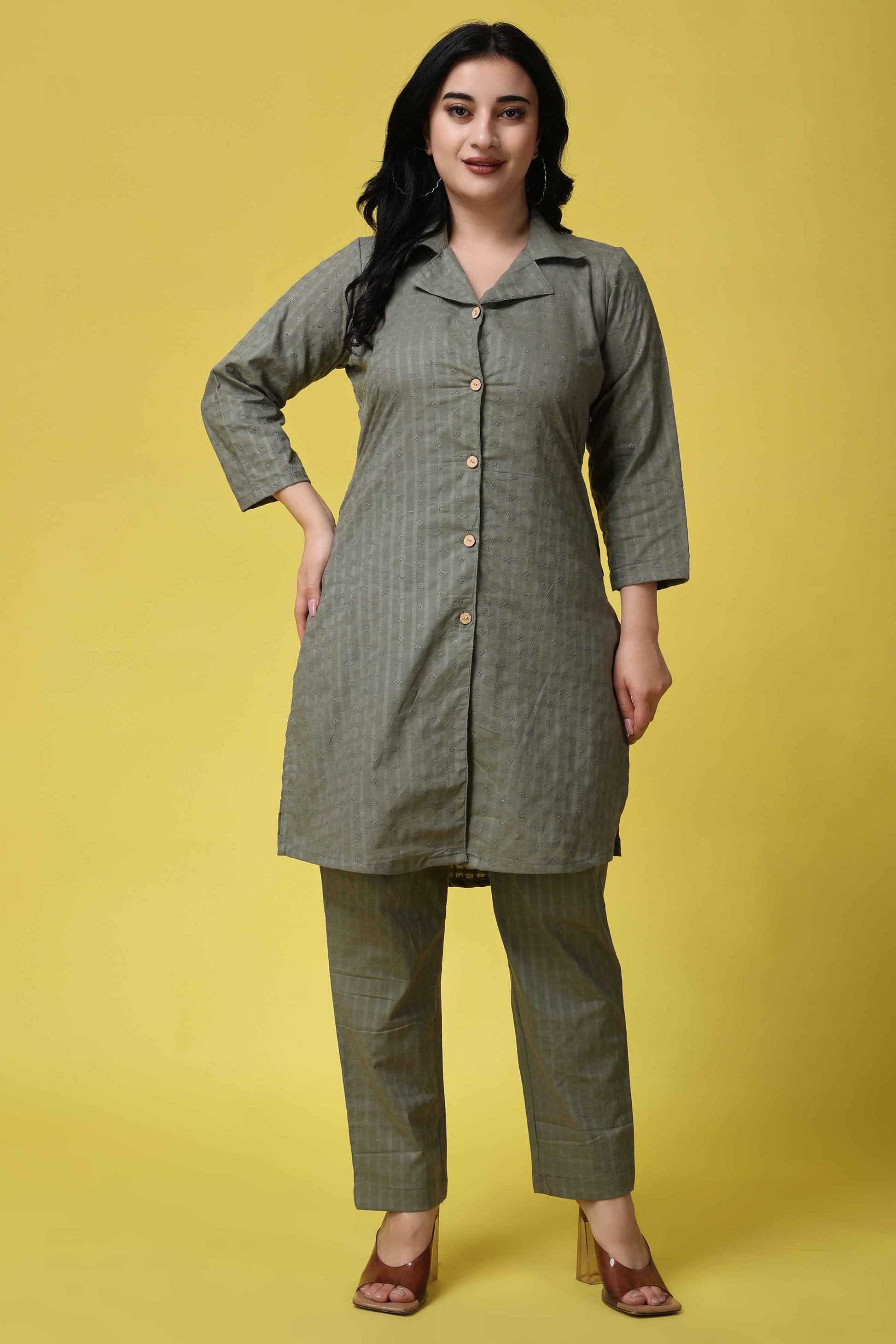 Whether you're attending a formal event or looking to elevate your everyday style, the Olive Embroidered Co-ord Set is a perfect choice. This set features intricate embroidery all over, creating a stunning and eye-catching design. The co-ord set showcases a notched collar with a front button placket and 3/4th quarter sleeves provide a comfortable and flattering fit. The olive color adds a touch of earthy sophistication, making it suitable for various occasions.