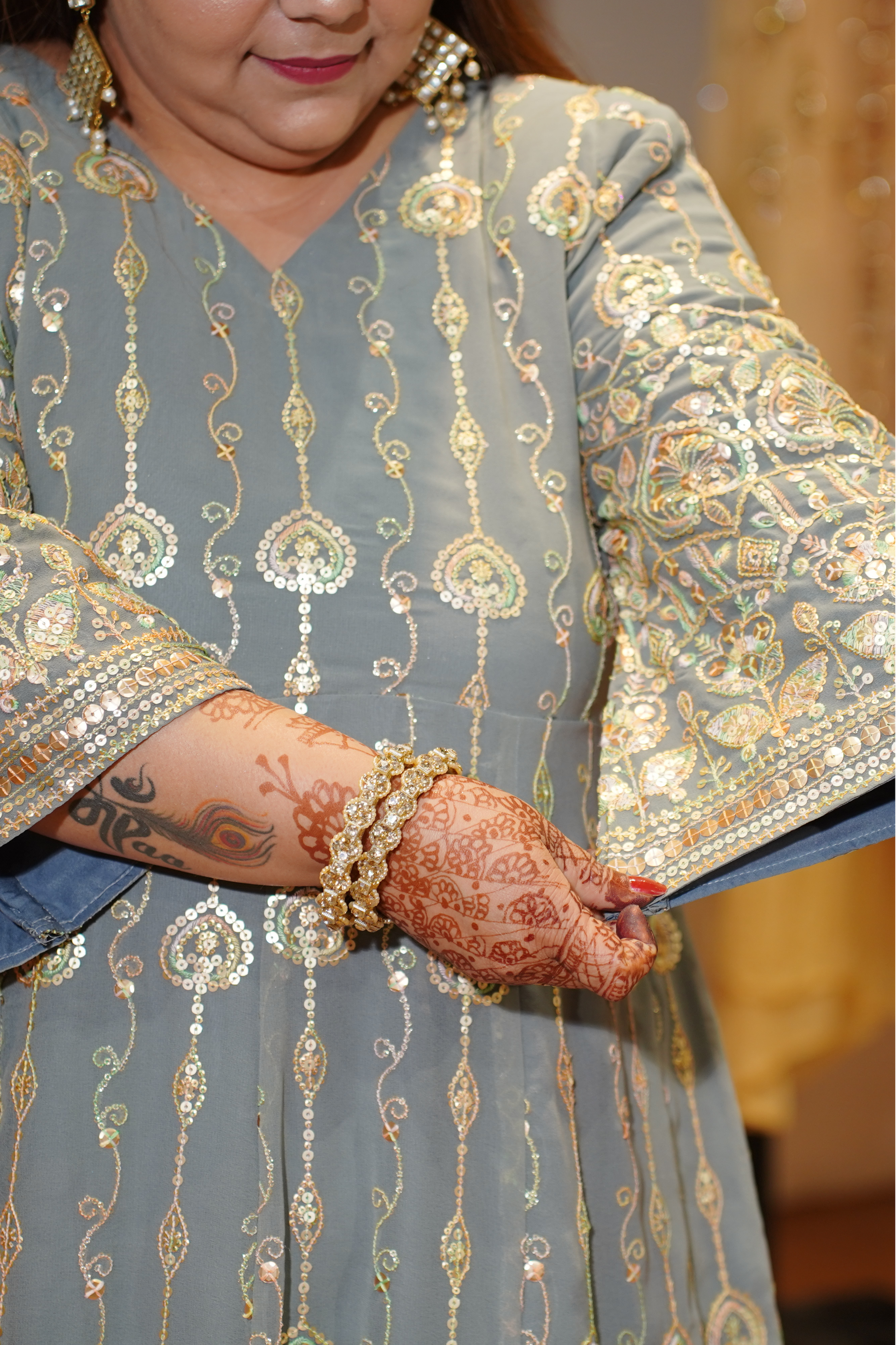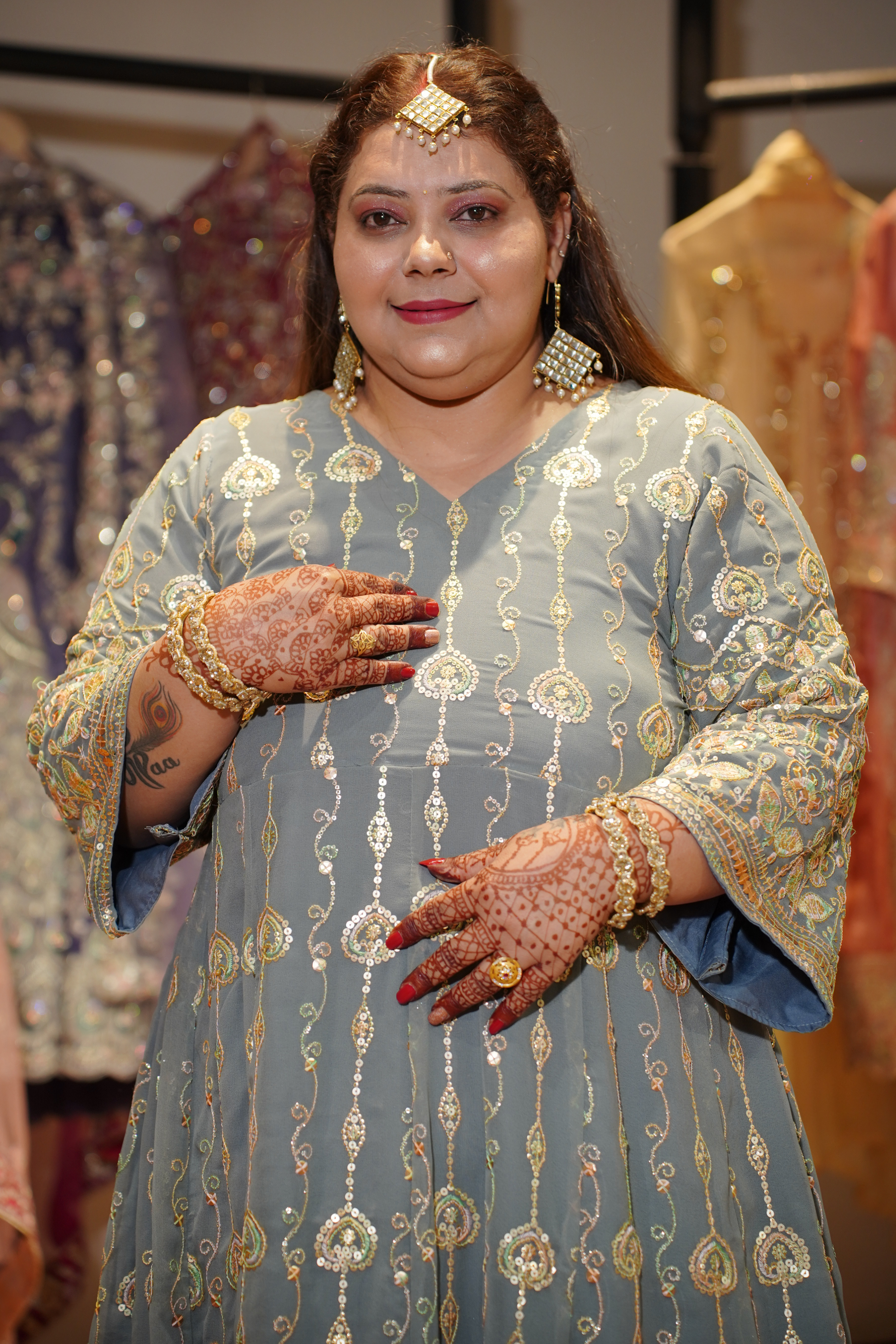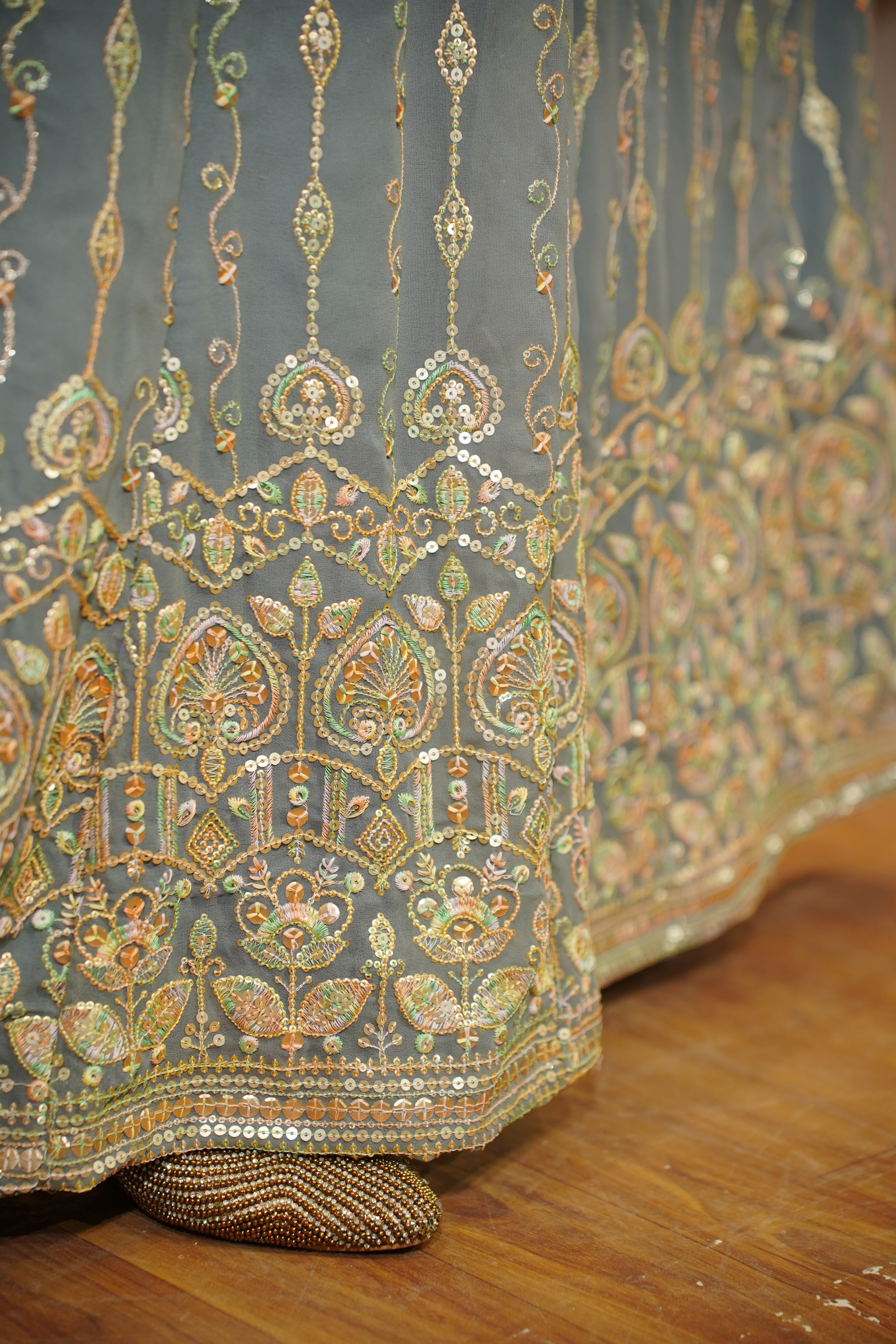 - Intricate sequins, zari, and resham embroidery