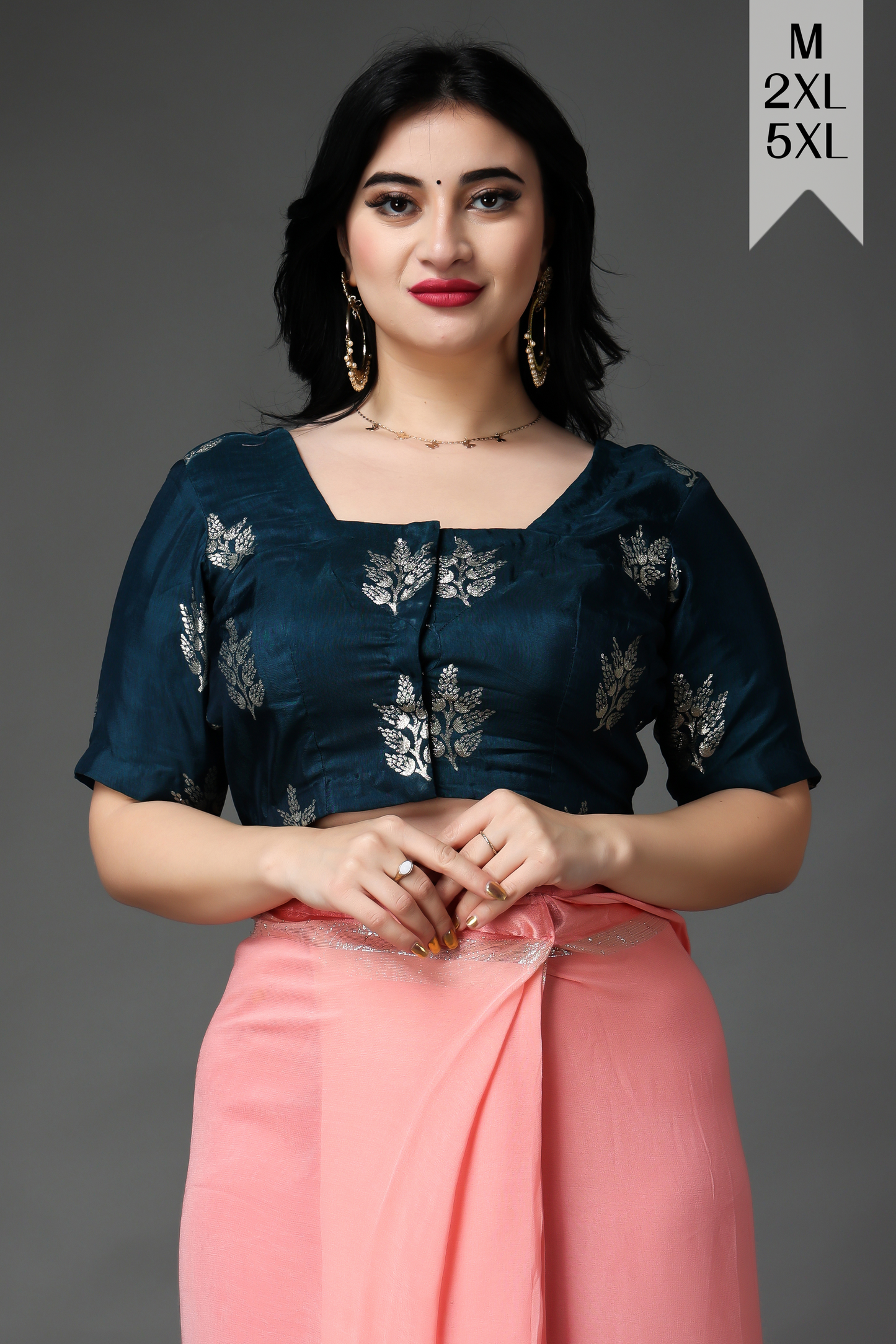 Make an impression with the simple elegance of a Pure Silk Blouse that features Jacquard weaving all over. In a classic Peacock Green color, the Blouse has a unique texture and lusture that makes it a favorite of all Saree lovers. The Blouse has a half sleeves and front hook closure.