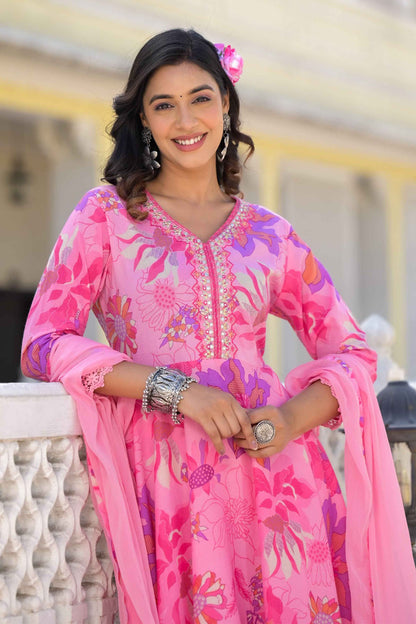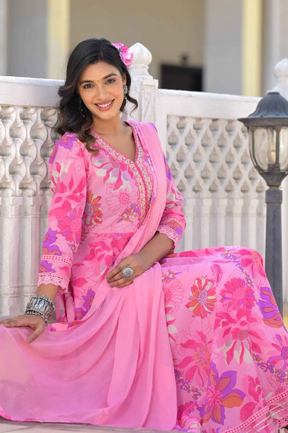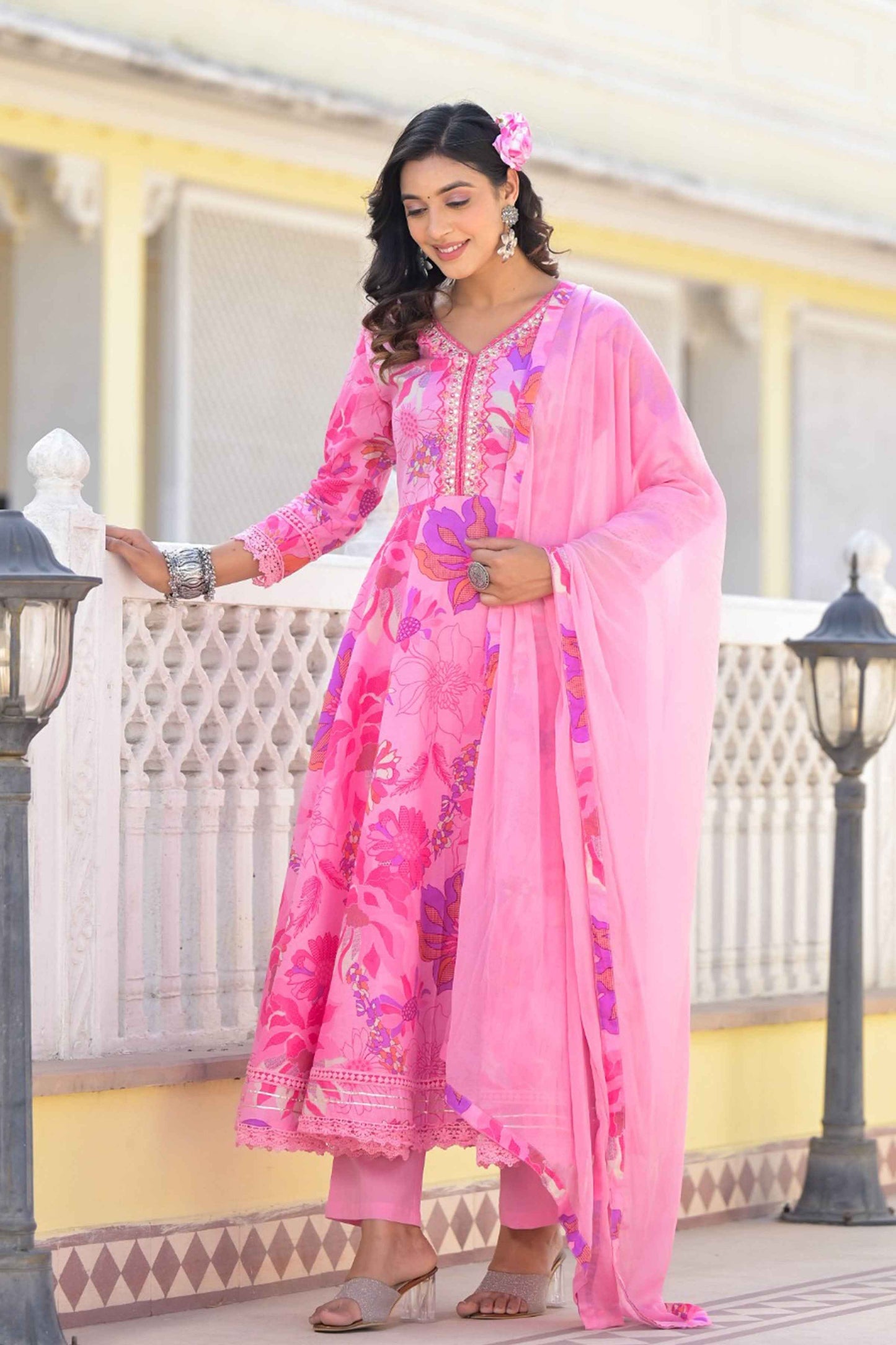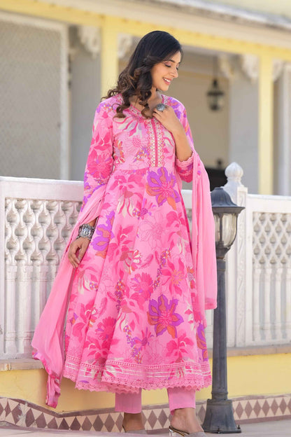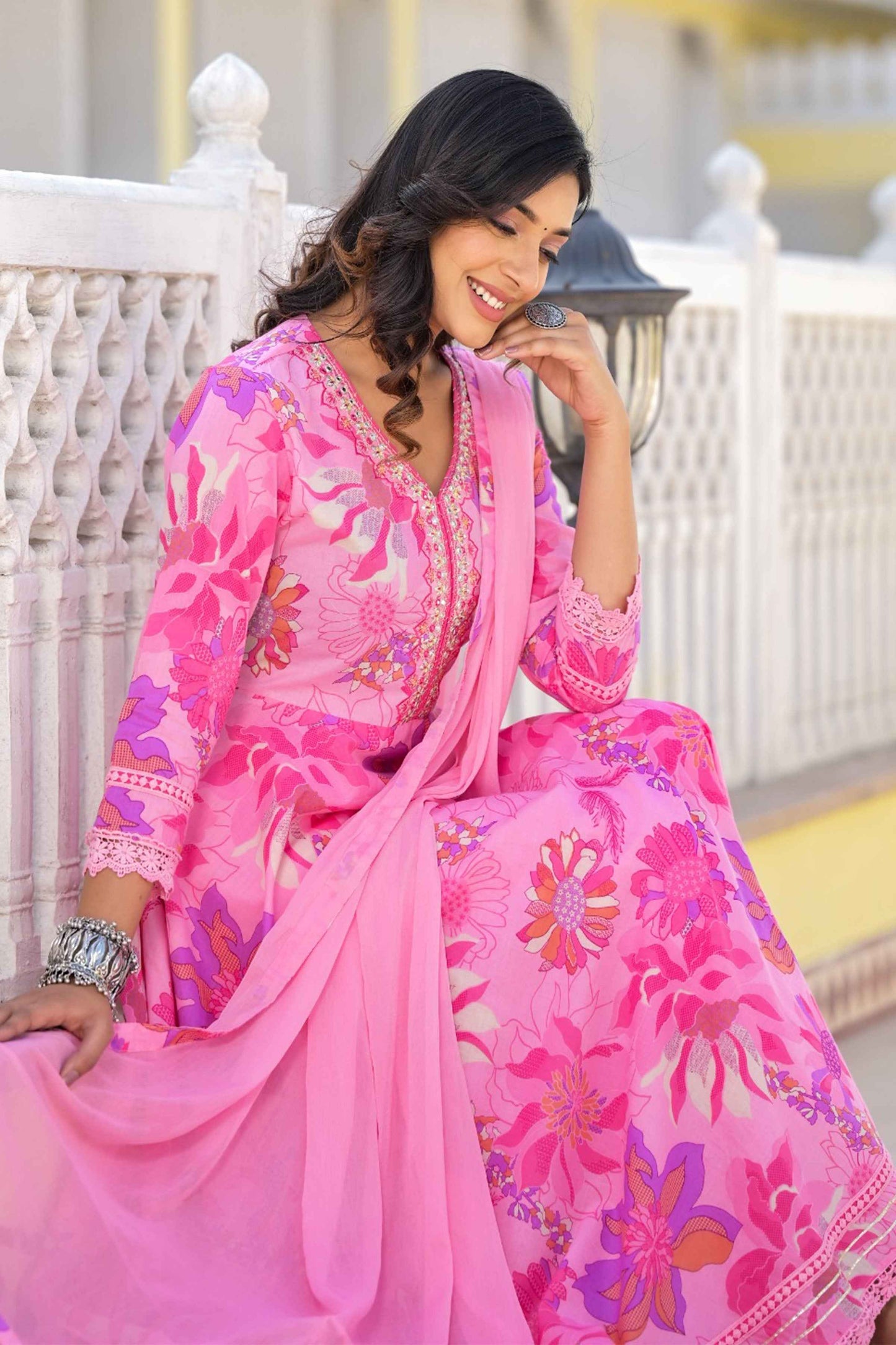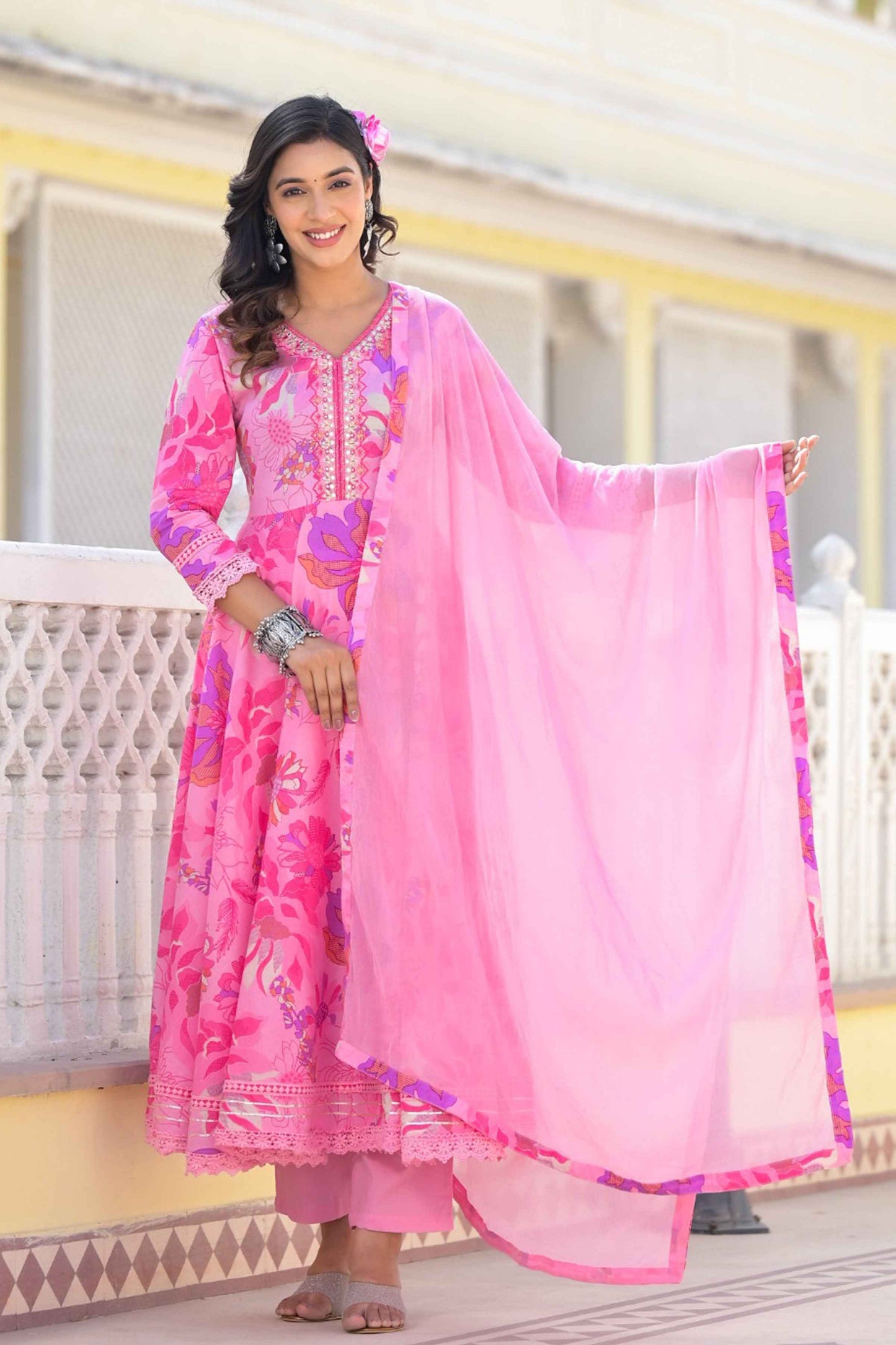 Step into the spotlight with our Pink Bliss Anarkali Suit Set, a perfect blend of elegance and charm. Crafted from cotton fabric with a charming floral print, it features a v-neckline adorned with minimal sequin detailing around the placket, crochet lace detailing at the hemline and quarter sleeves. It is paired with matching palazzo pants and a chiffon dupatta featuring border detailing, this ensemble is sure to make you stand out at any occasion.