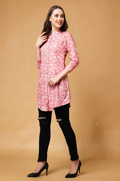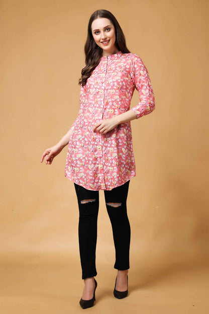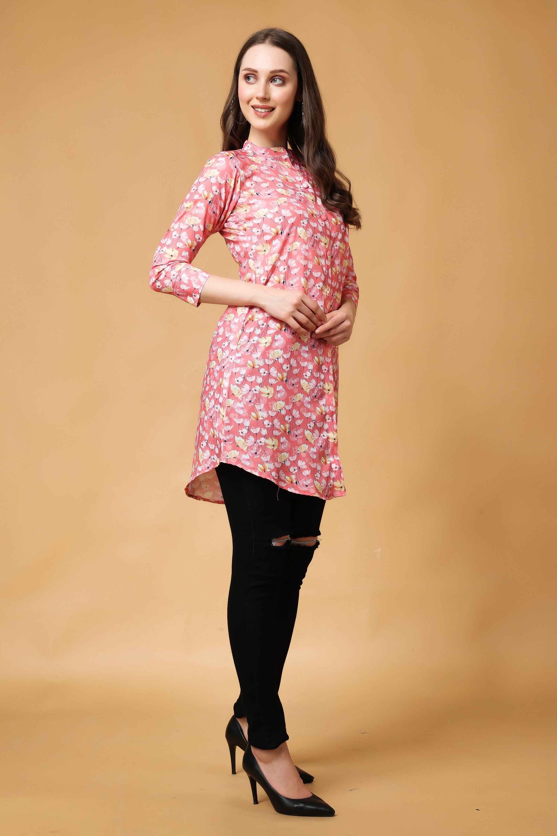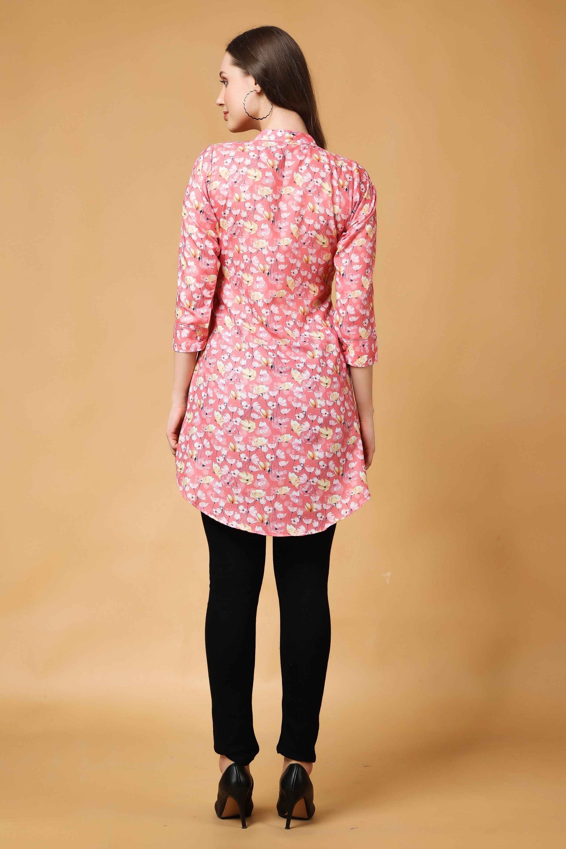 This Pink Short Kurta is perfect for a hot Summer day. It's made of lightweight Muslin Modal fabric and features a cheerful floral print. The short length and small prints add to its casual vibe. With a mandarin neckline and 3/4th quarter sleeves, this kurta is easy to style with jeans or leggings.
