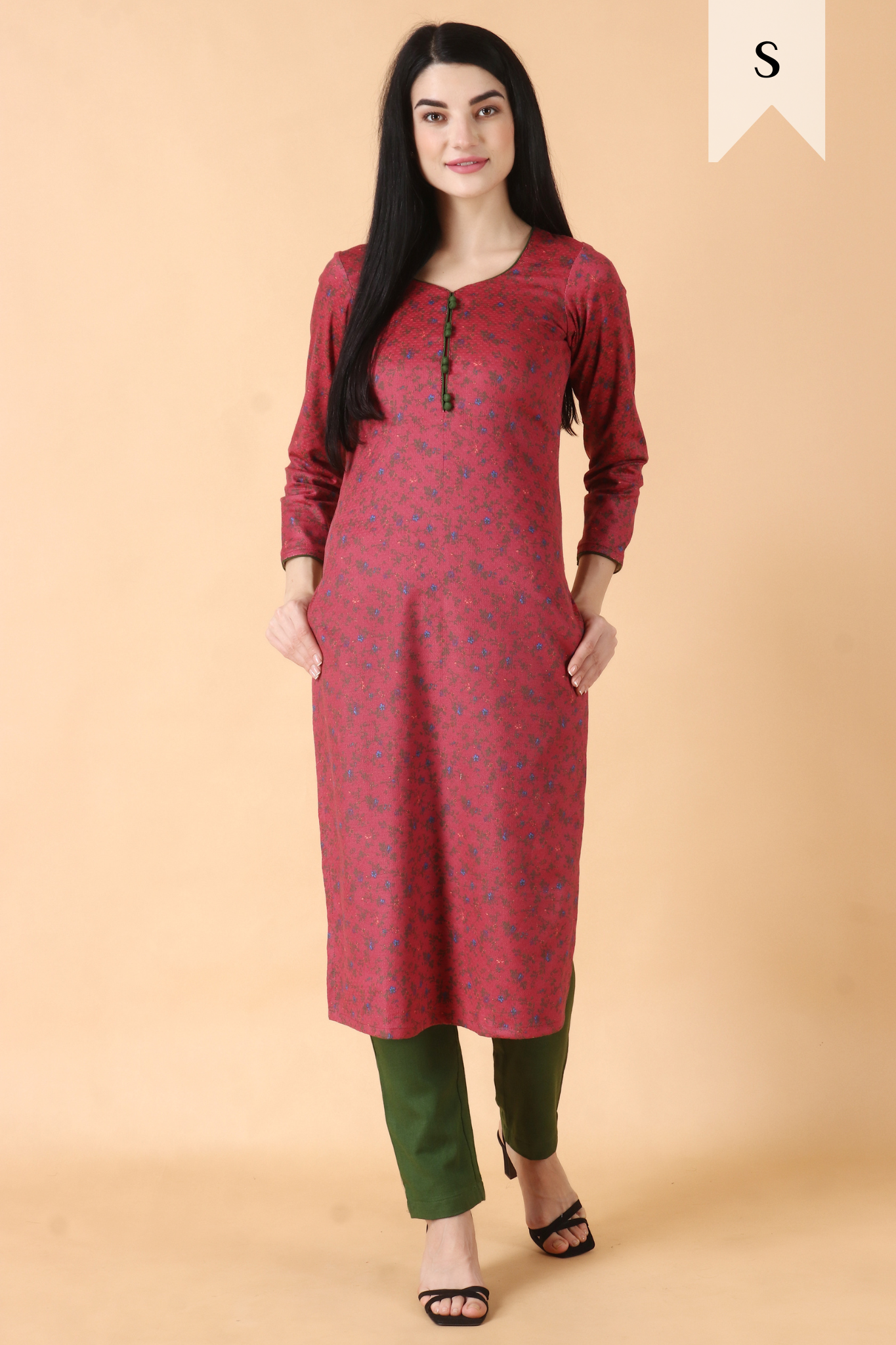 Experience winter in style with this chic and upbeat Woollen kurta set in a Carrot Pink hue perfect to give you a warm and cosy feel. Curated with corduroy fabric, this printed straight-fit kurta featuring a contrast detailing at neck with potli buttons and full sleeves will definitely amp up your Winter closet.