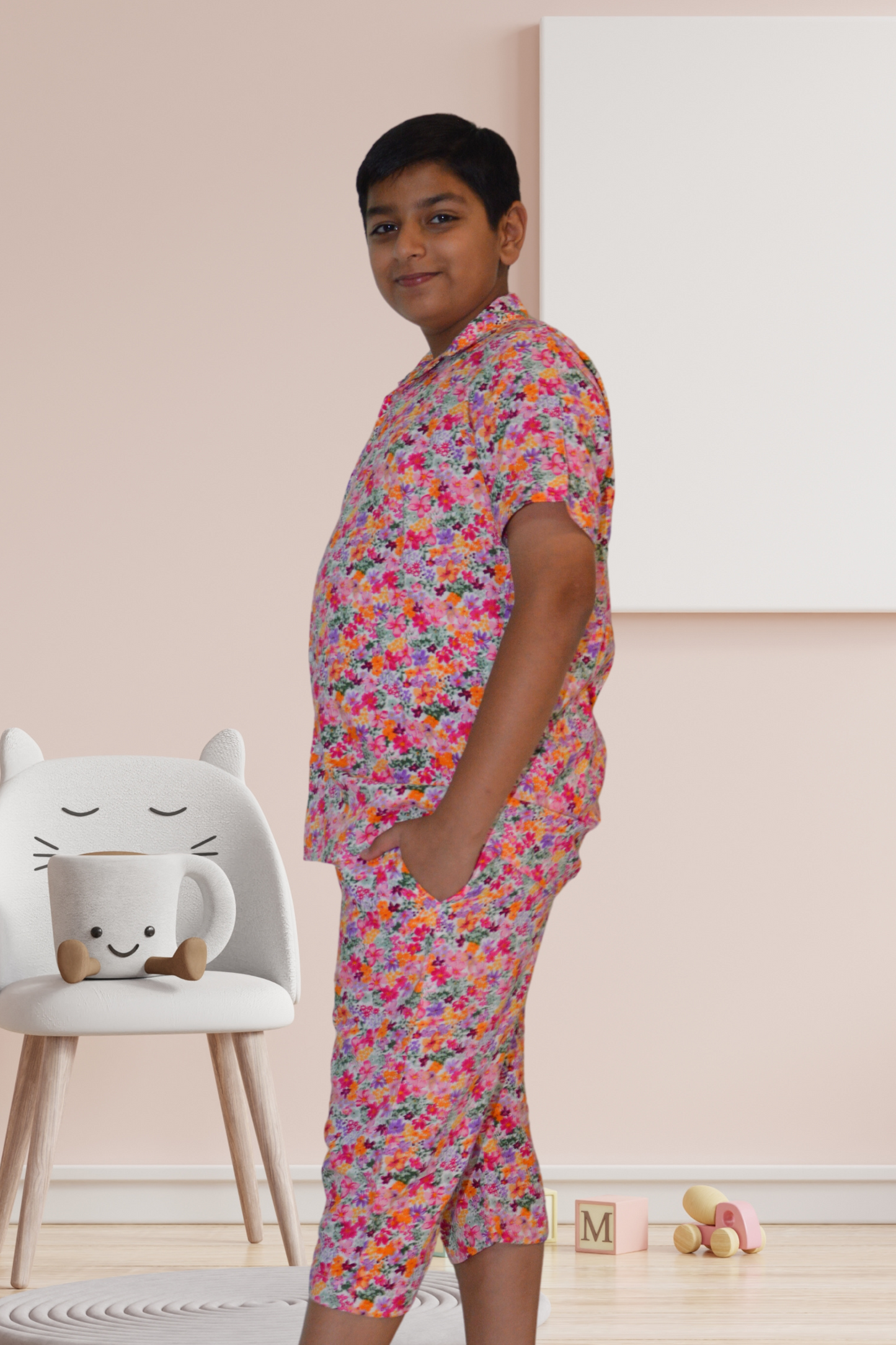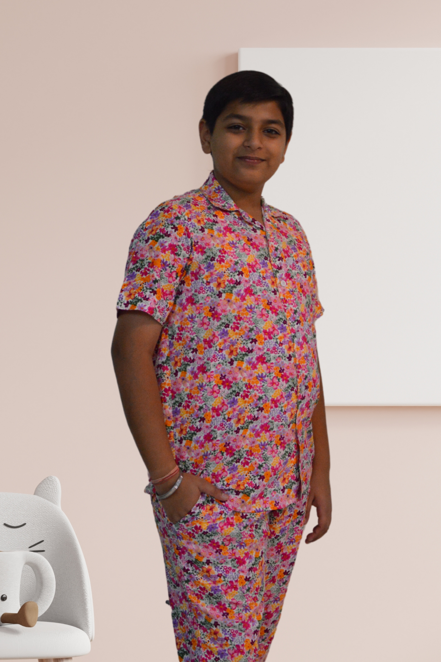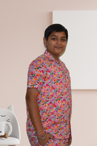 The Pink Printed Kids Co-ord Set is a delightful and charming outfit designed to make your little ones look adorable and stylish. The co-ord set is beautifully adorned with a mesmerizing floral print all over, collar neckline with front button detailing and half sleeves. The Pink Printed Kids Co-ord Set is thoughtfully paired with a coordinating bottom.