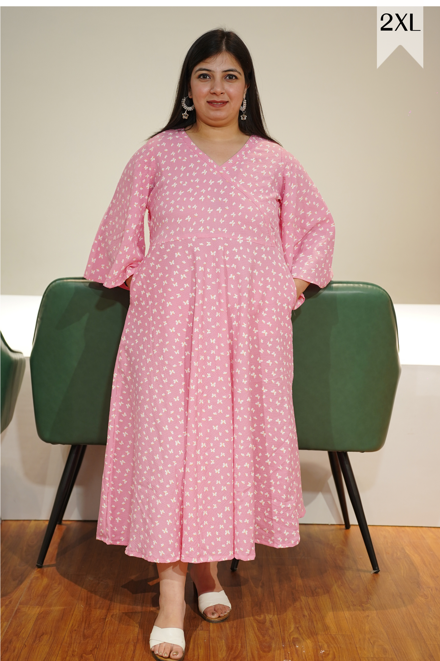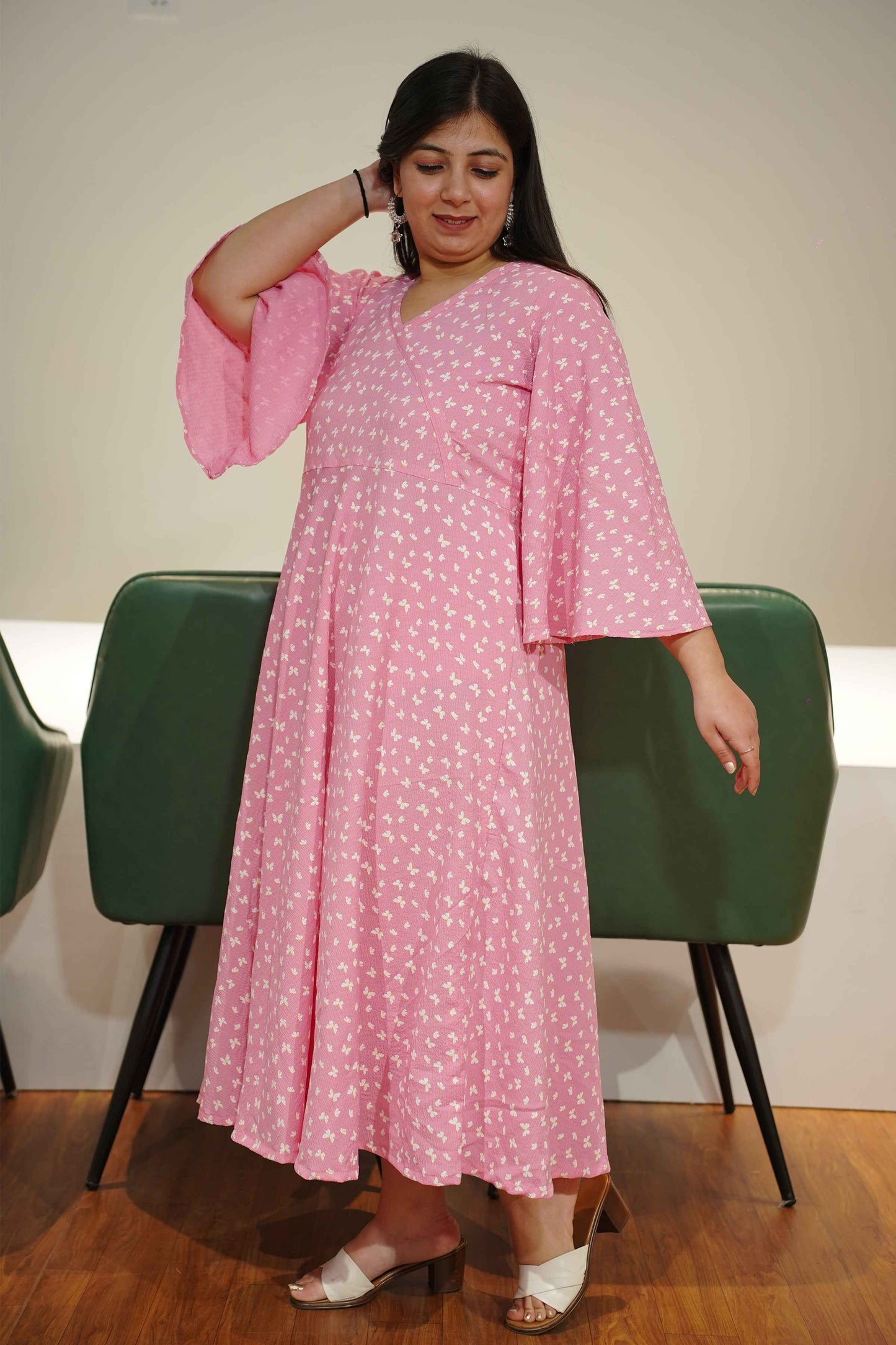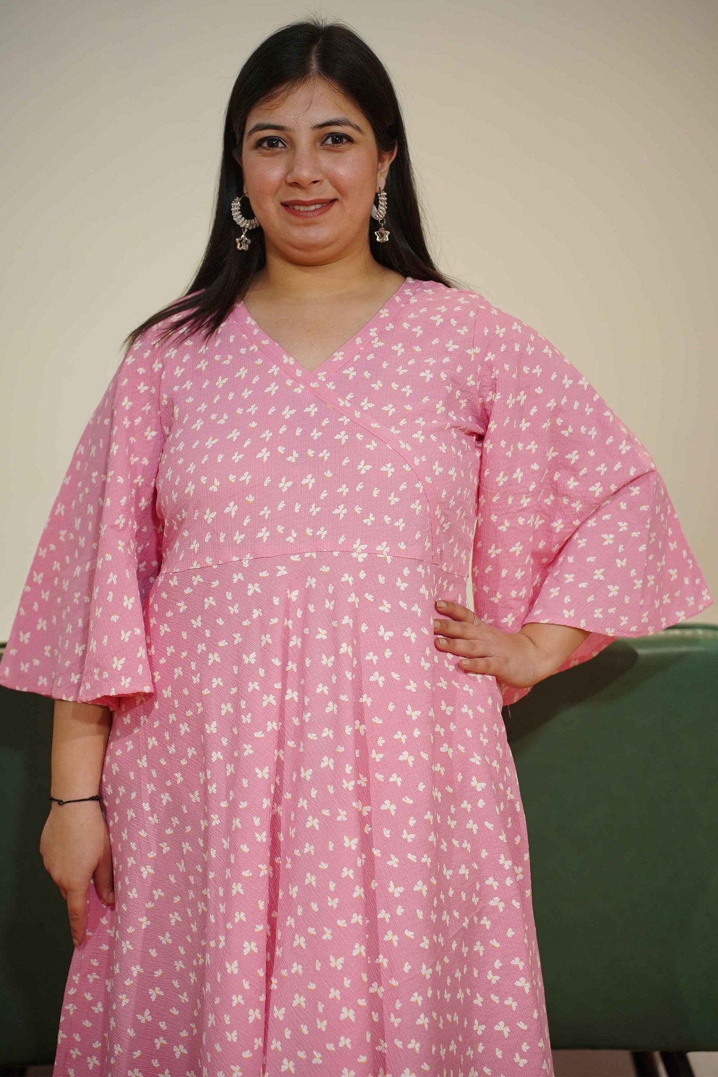 - Pink Calf Length Dress made from Polyester Crushed fabric