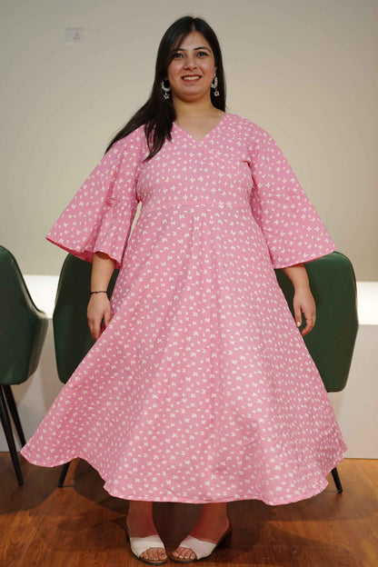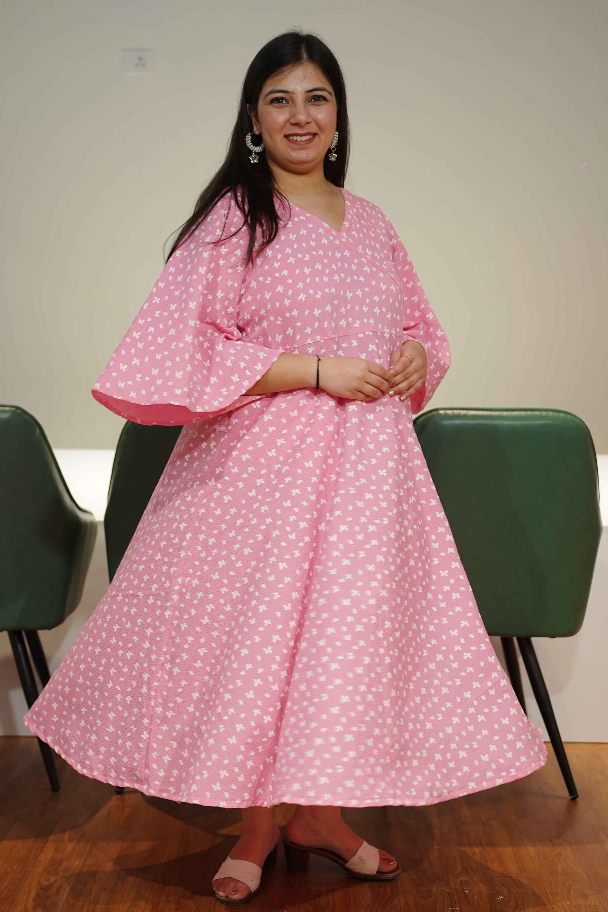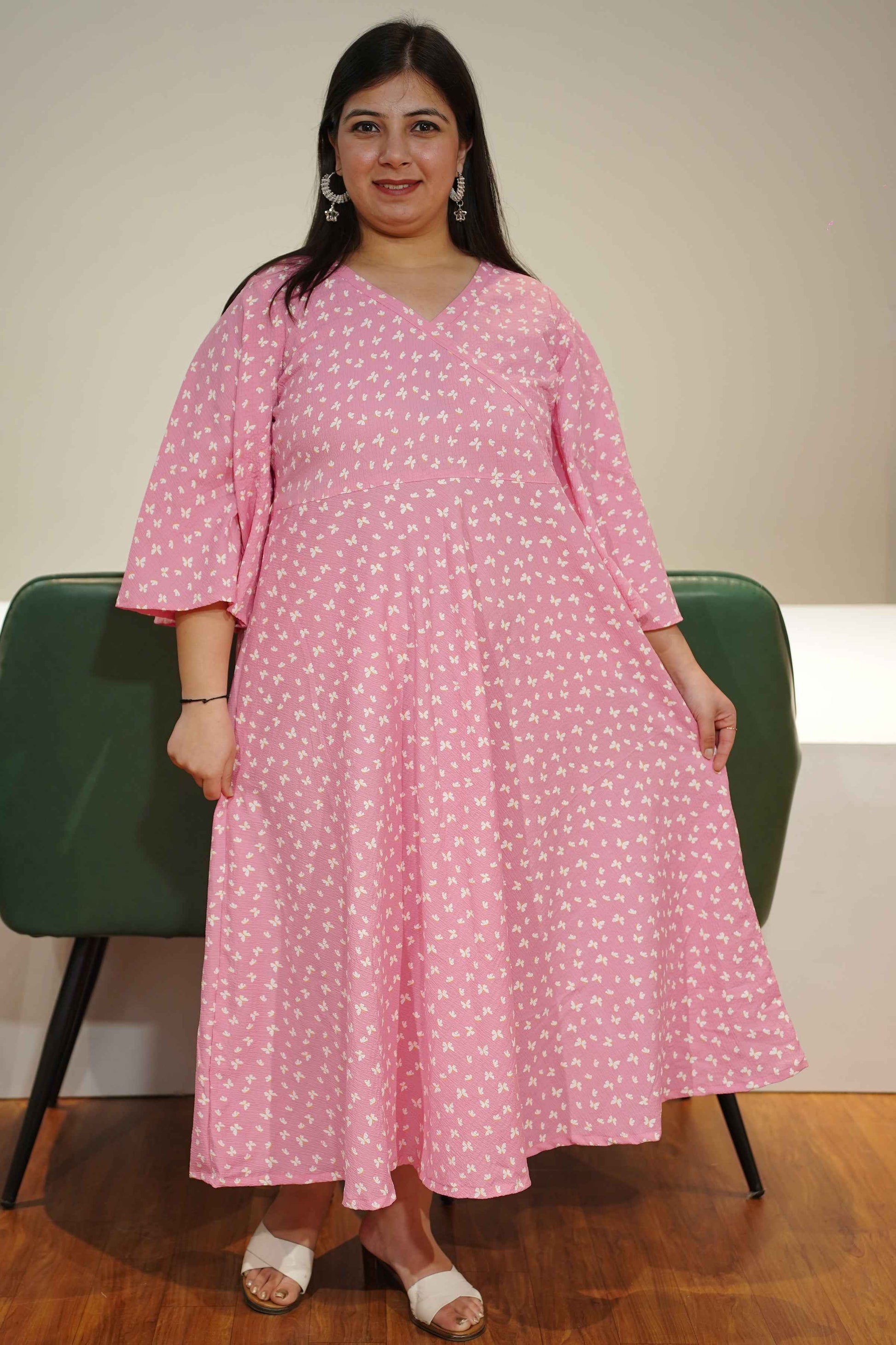 - Pink Calf Length Dress made from Polyester Crushed fabric