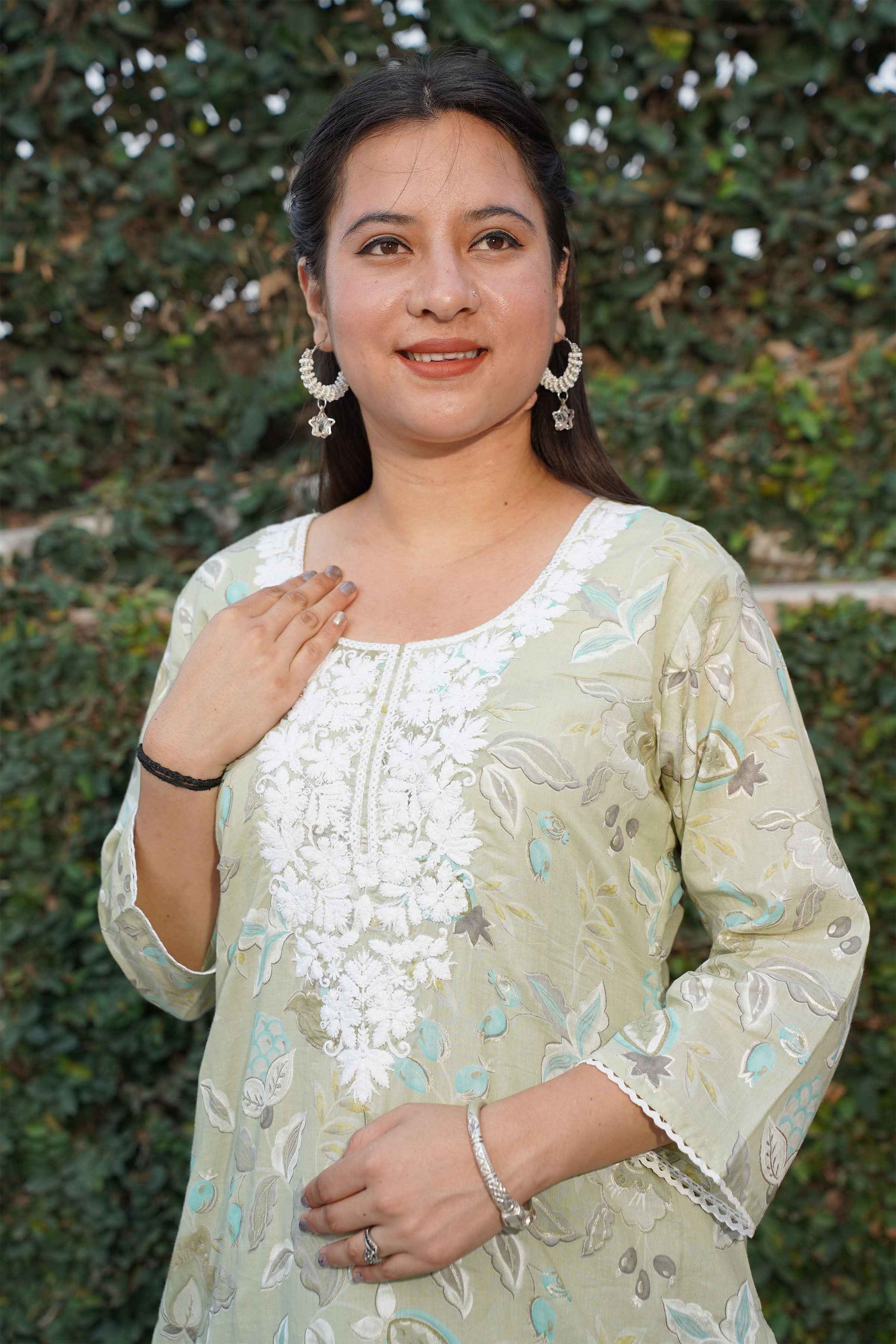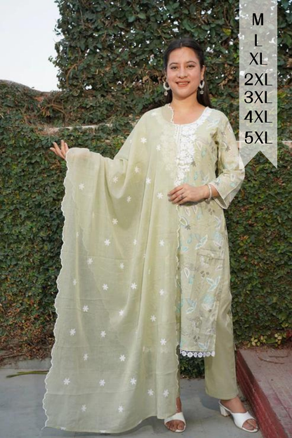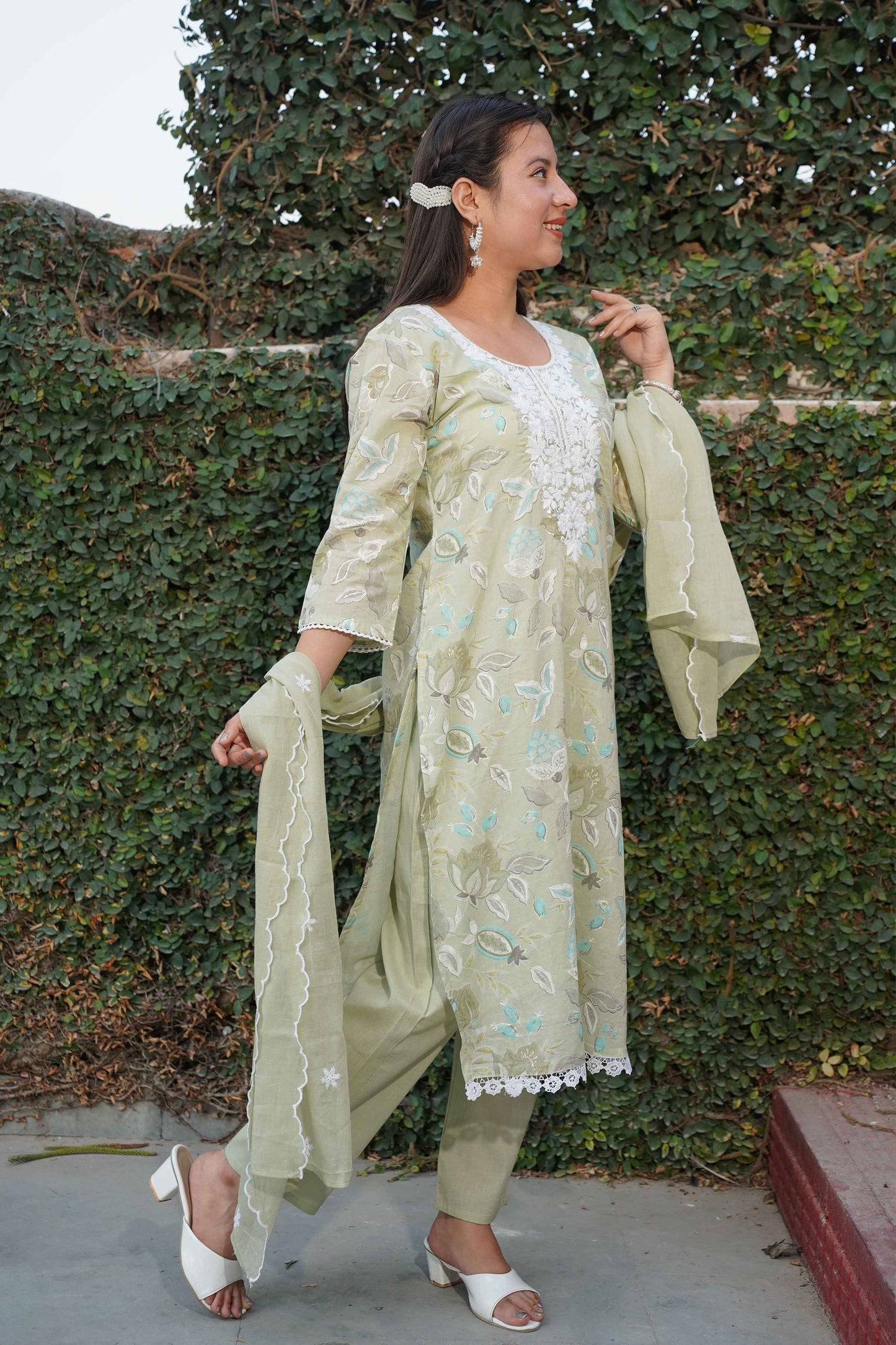 Step into a realm of enchantment with our Pista Floral Mul Cotton Suit Set, fashioned from mul cotton fabric. Embellished with a delightful floral print adorned by foil detailing, the ensemble features intricate embroidered detailing on the round neckline, lace detailing at hemline, and quarter sleeves. It is paired with coordinating palazzo pants and an embroidered dupatta boasting a scallop border design.