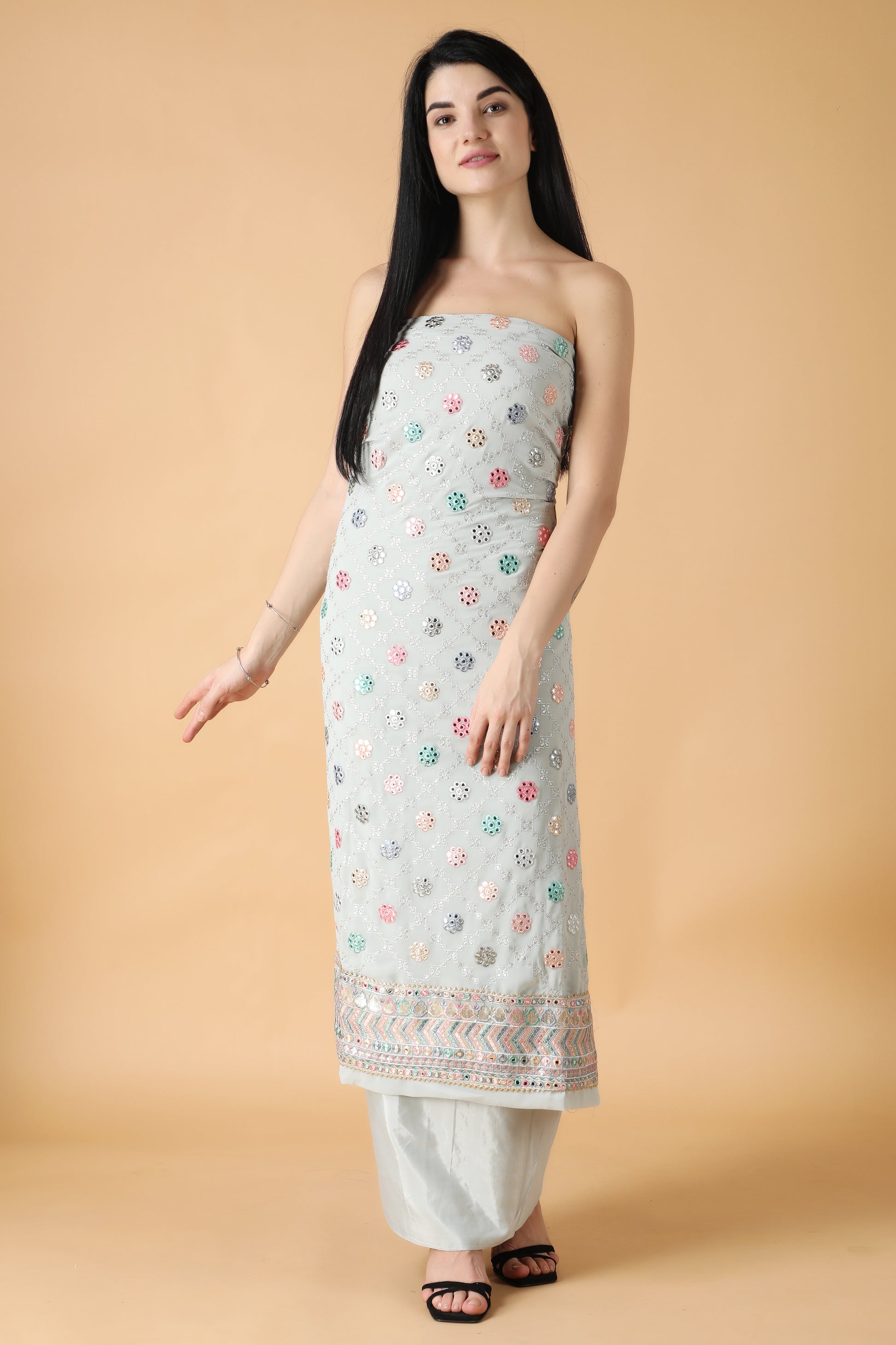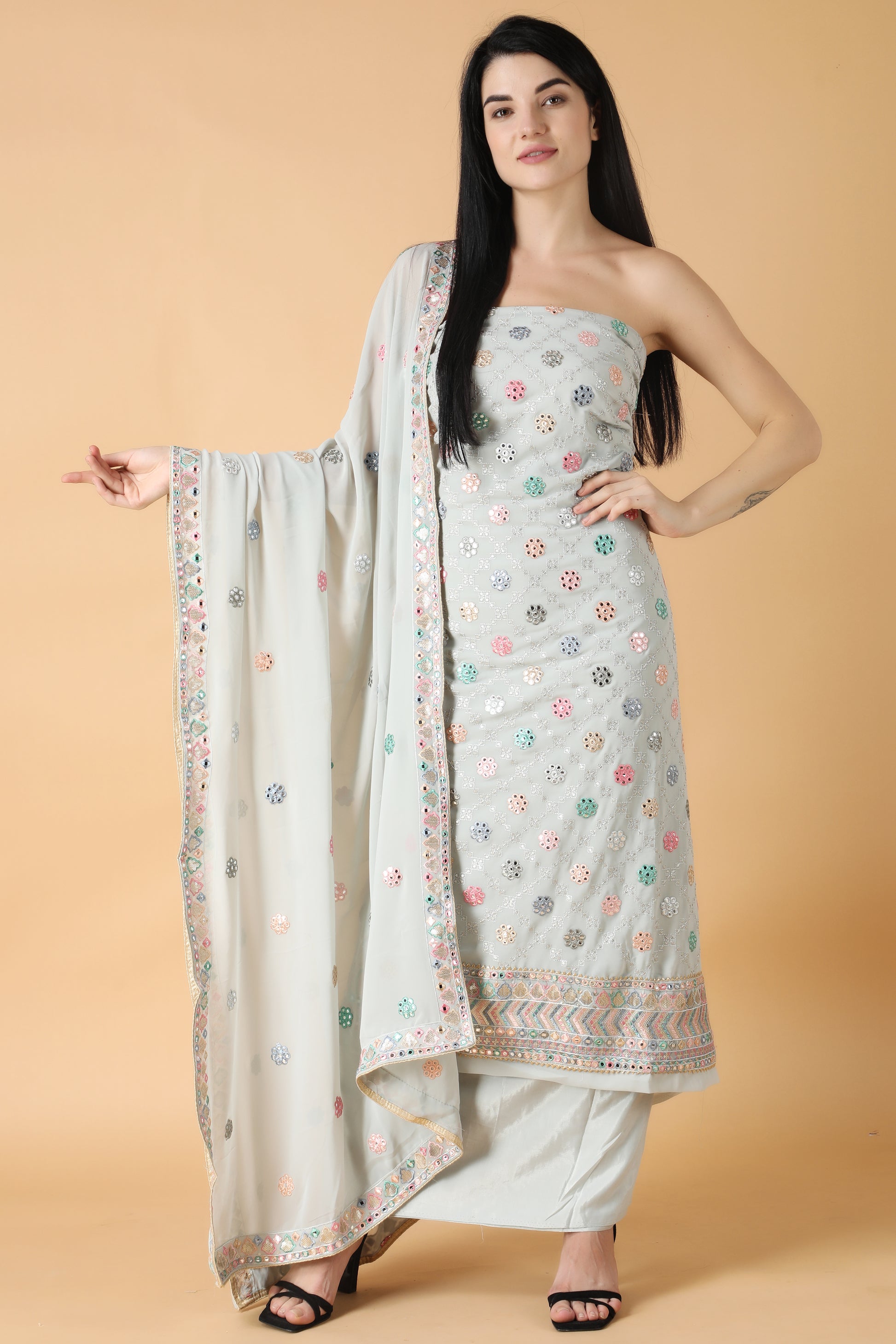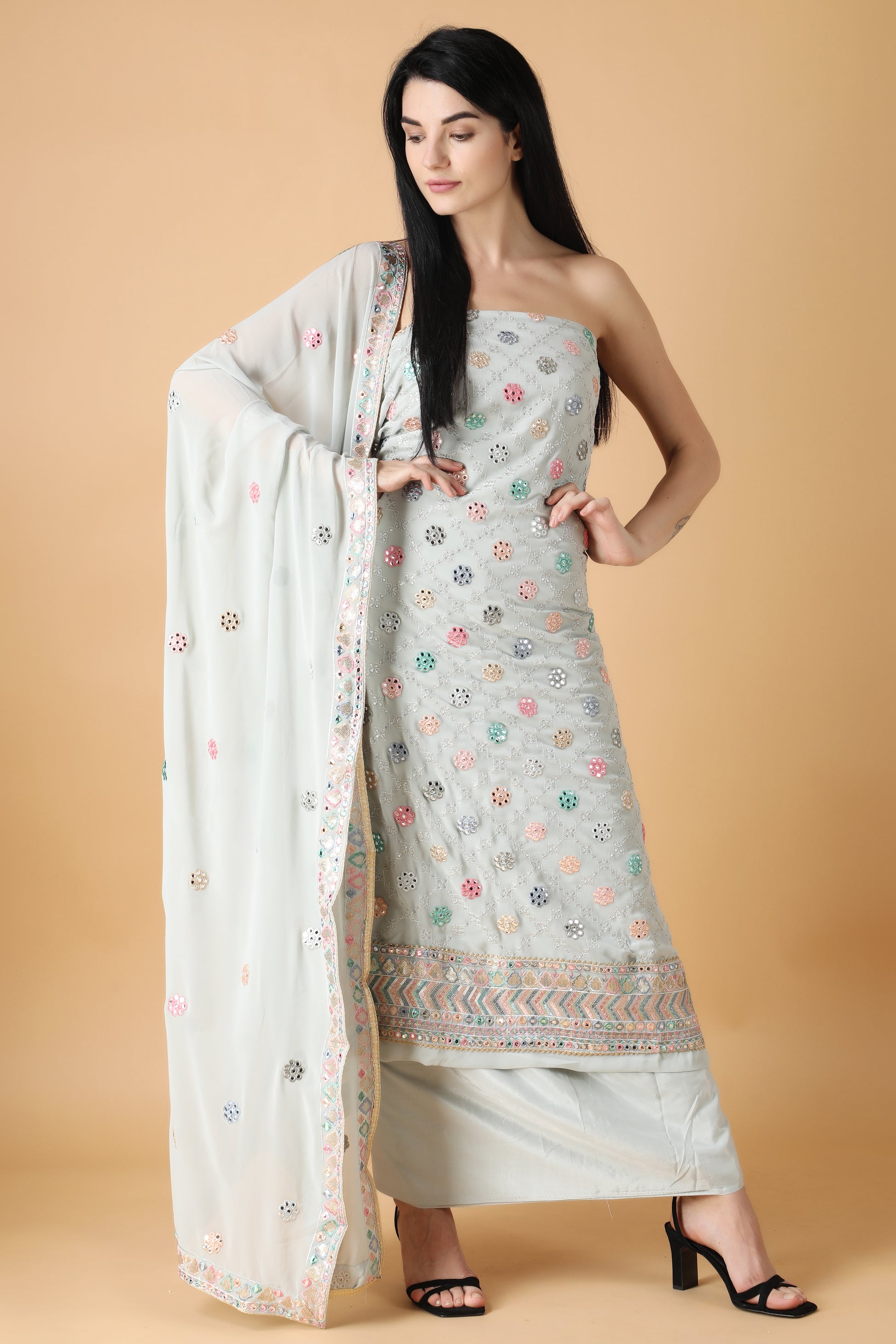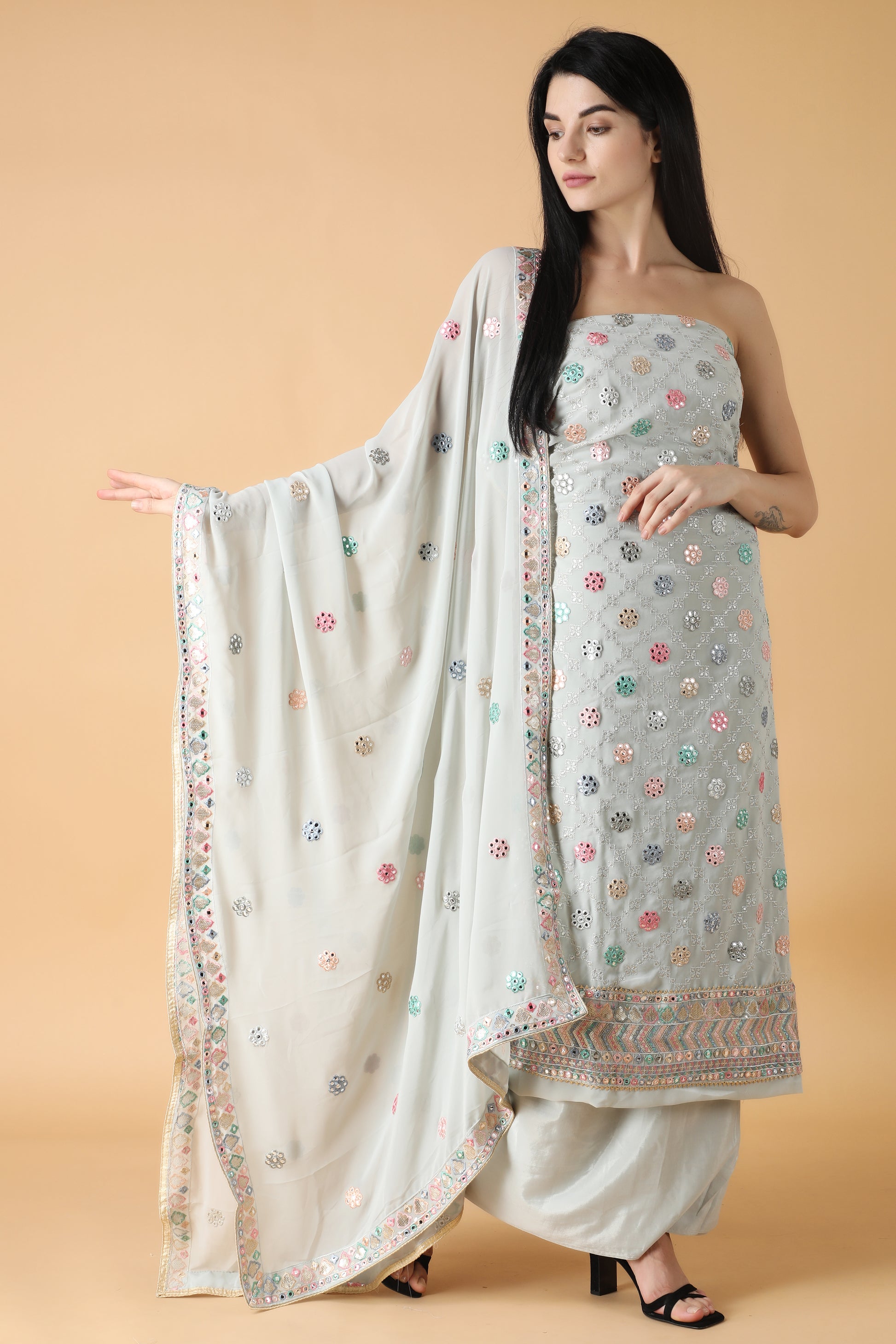 - The unstitched salwar suit is elevated with Sequin work and mirror work all over