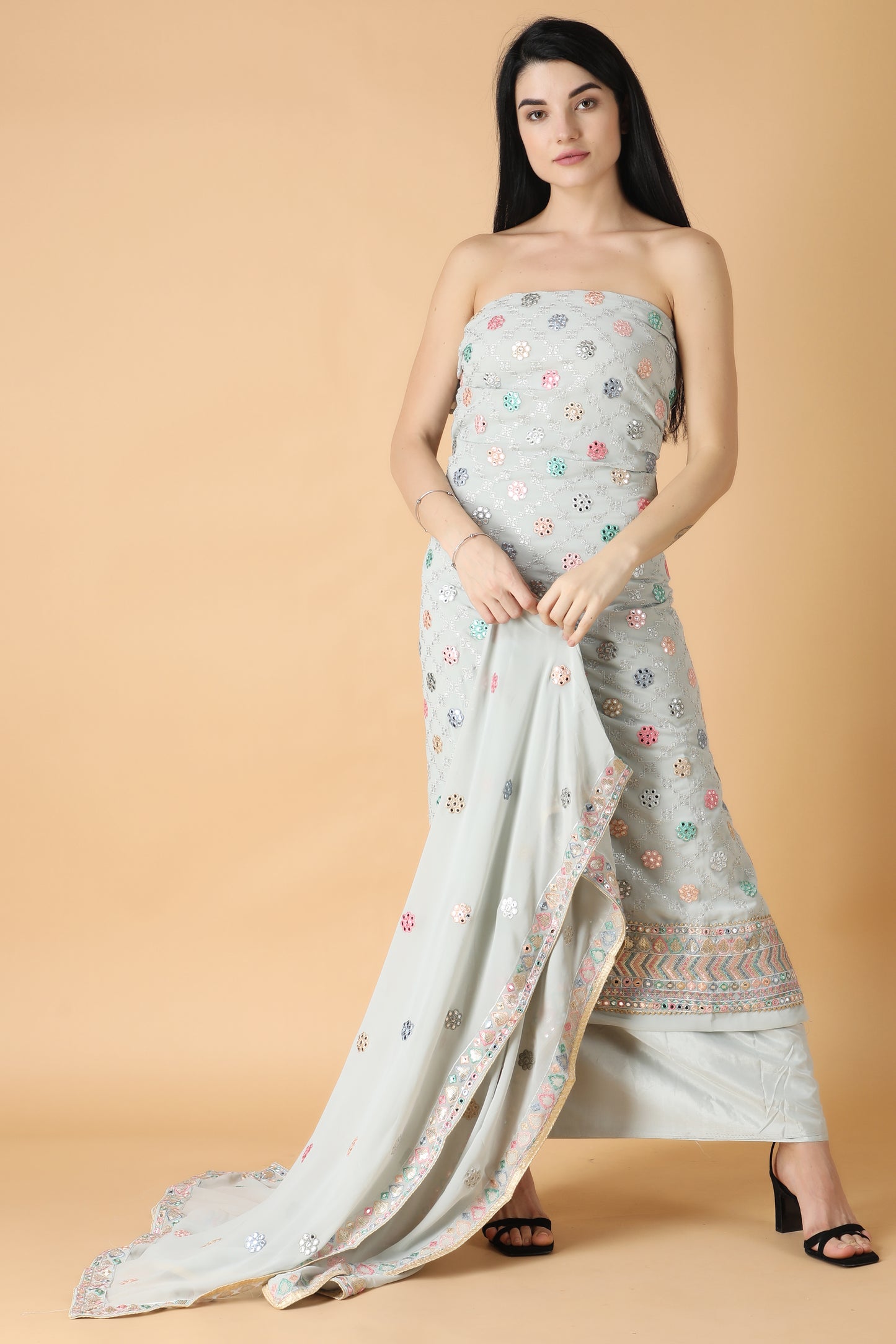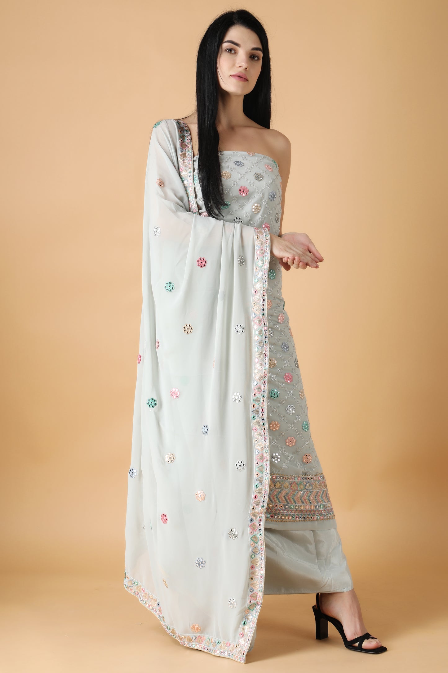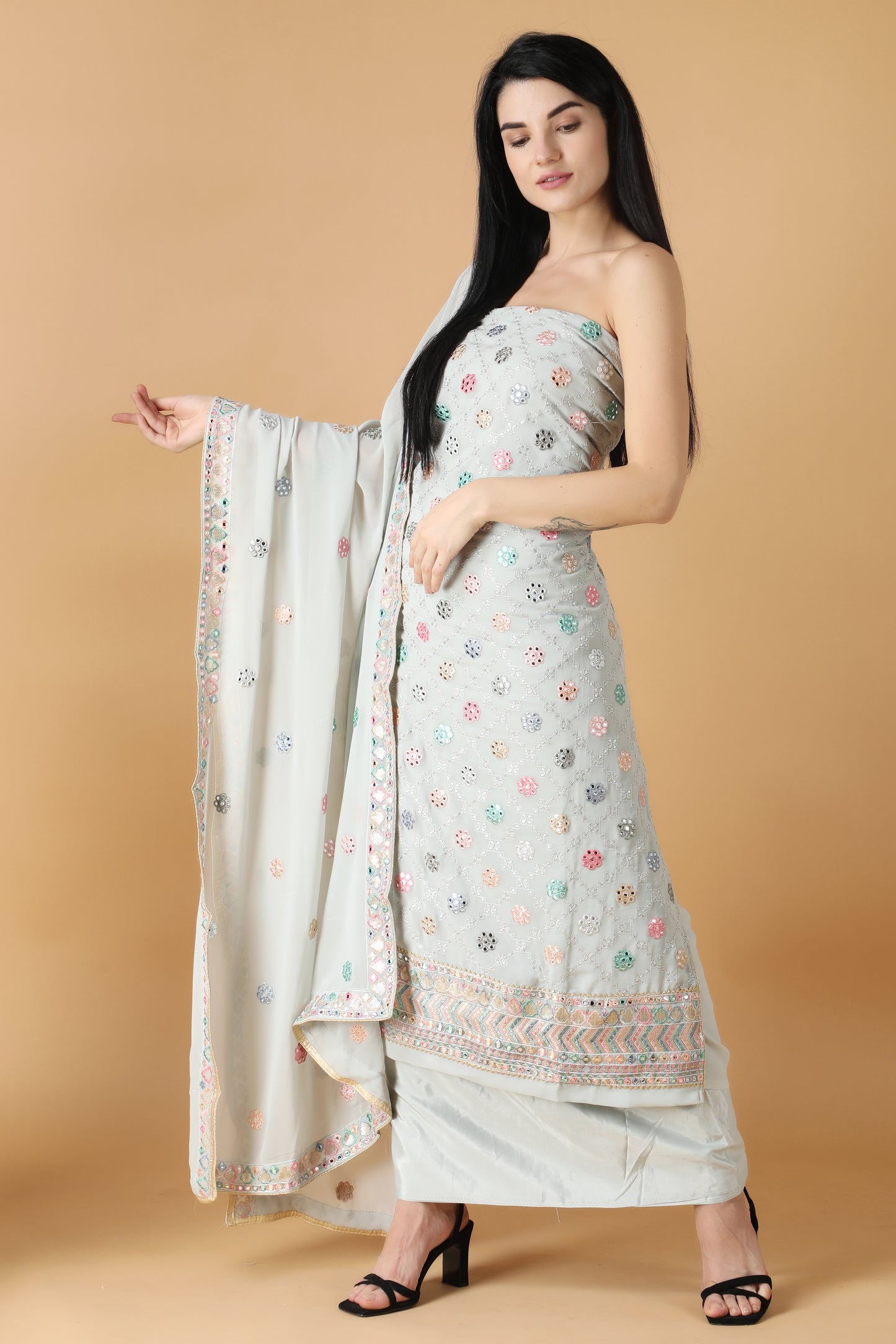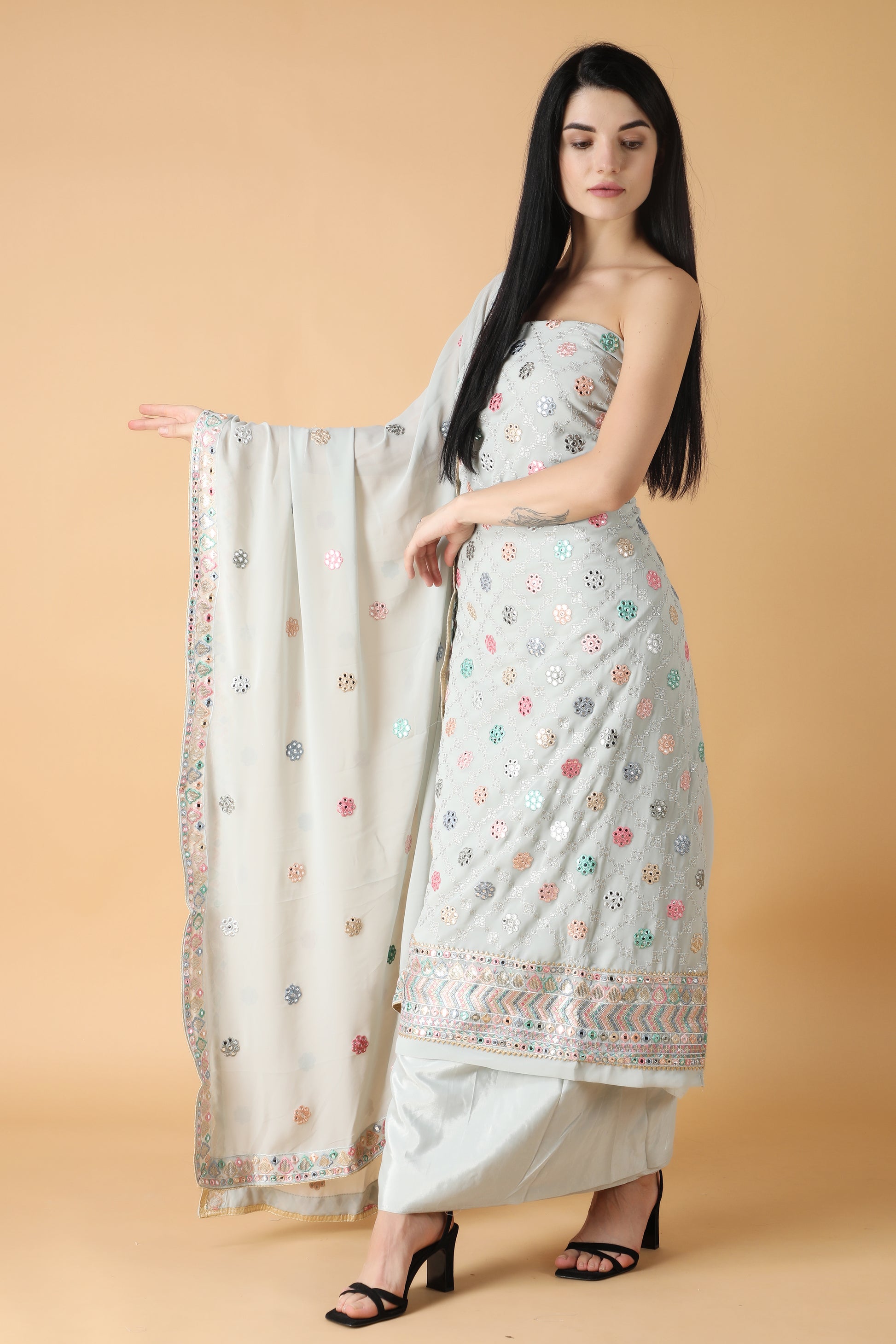 - The unstitched salwar suit is elevated with Sequin work and mirror work all over