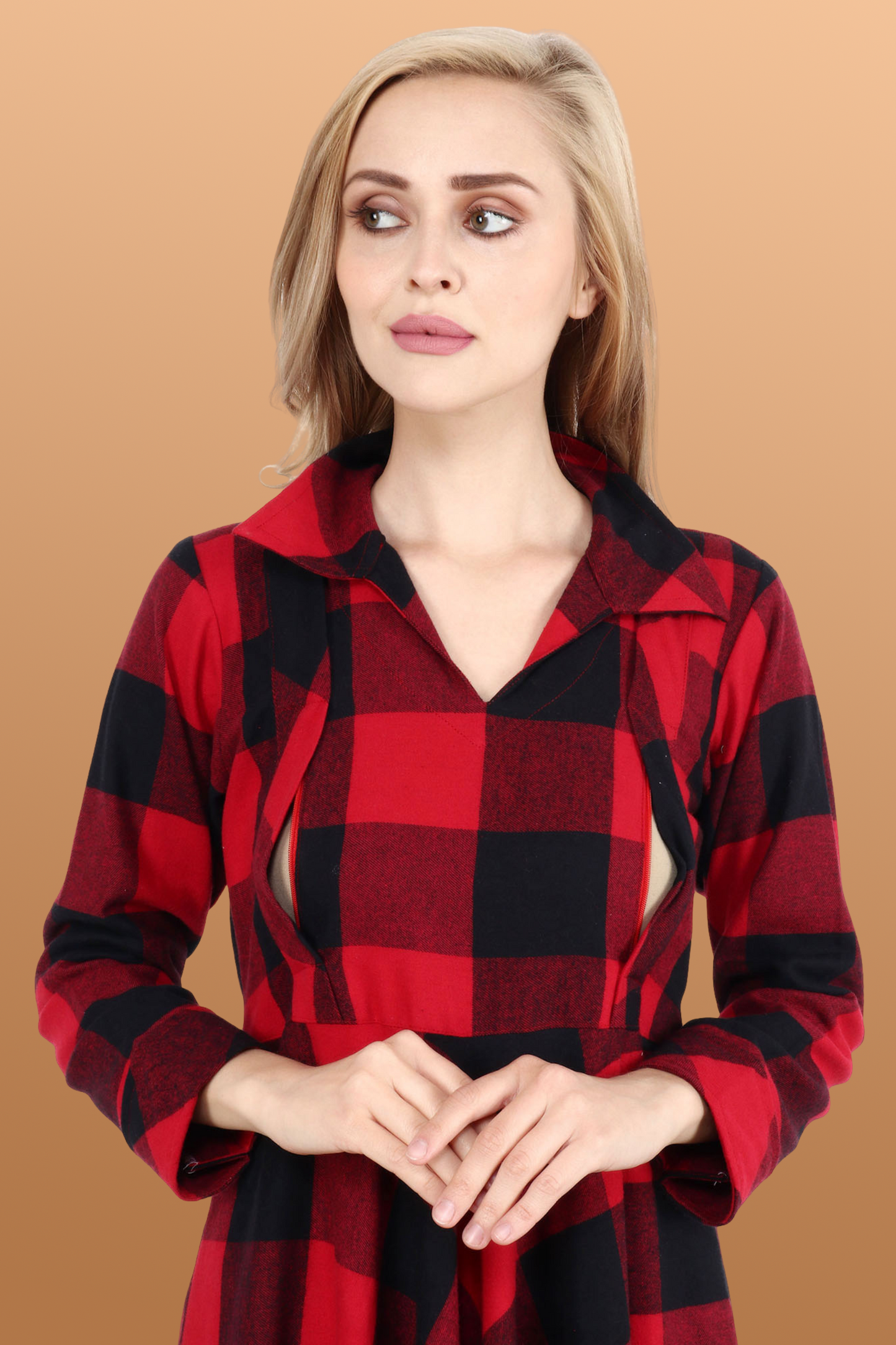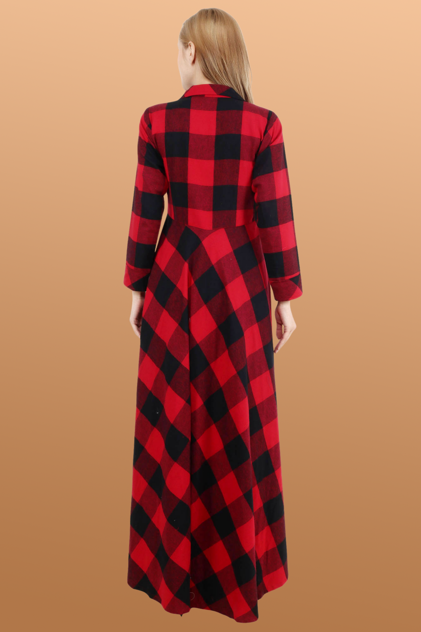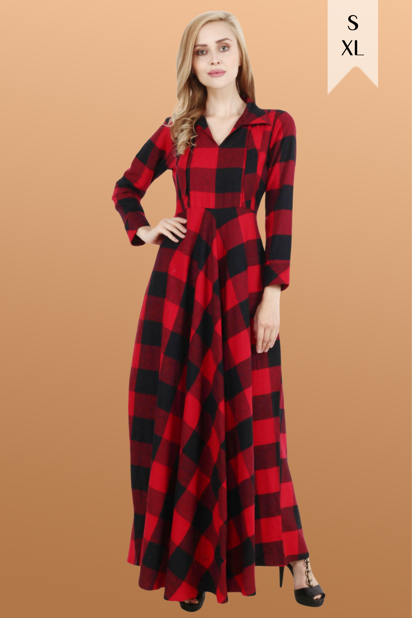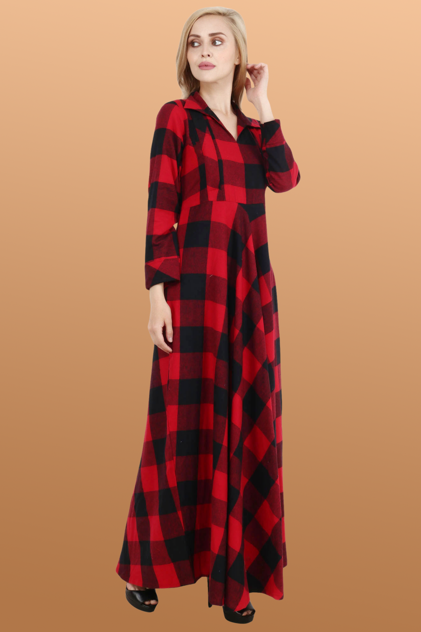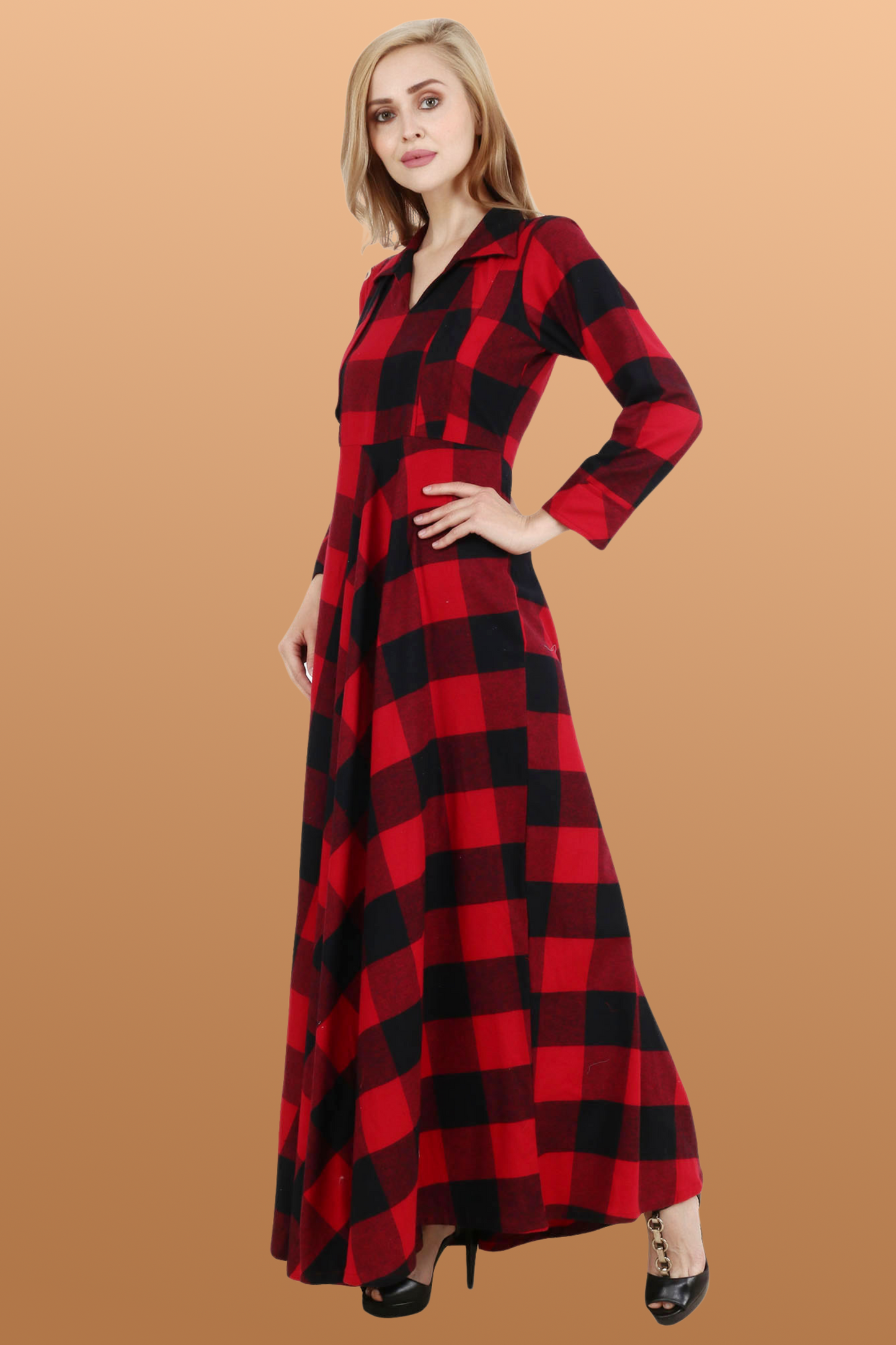 Gear up your sassy look with this dress crafted with fine Brushed Cotton. The dress has a checked print all over and full sleeves. The comfortable collar Neck ensures that you stay at your most comfortable self. The ankle length dress is all flared up for a gorgeous look and comes with pockets.