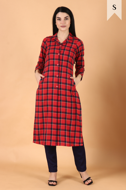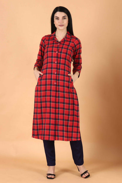 Look your ethnic best as you head out wearing this Red Collar neck Checked kurta. Crafted using the finest Brushed Cotton fabrics, full button placket and with side pockets, this apparel makes up for the utmost comfort when adorned.