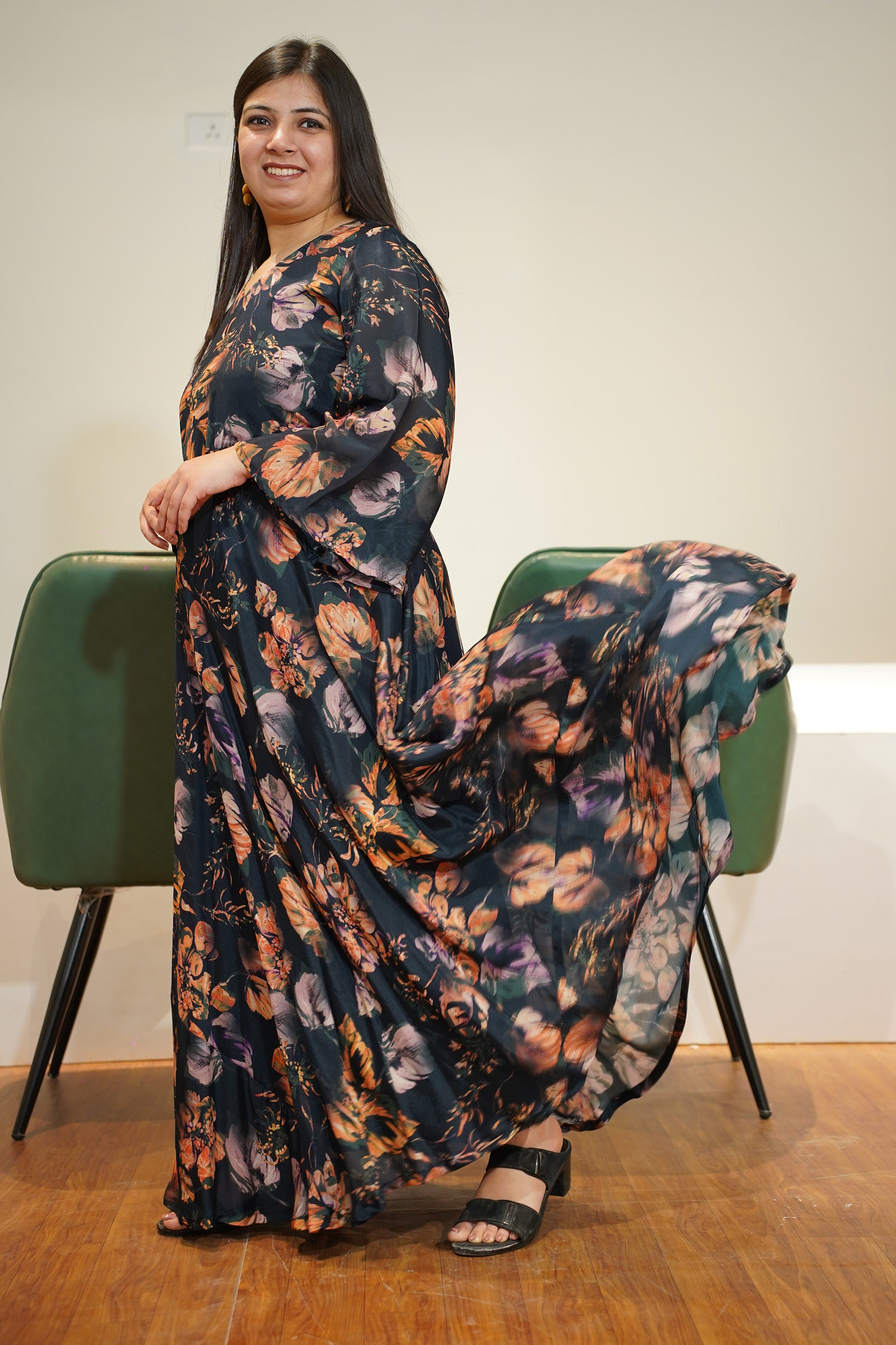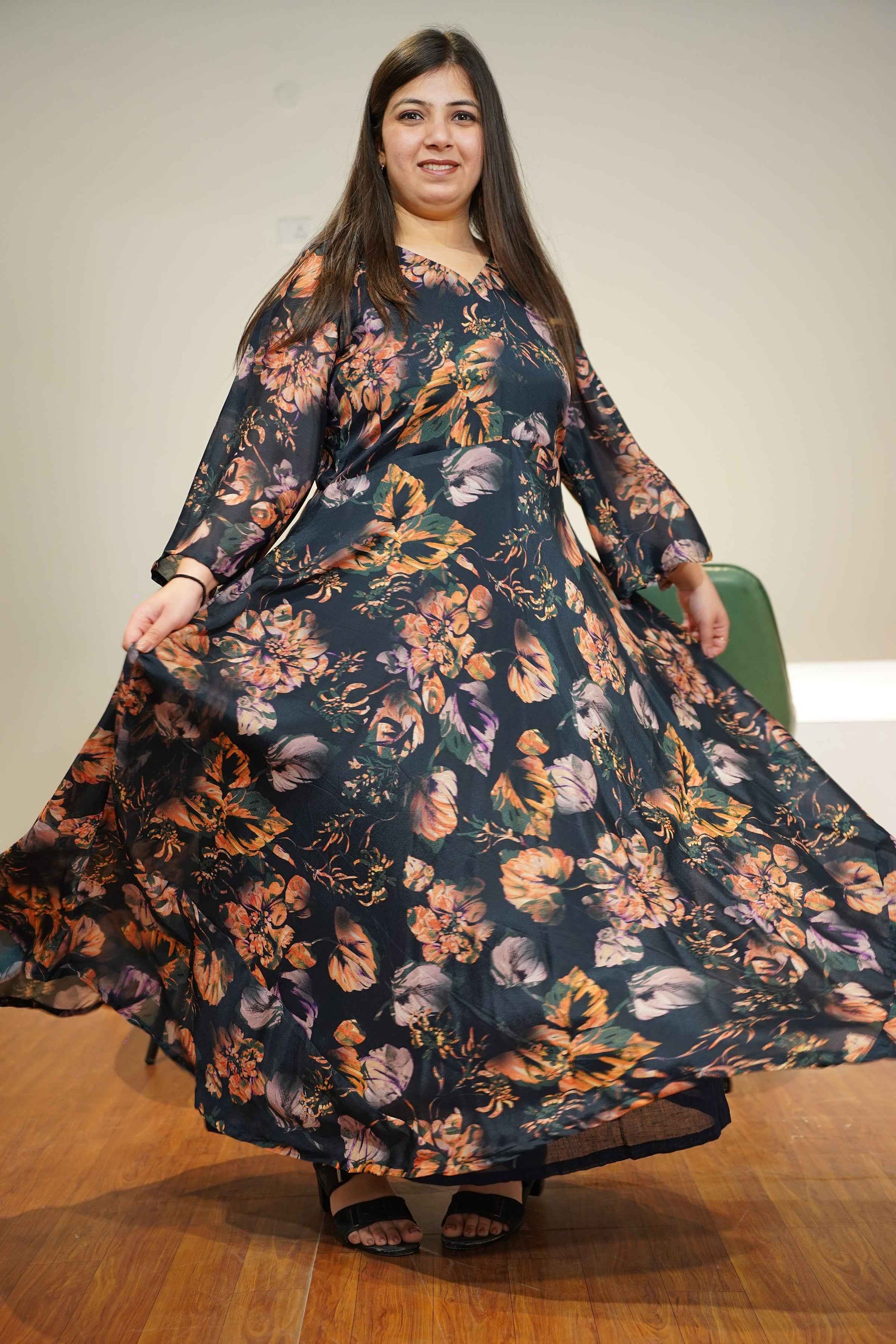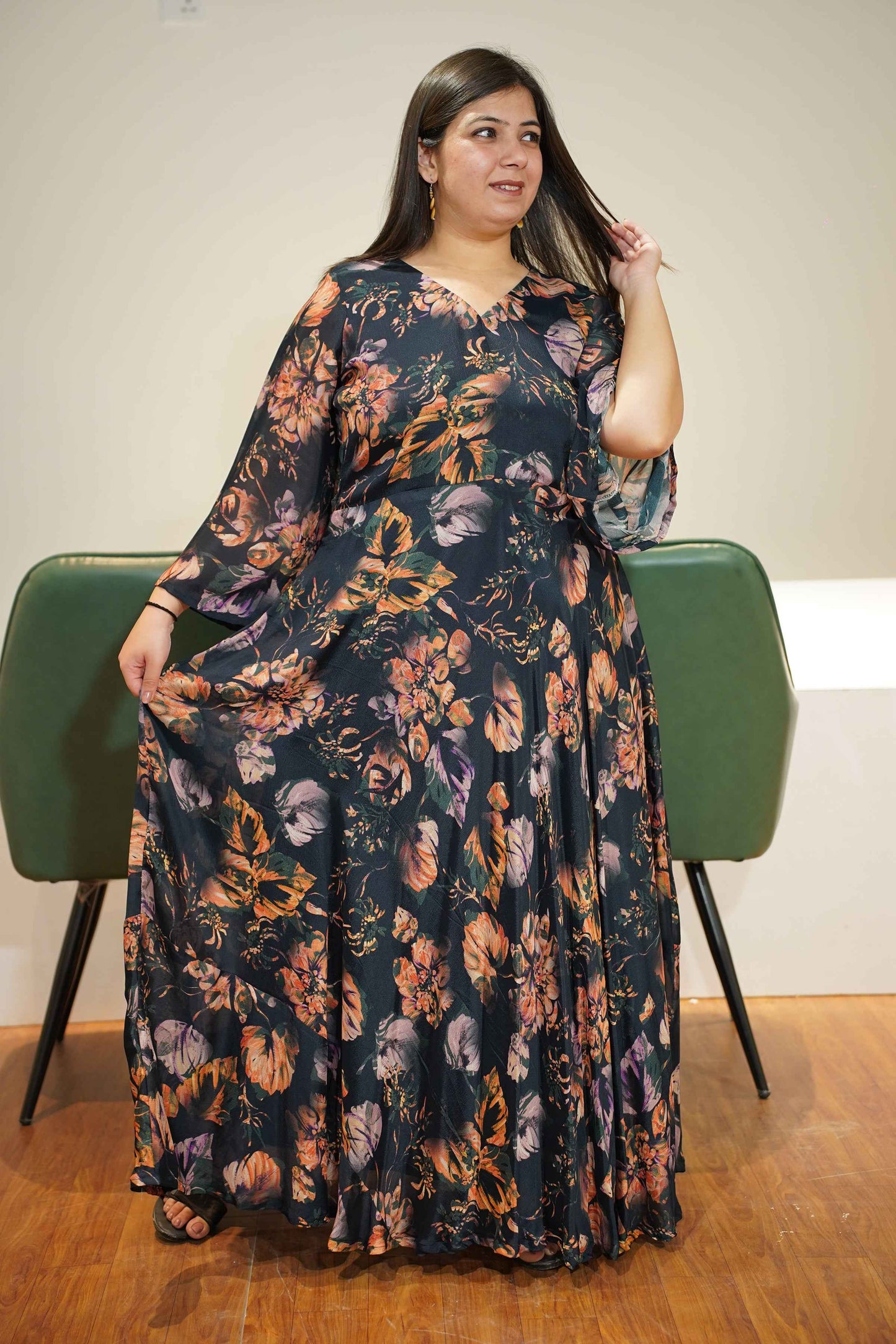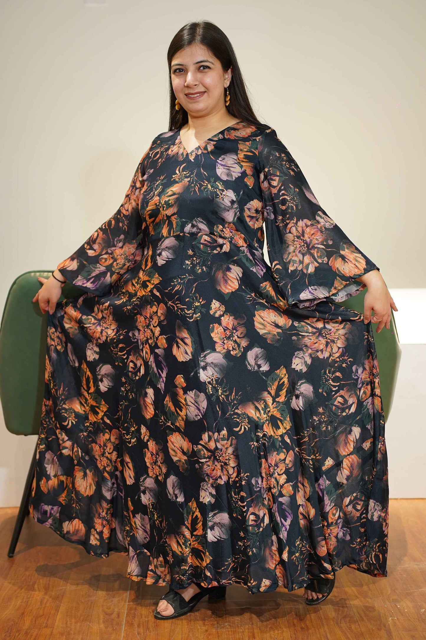 - Flowy floor-length silhouette for a graceful look